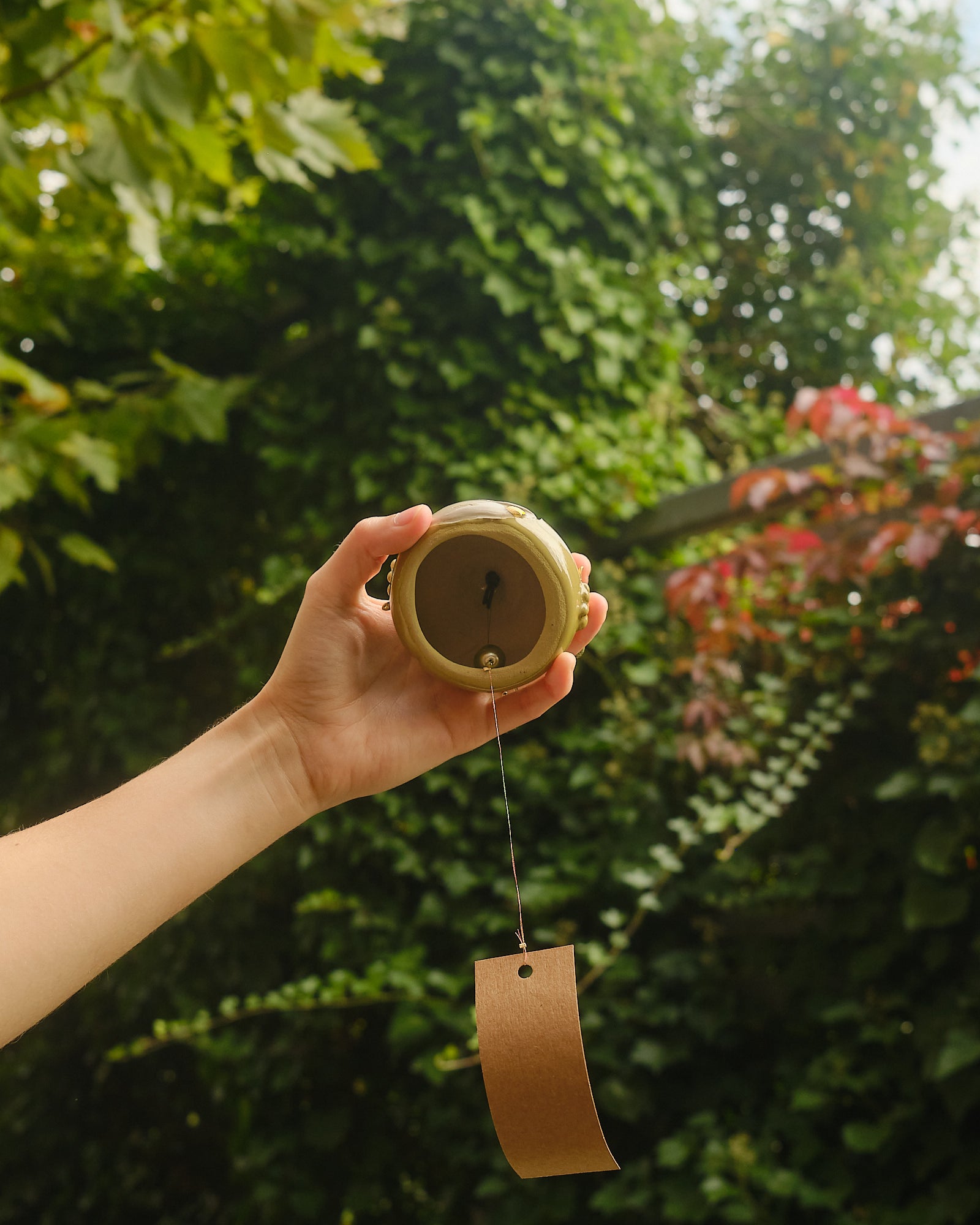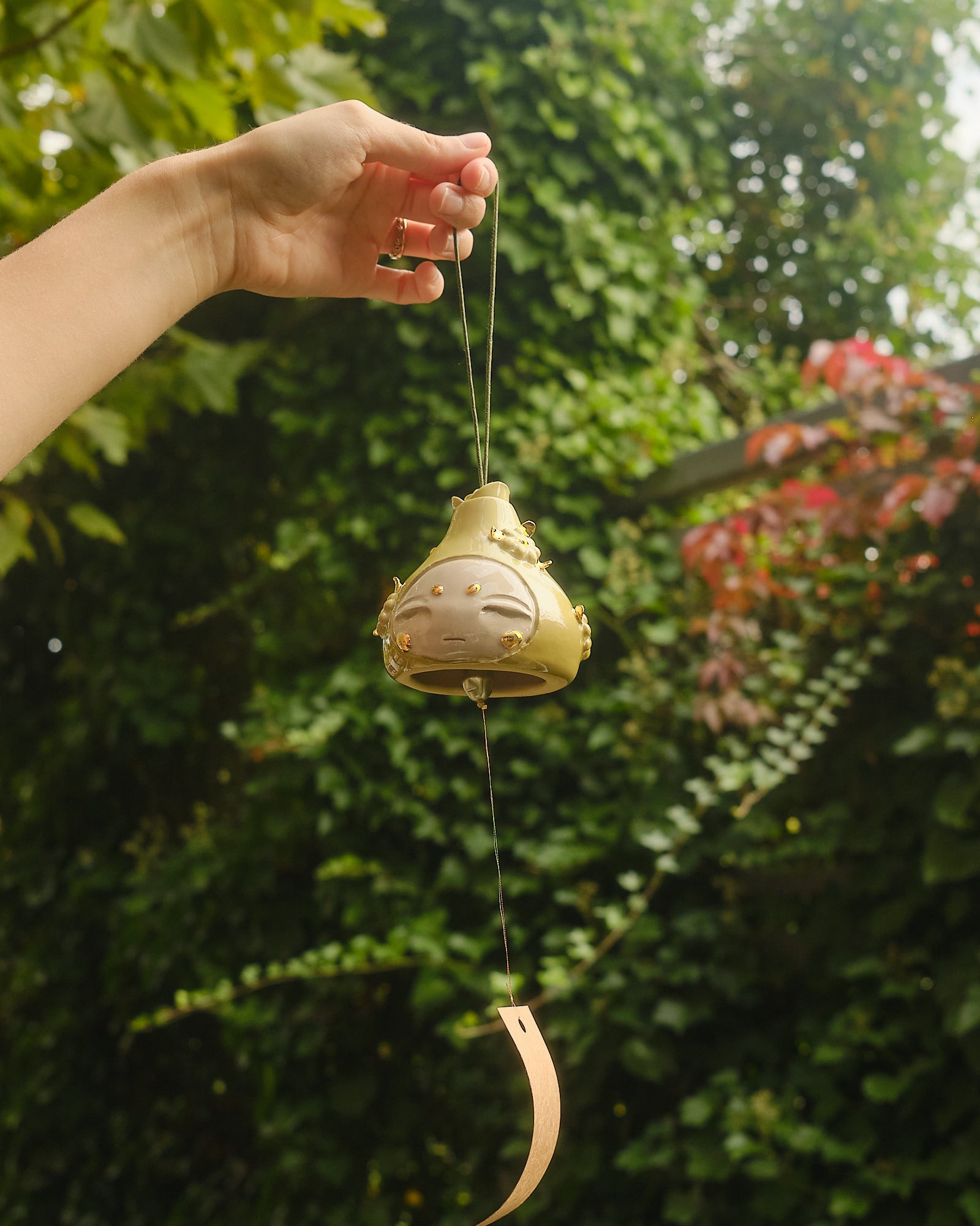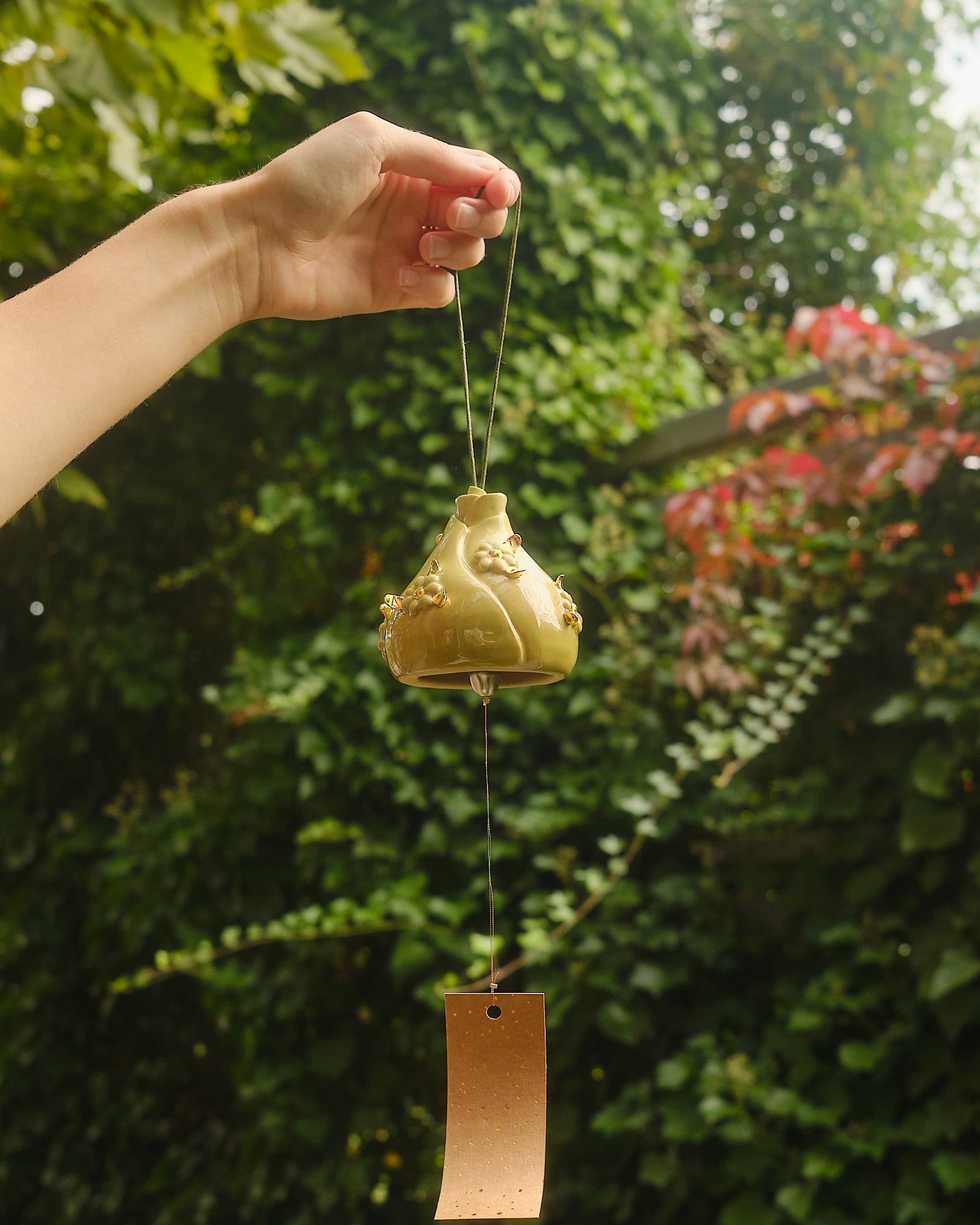 Soft green gradient, hand sculpted stoneware wind chime embellished in 24k gold lustre details. The paper catches the wind, creating a gentle soothing bell sound. Handle with care.