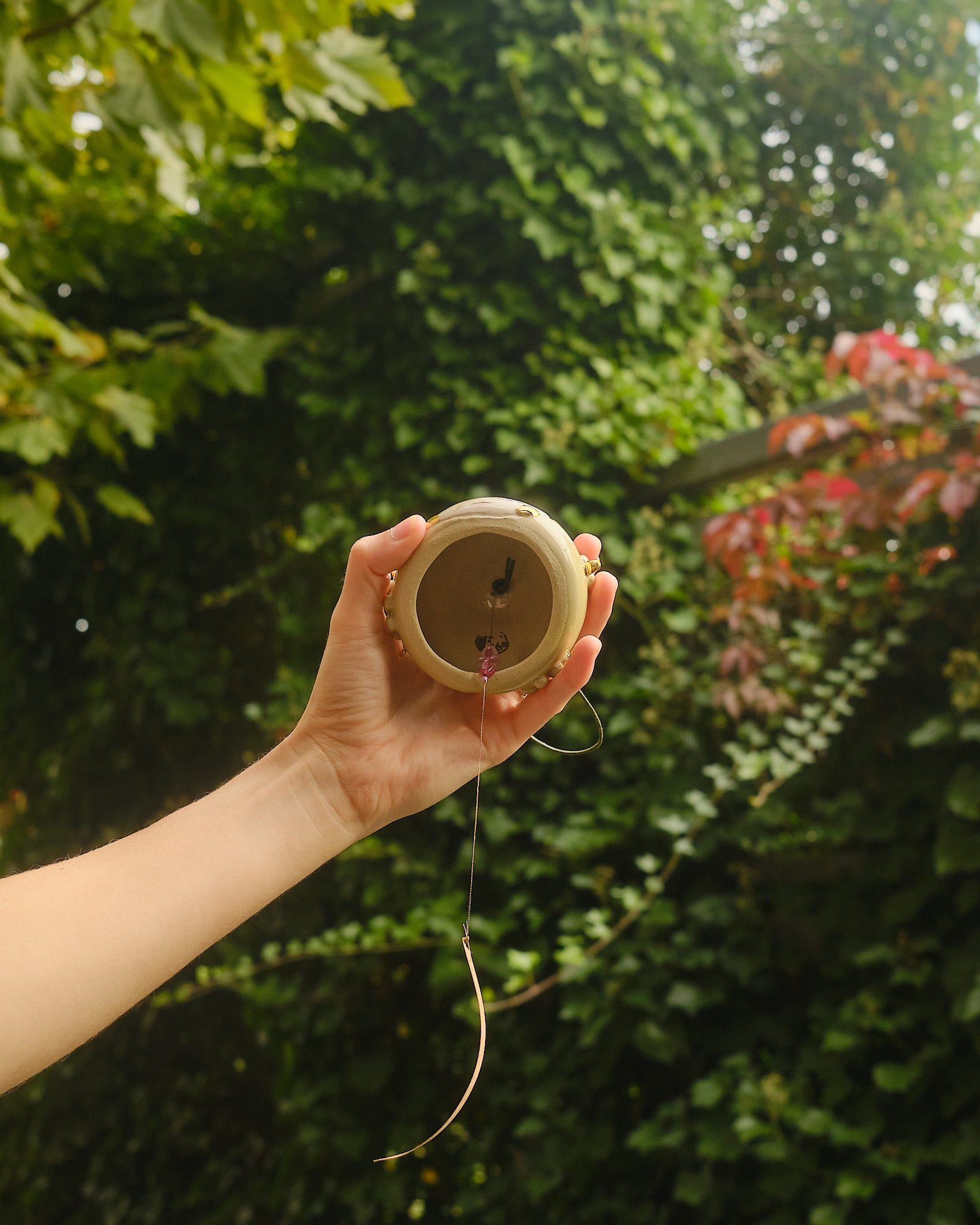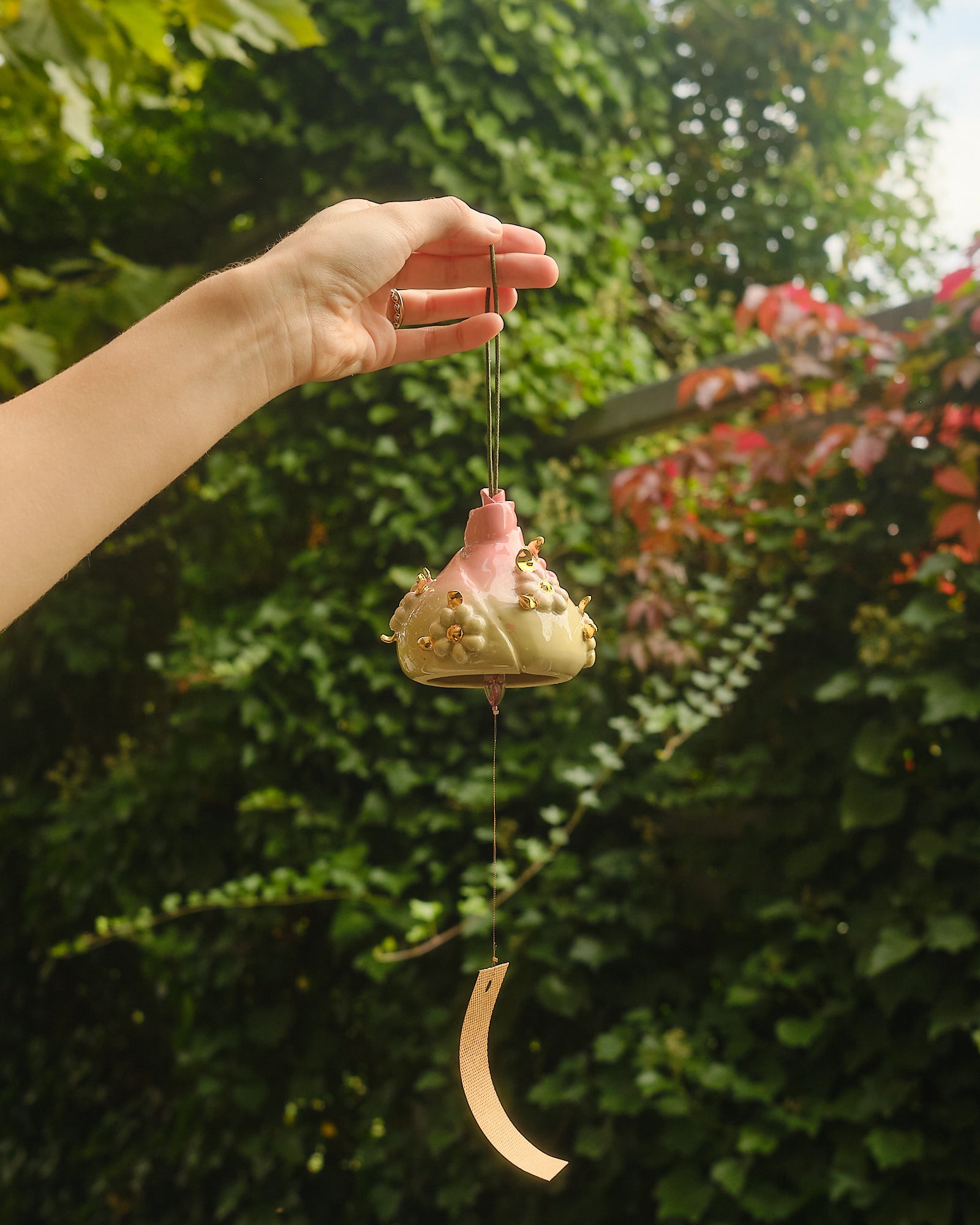 Pink to green gradient, hand sculpted stoneware wind chime embellished in 24k gold lustre details. The paper catches the wind, creating a gentle soothing bell sound. Handle with care.