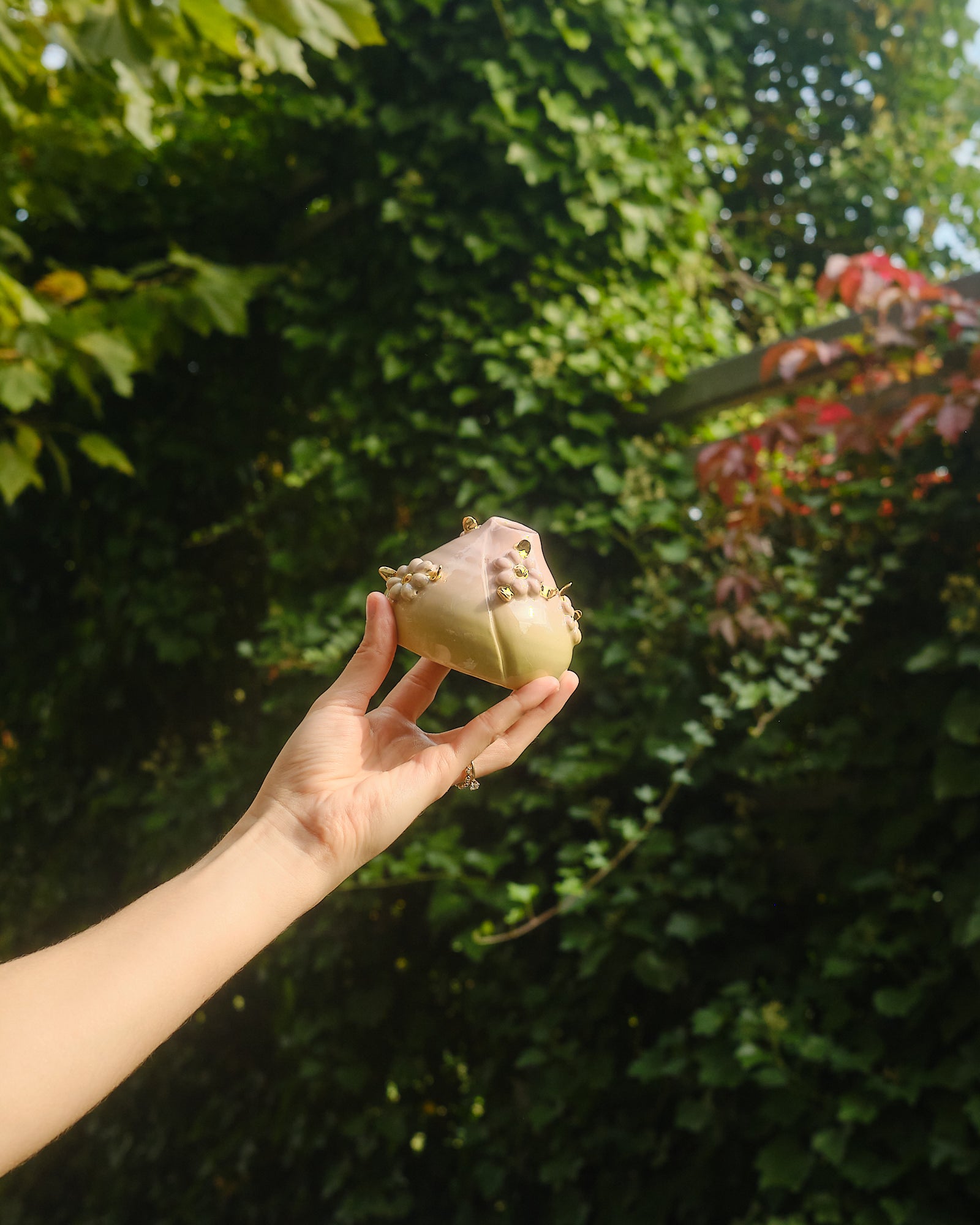 This dainty little flower puff has a soft pink to green gradient, it reminds me of the spring. Hand sculpted stoneware bud vase embellished in 24k gold lustre details.