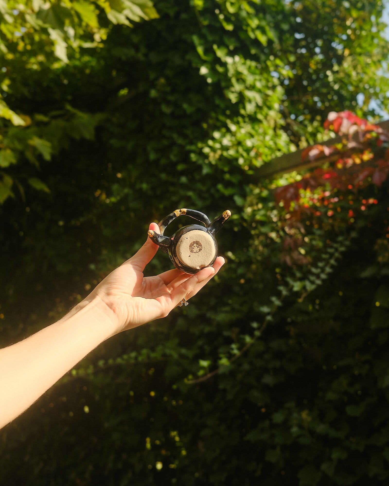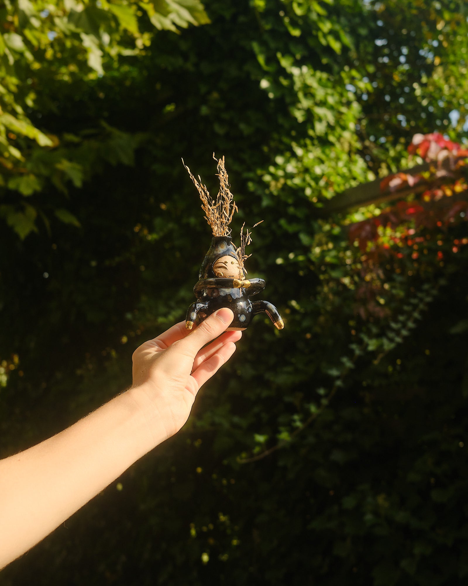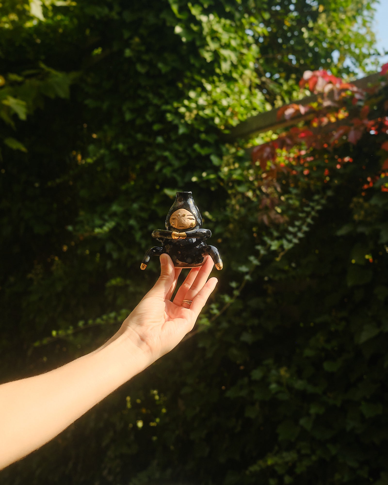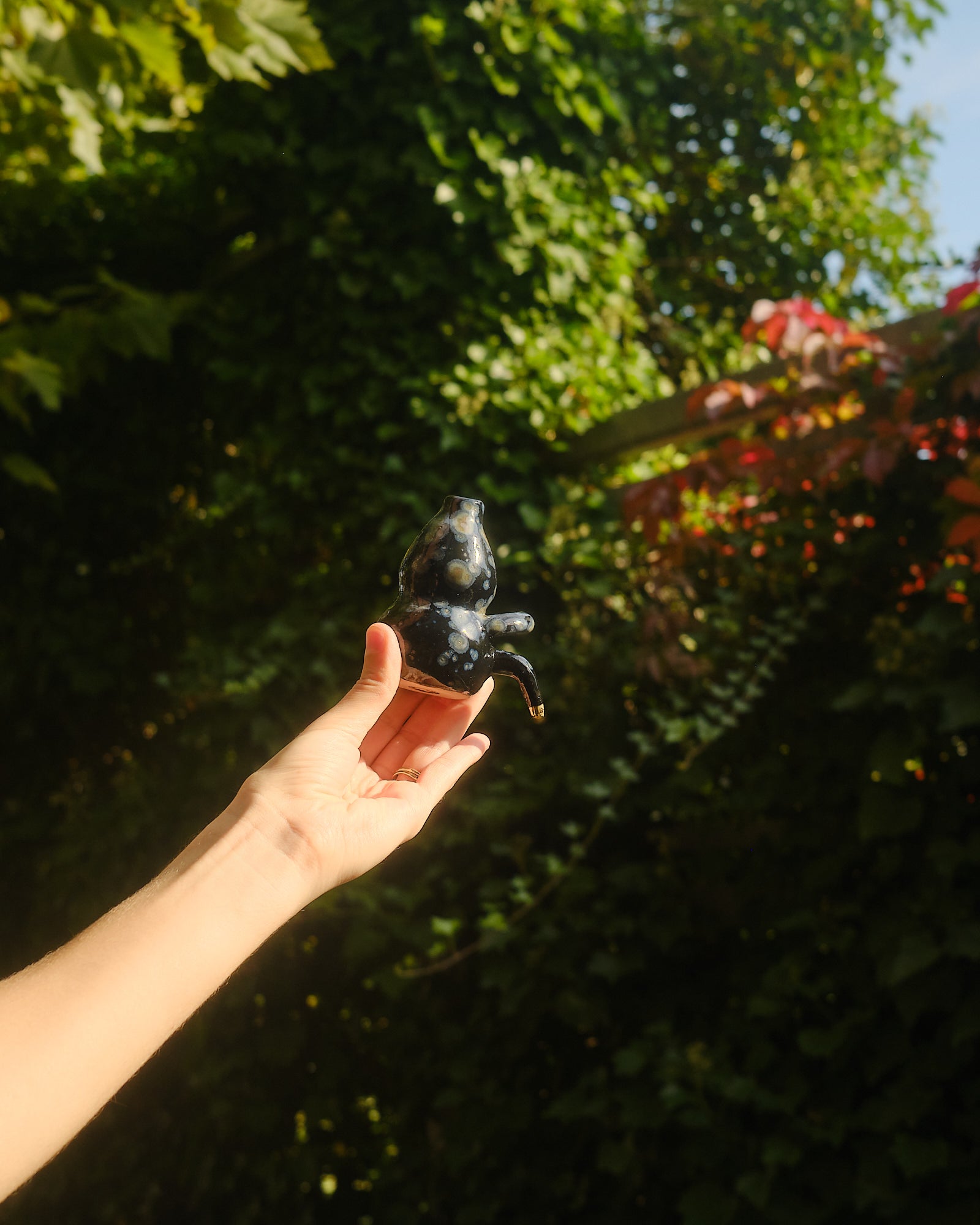 A natural protector of the flora. Doesn't ever say much, but it's presence is soothing. Hand sculpted stoneware bud vase embellished in starry 24k gold lustre details.