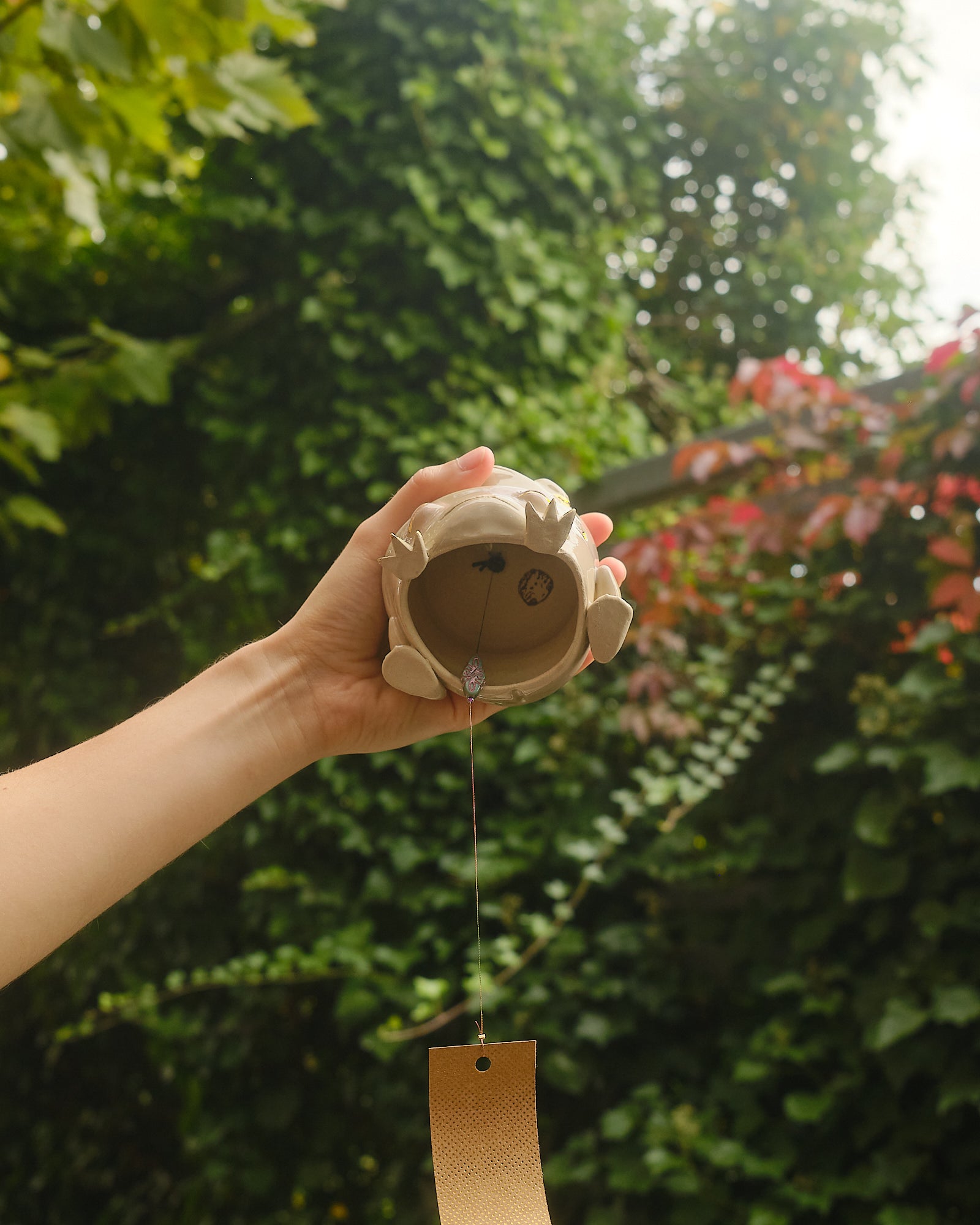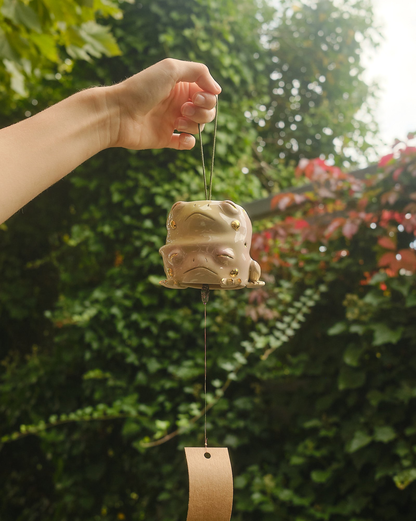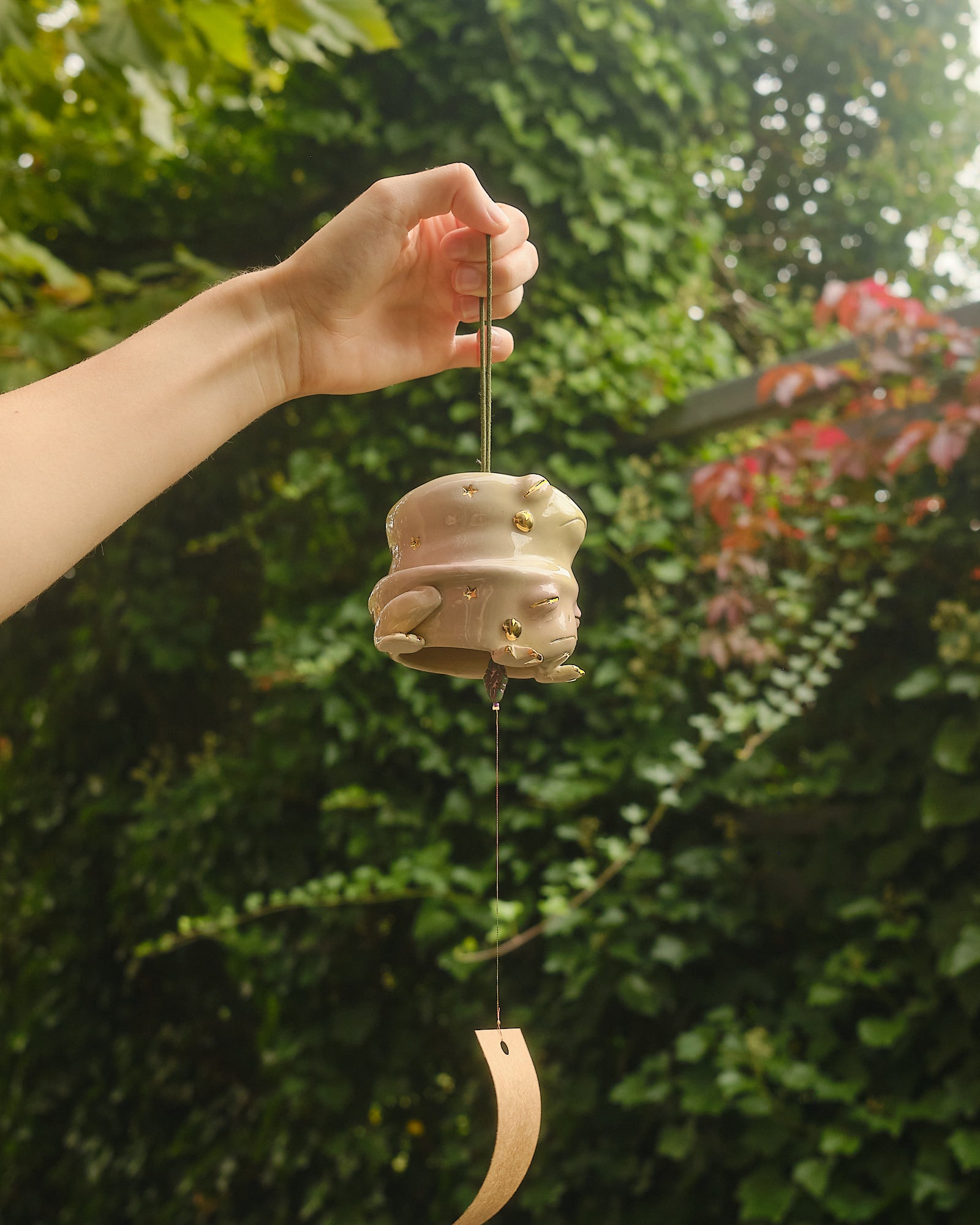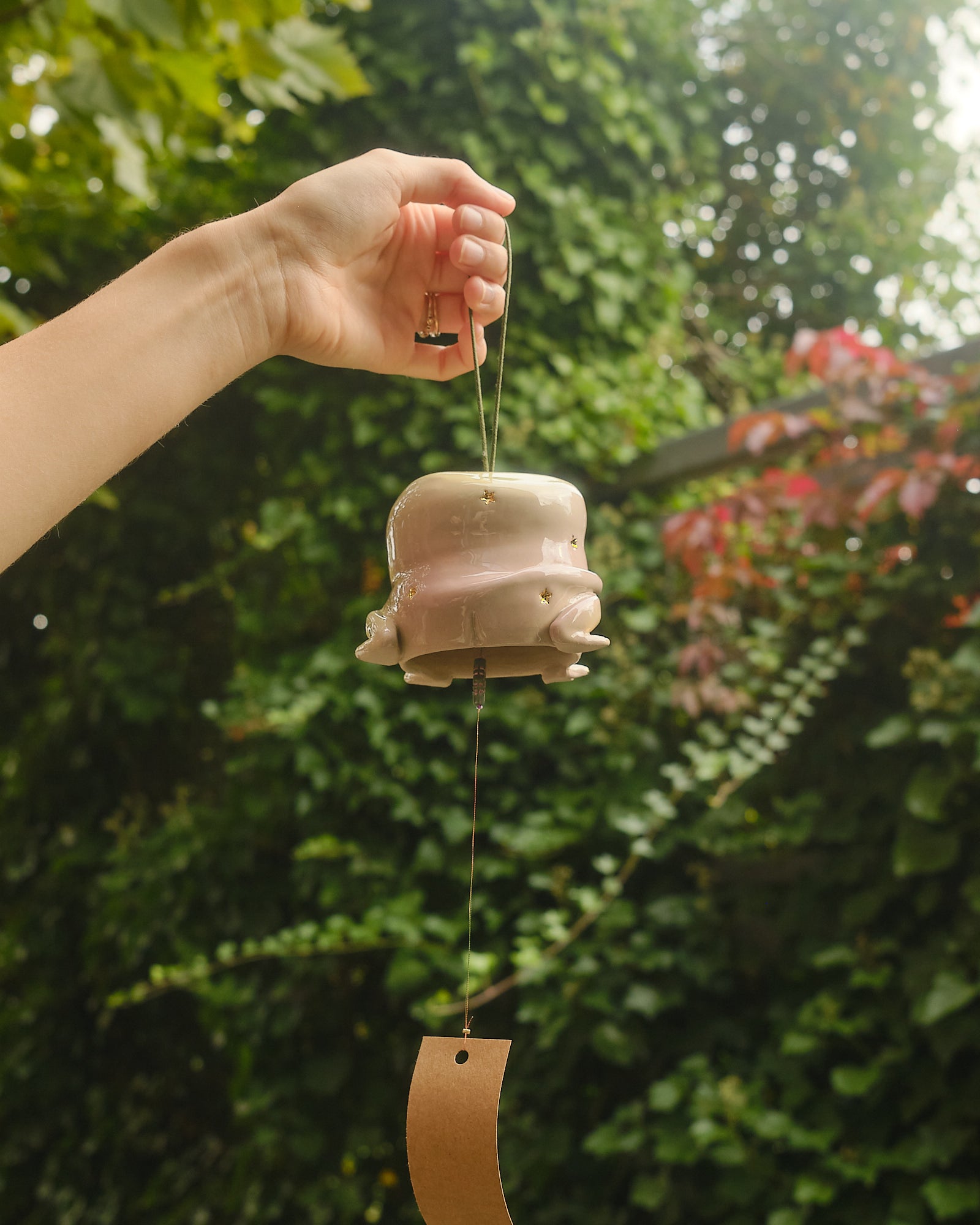 Lilac and green gradient, hand sculpted stoneware wind chime embellished in 24k gold lustre details. The paper catches the wind, creating a gentle soothing bell sound. Handle with care.