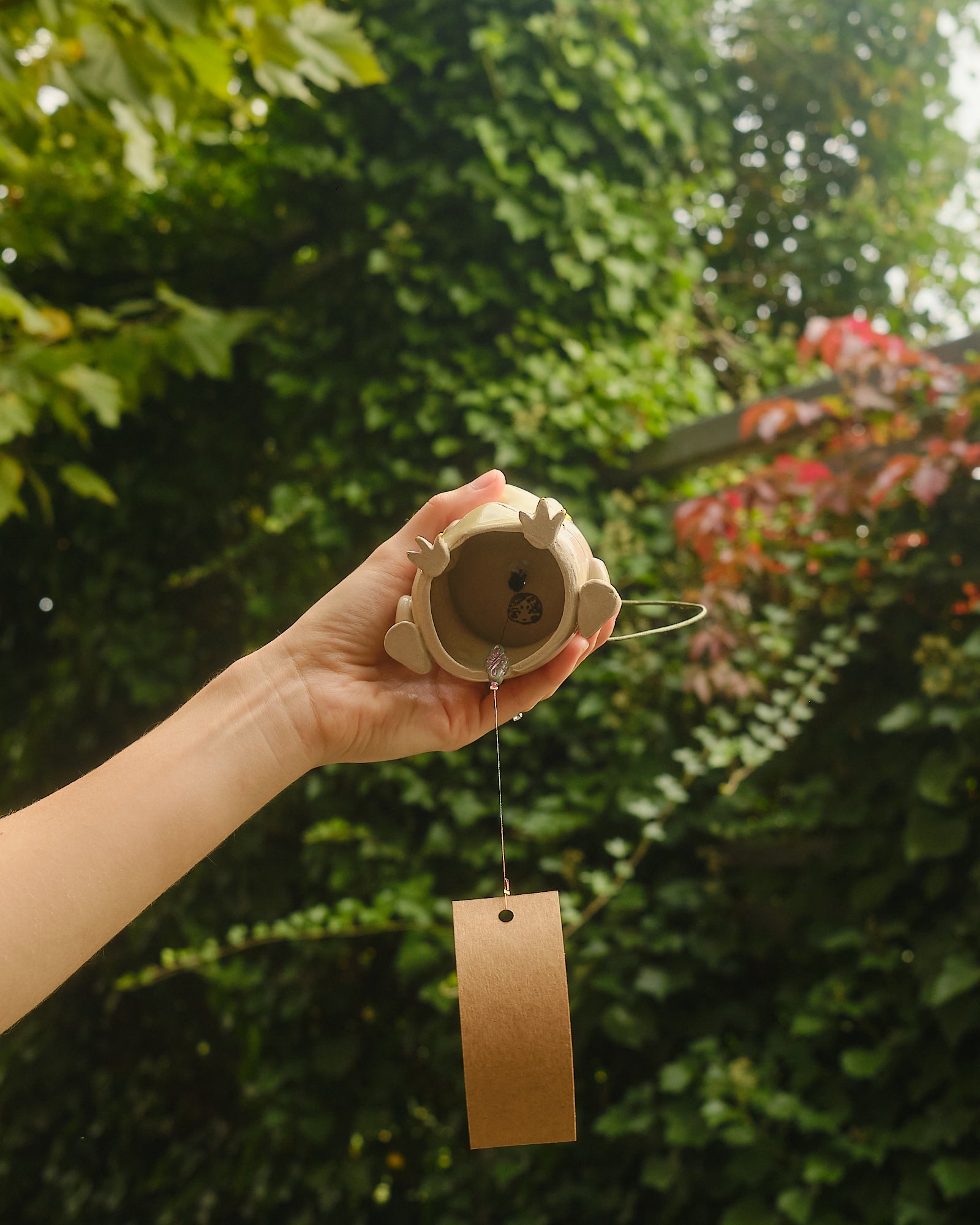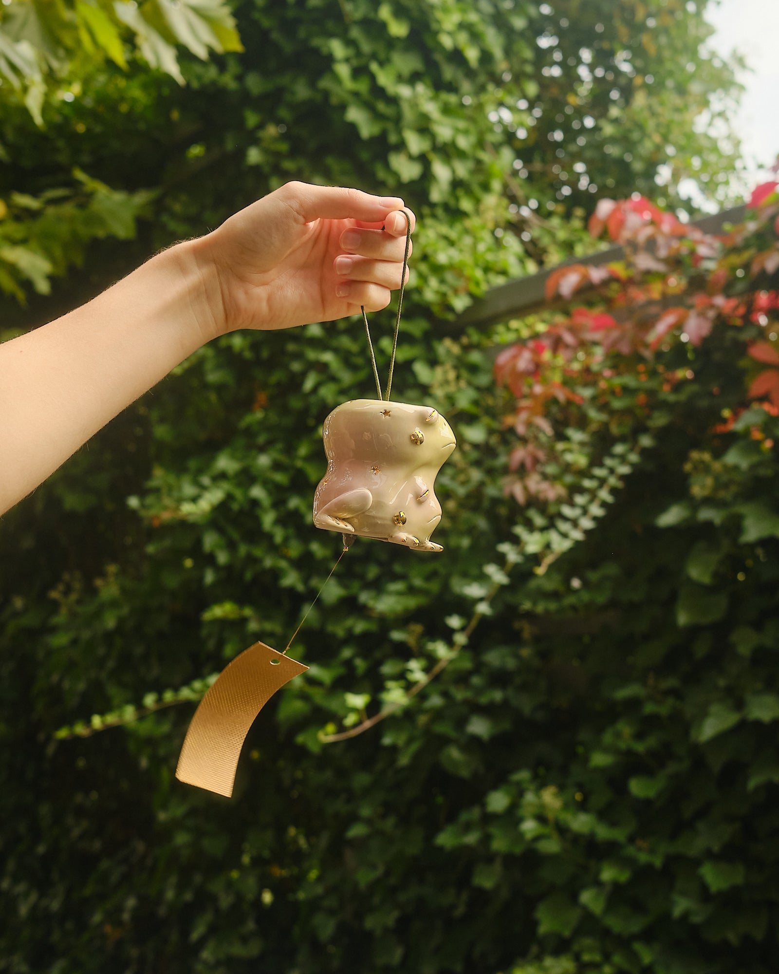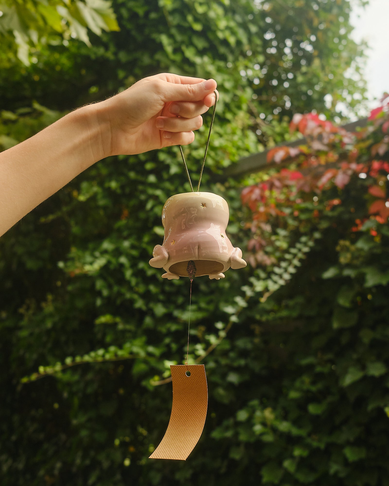 Lilac and green gradient, hand sculpted stoneware wind chime embellished in 24k gold lustre details. The paper catches the wind, creating a gentle soothing bell sound. Handle with care.