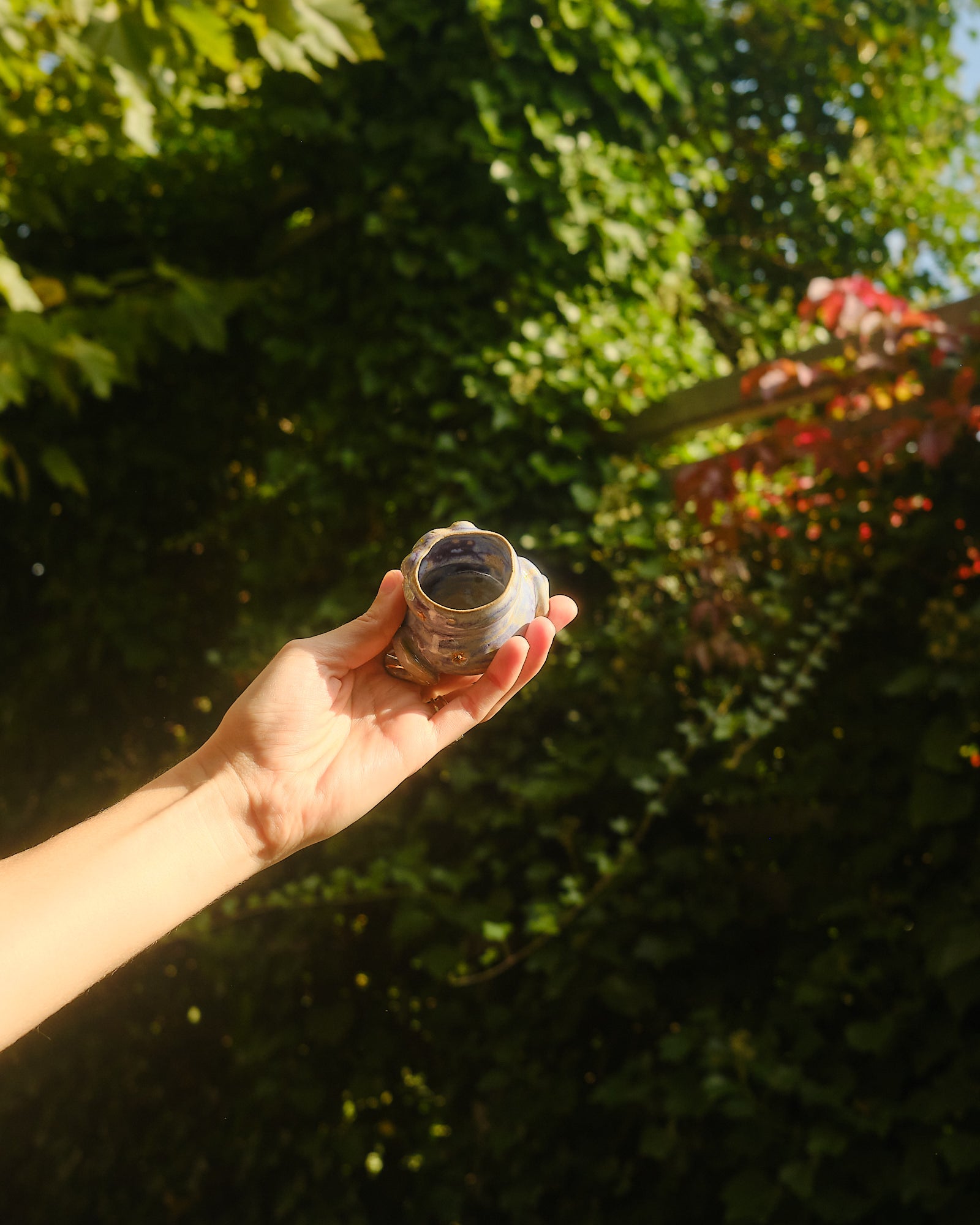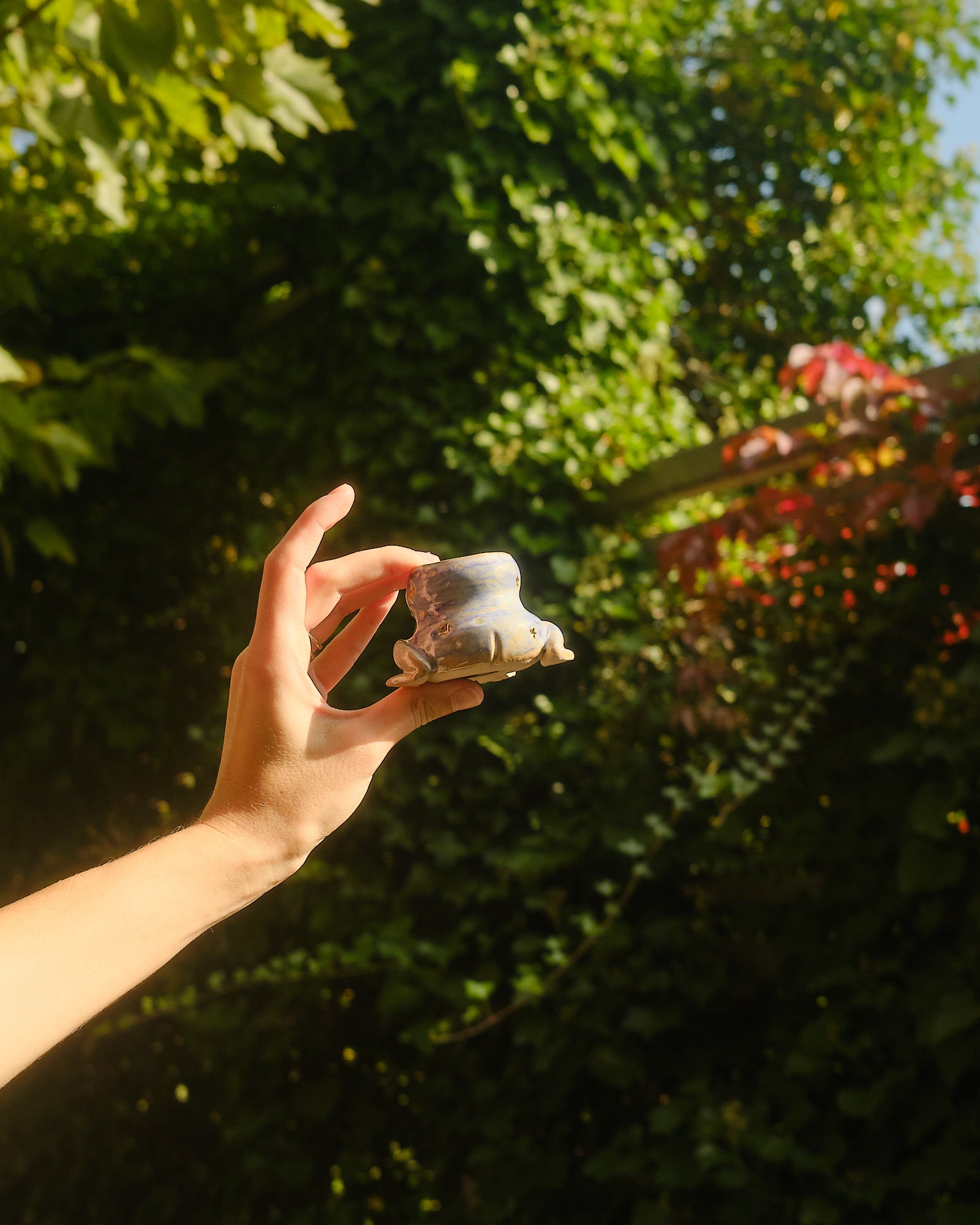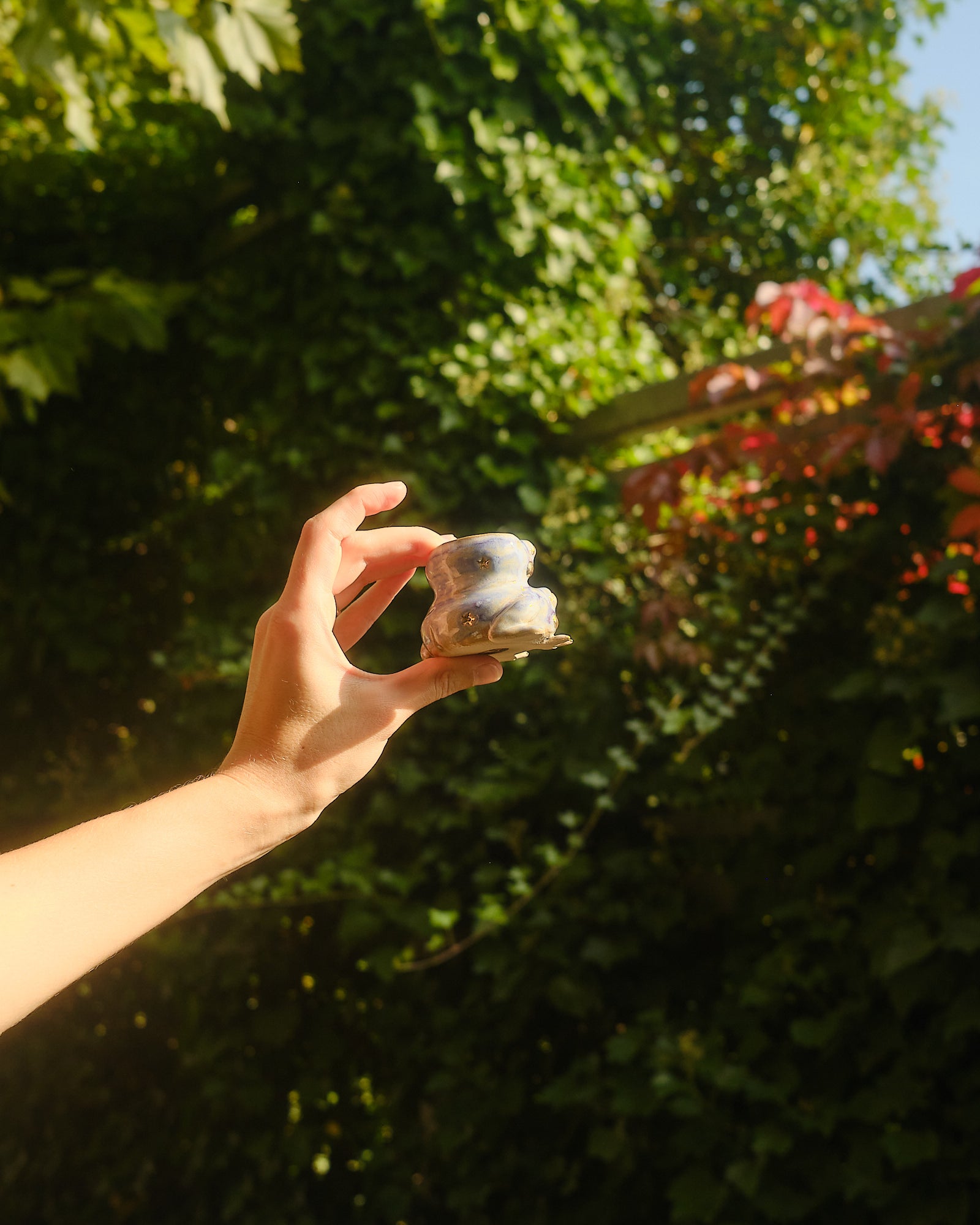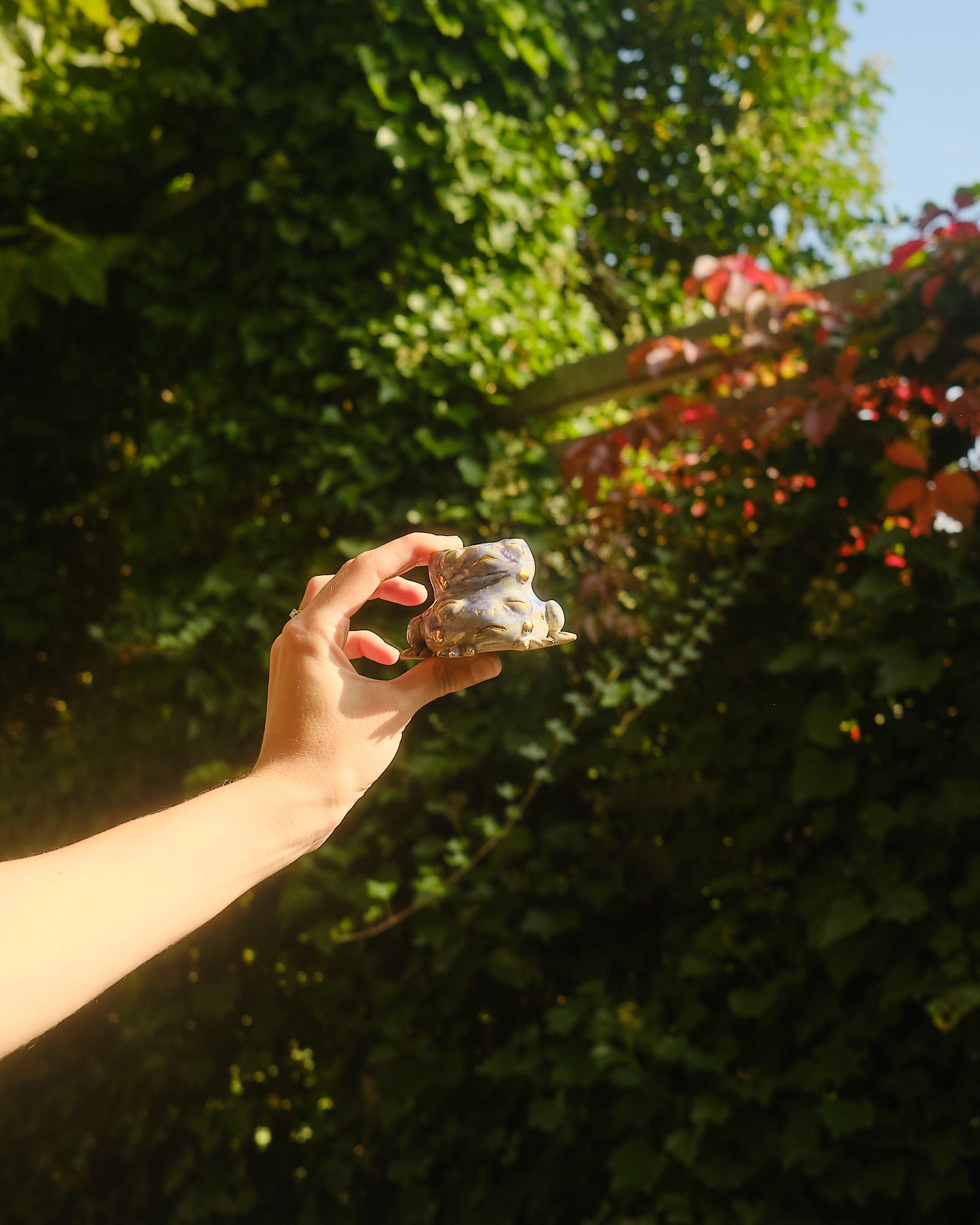 Ribbit! Double ribbit! This magical hopper comes with two heads and is hand sculpted out of stoneware clay. Finished in a gradient glaze with shiny 24k gold lustre starry details.