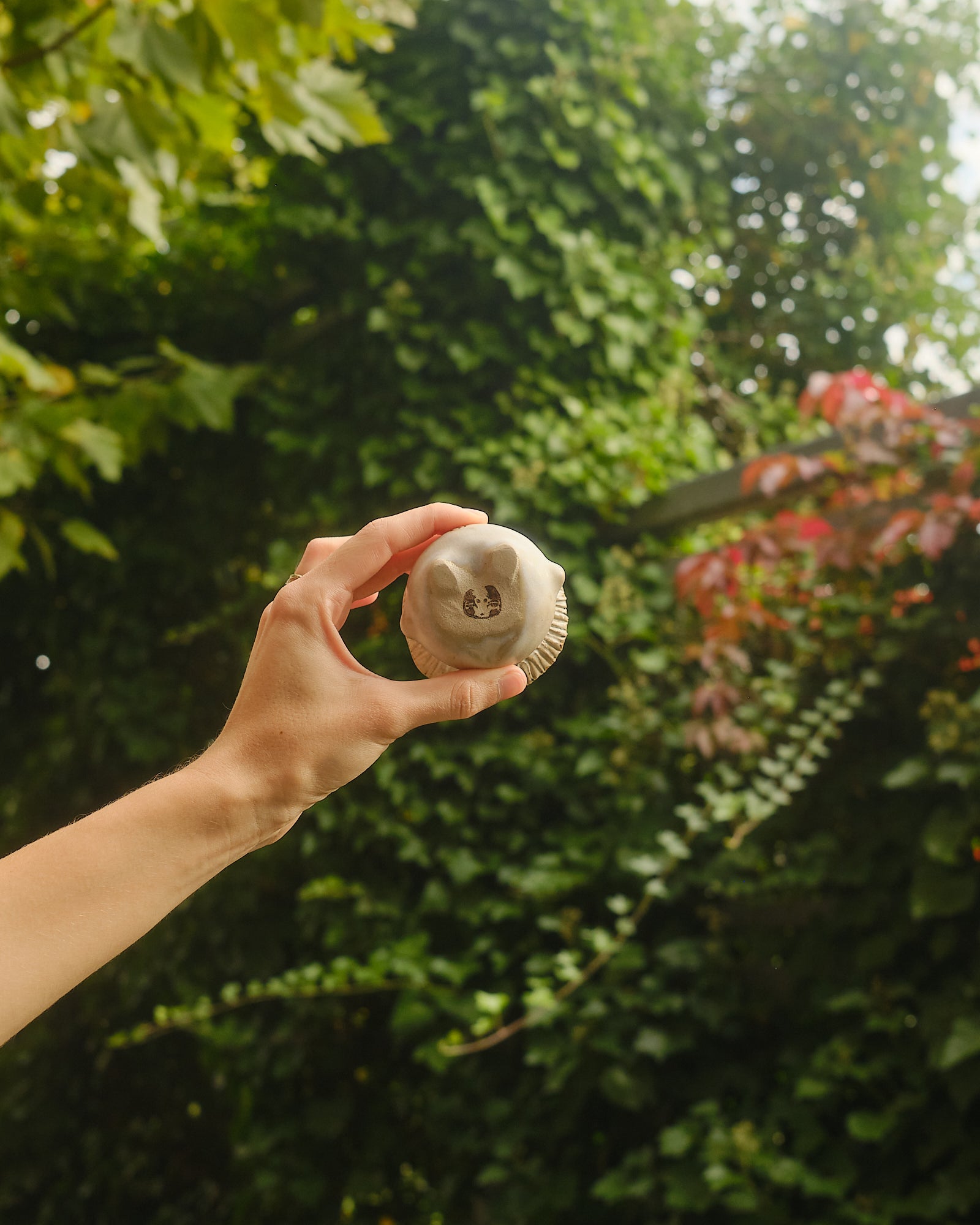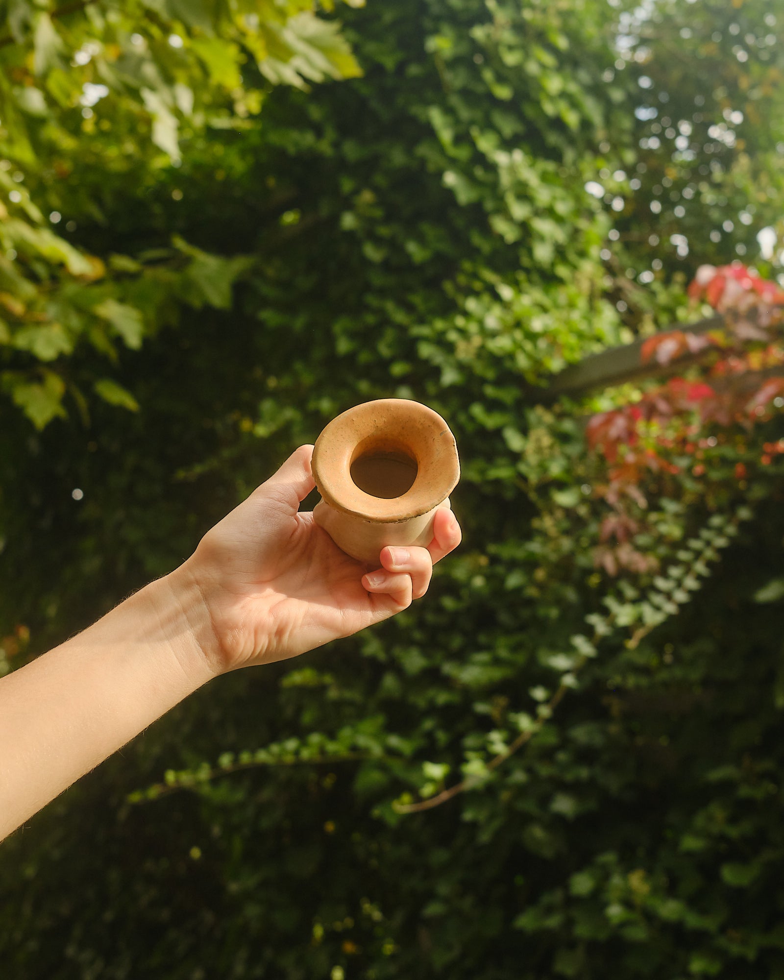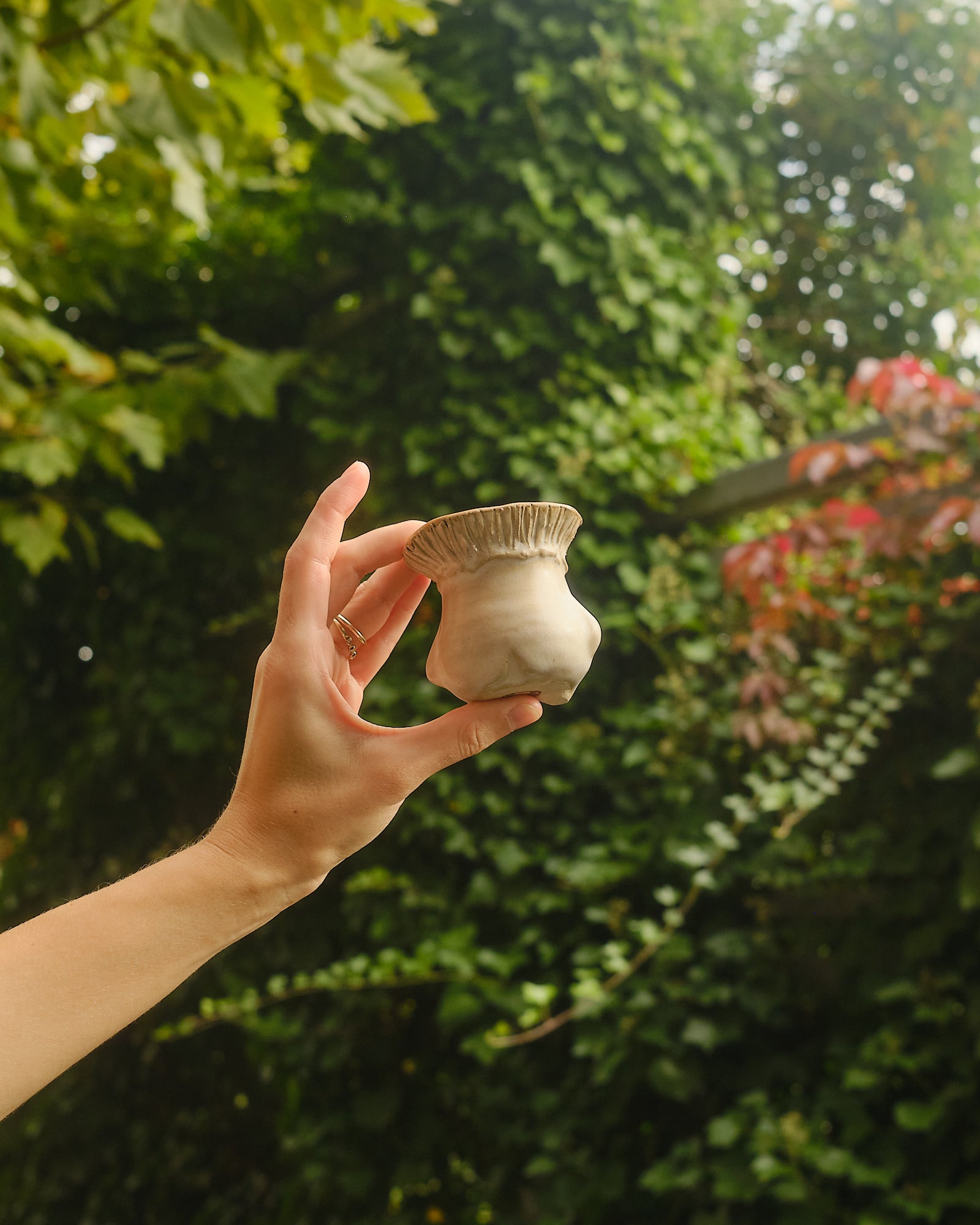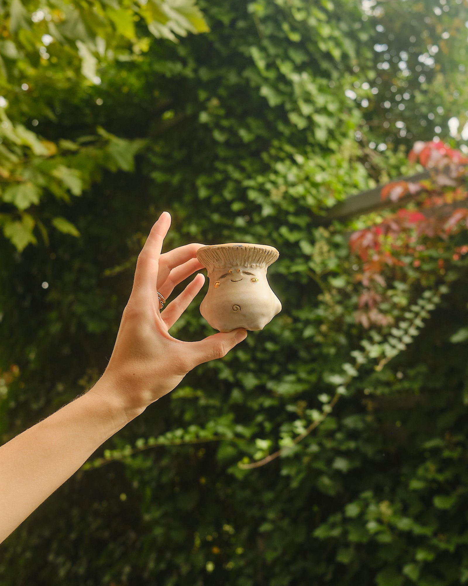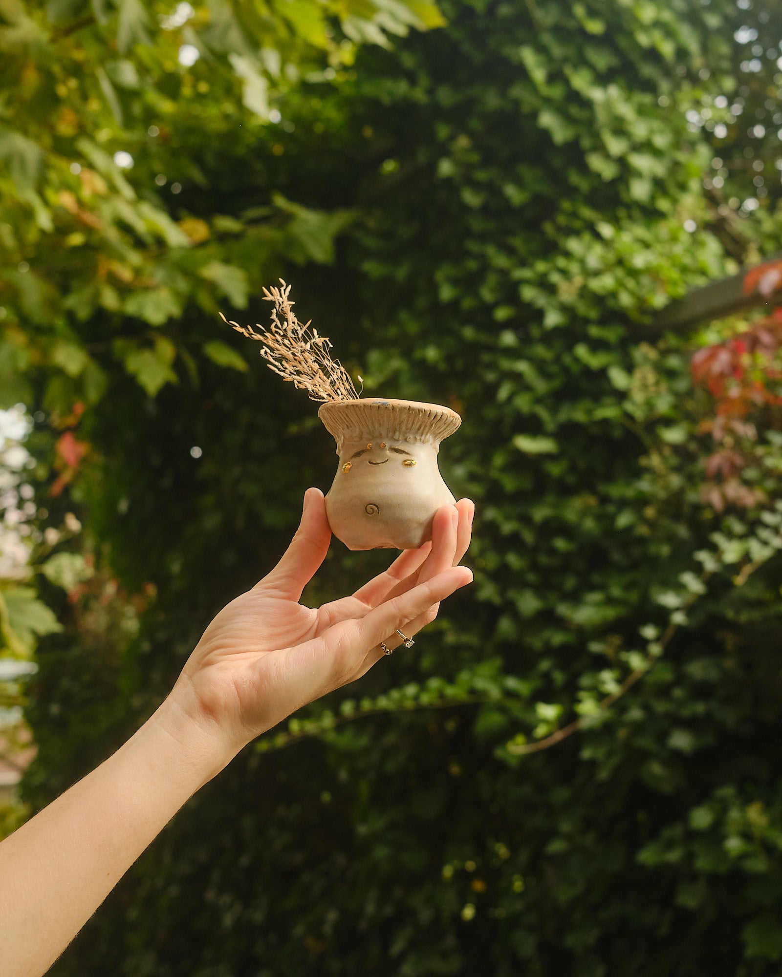 Hand sculpted stoneware bud vase embellished in 24k gold lustre details.
