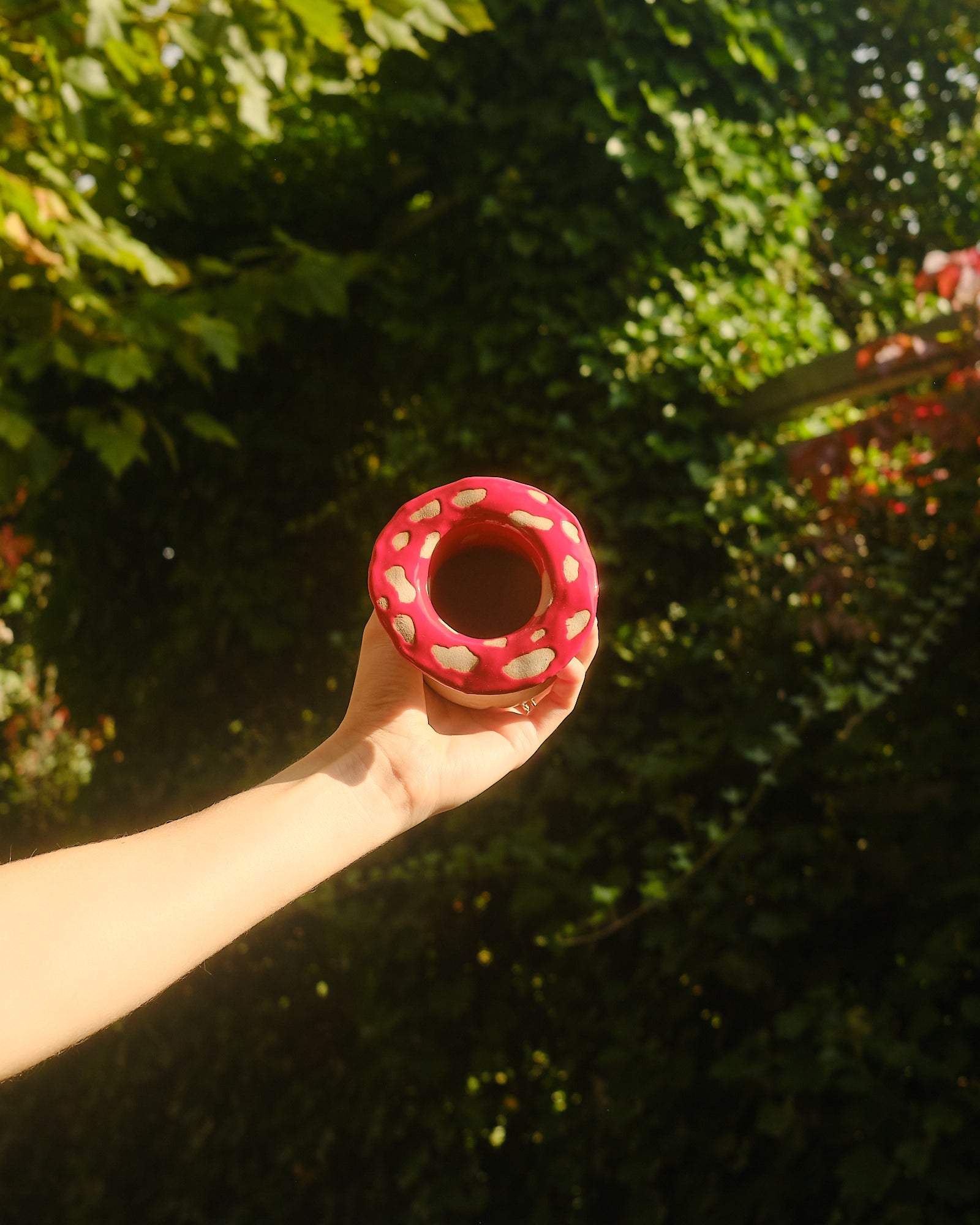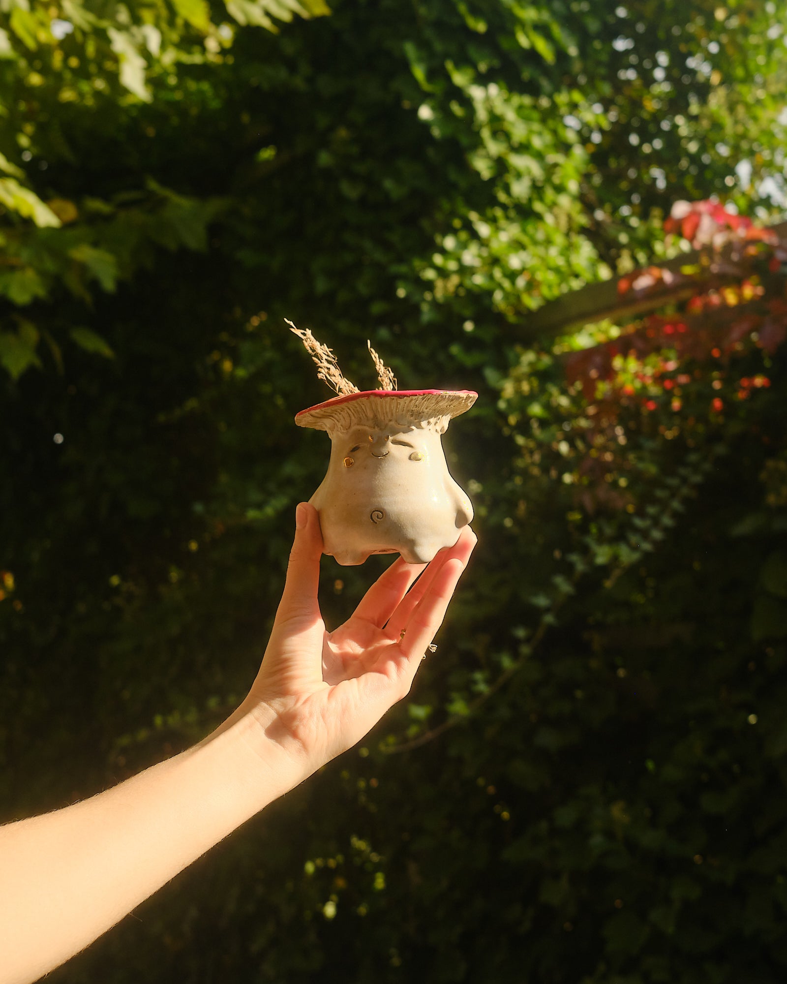 Hand sculpted stoneware bud vase embellished in 24k gold lustre details.