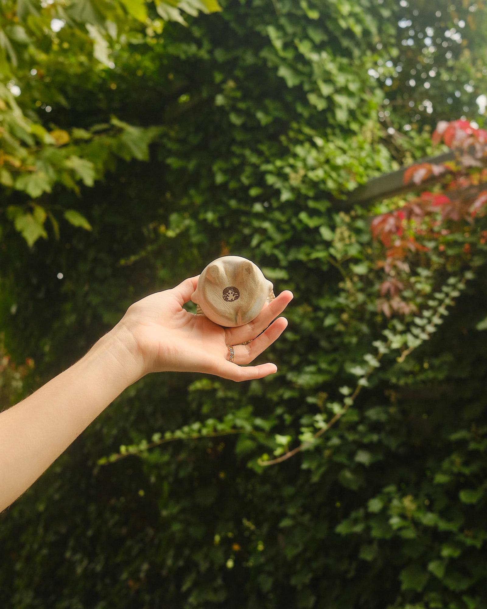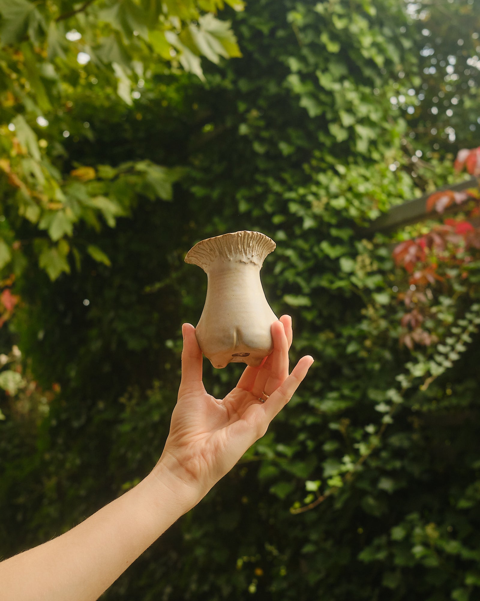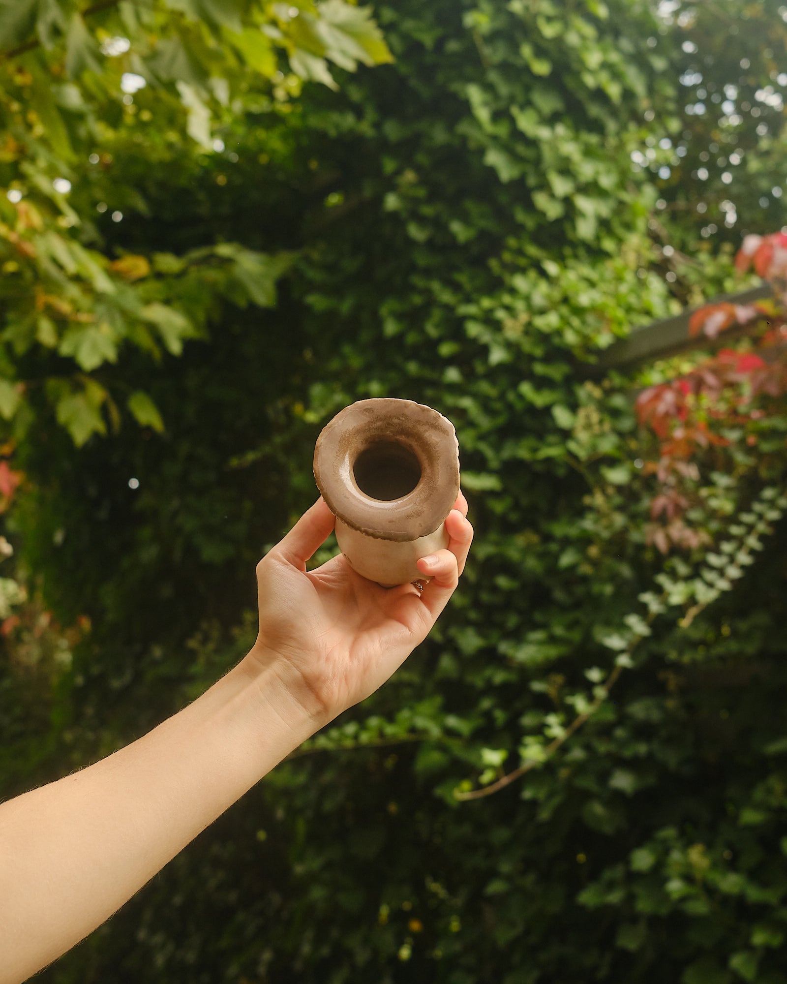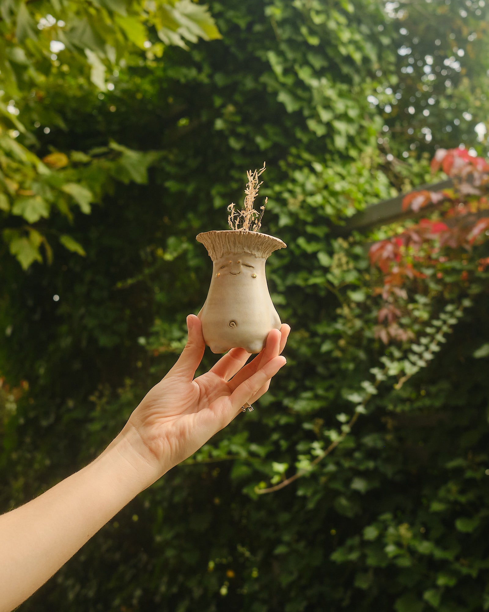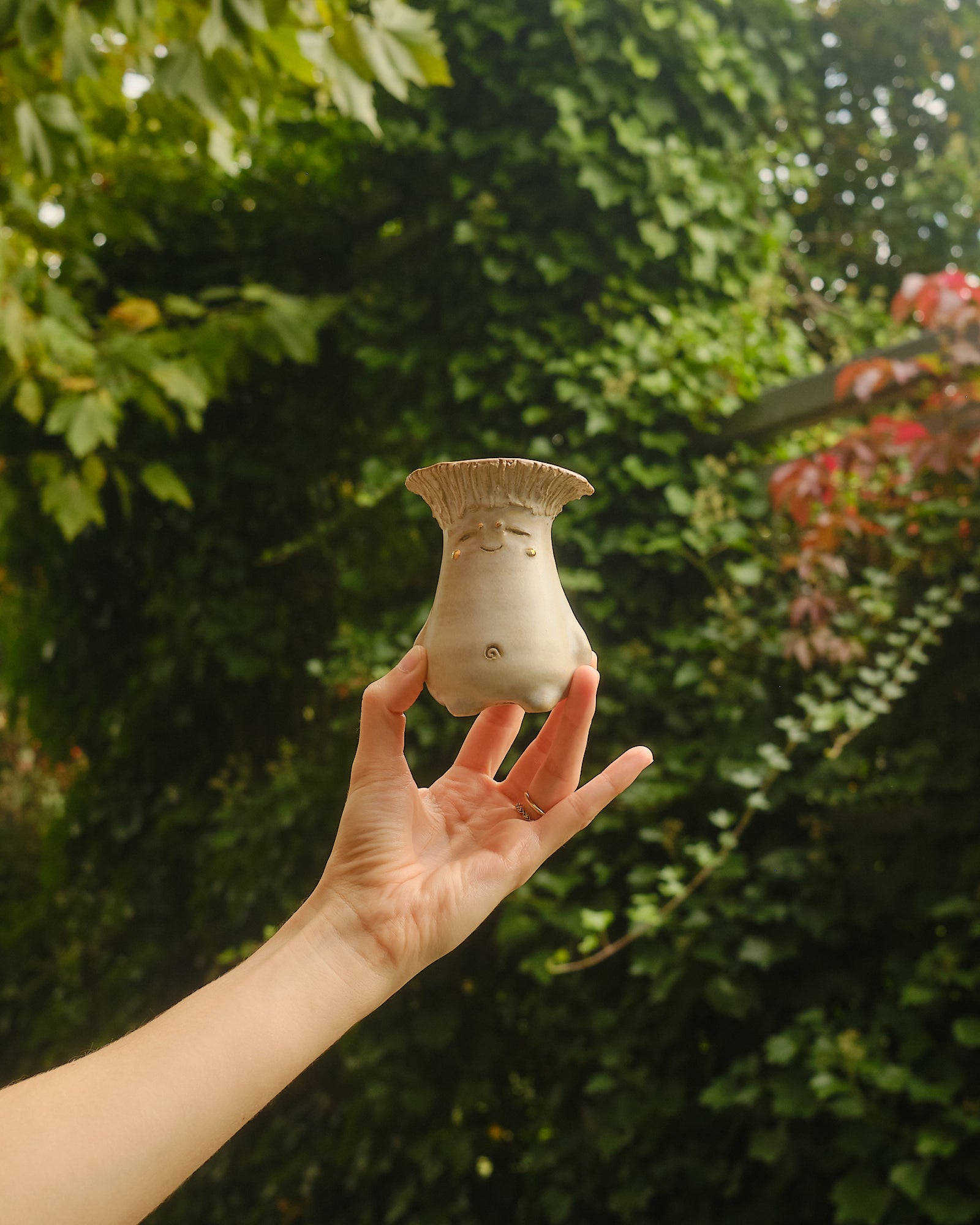 Hand sculpted stoneware bud vase embellished in 24k gold lustre details.