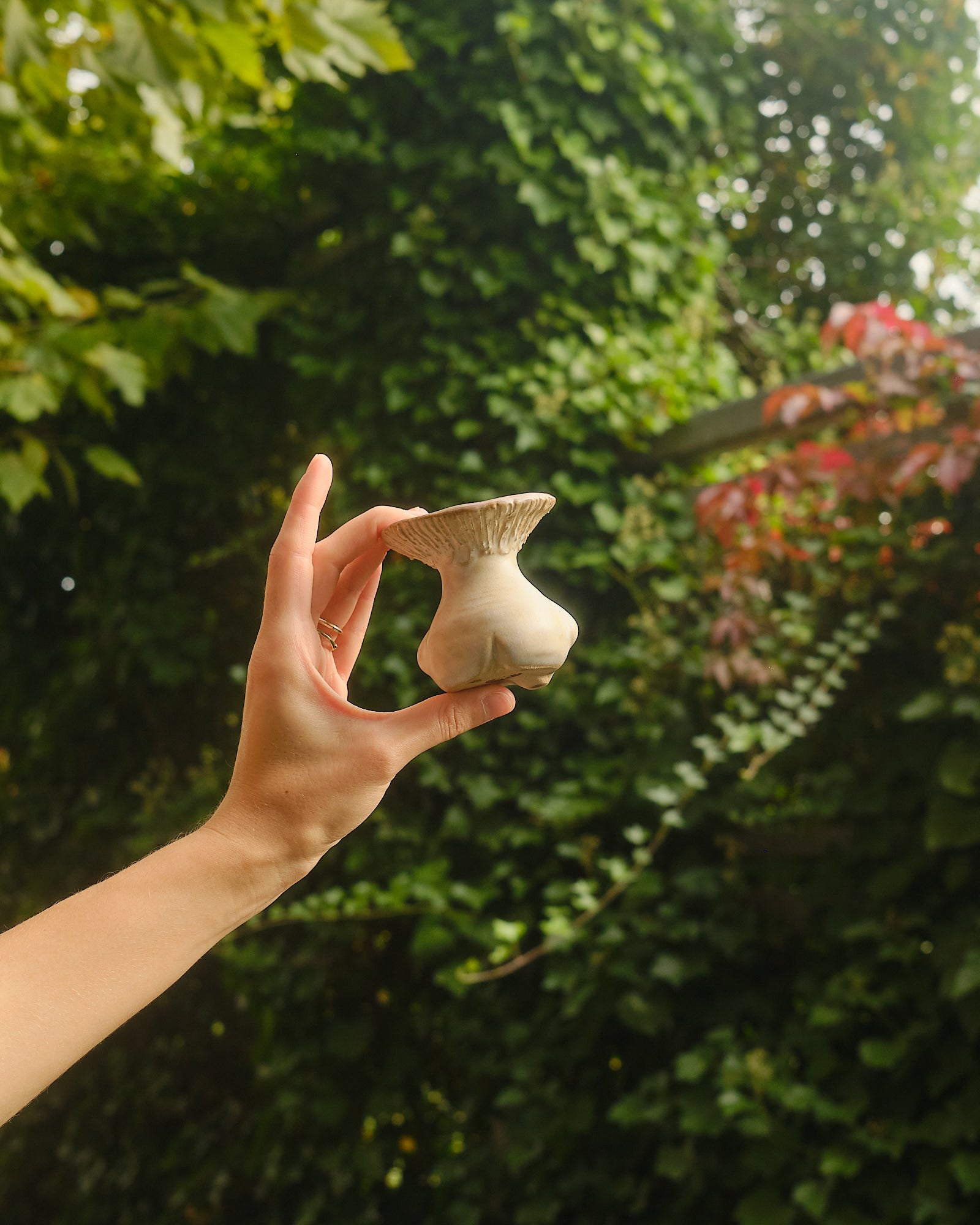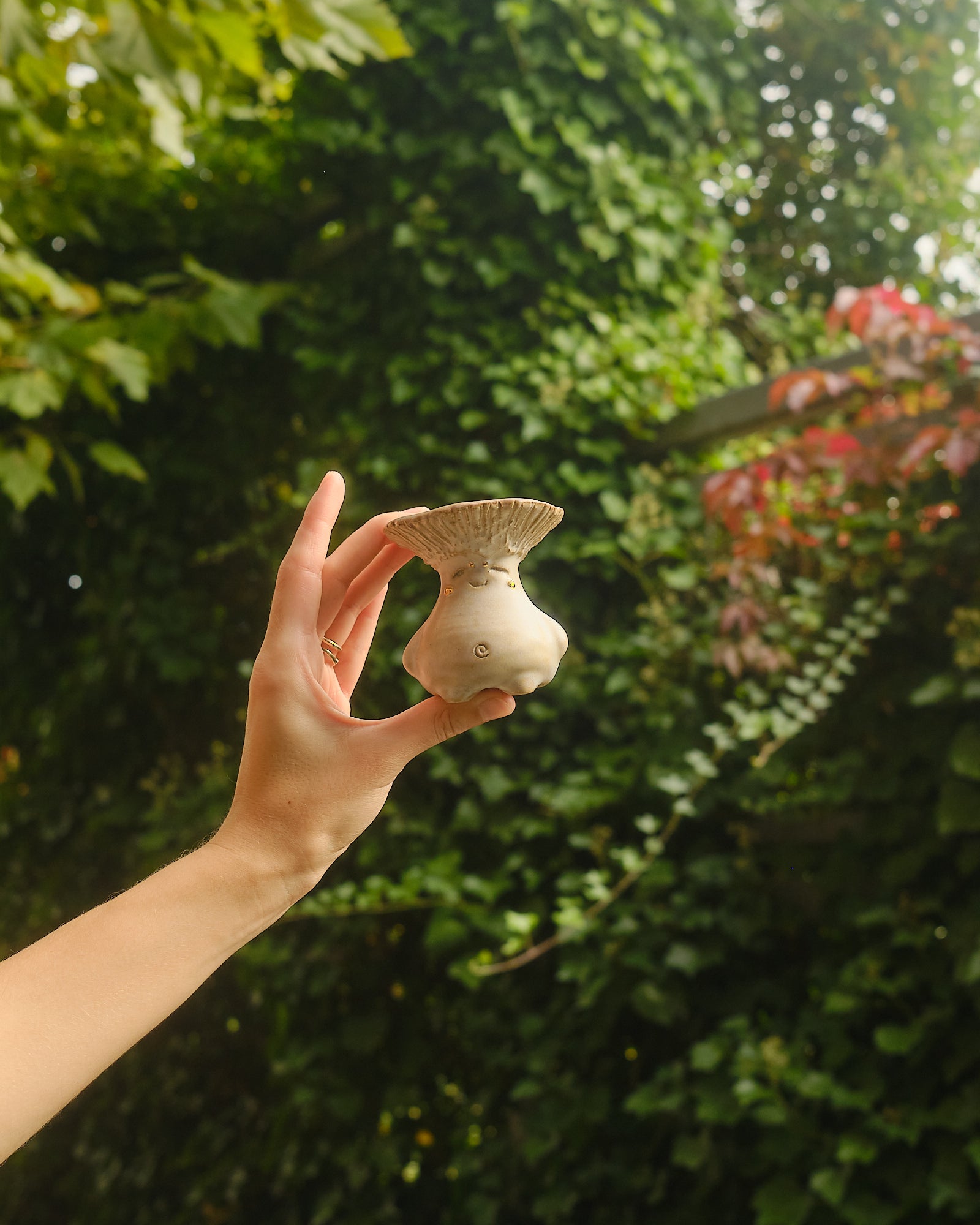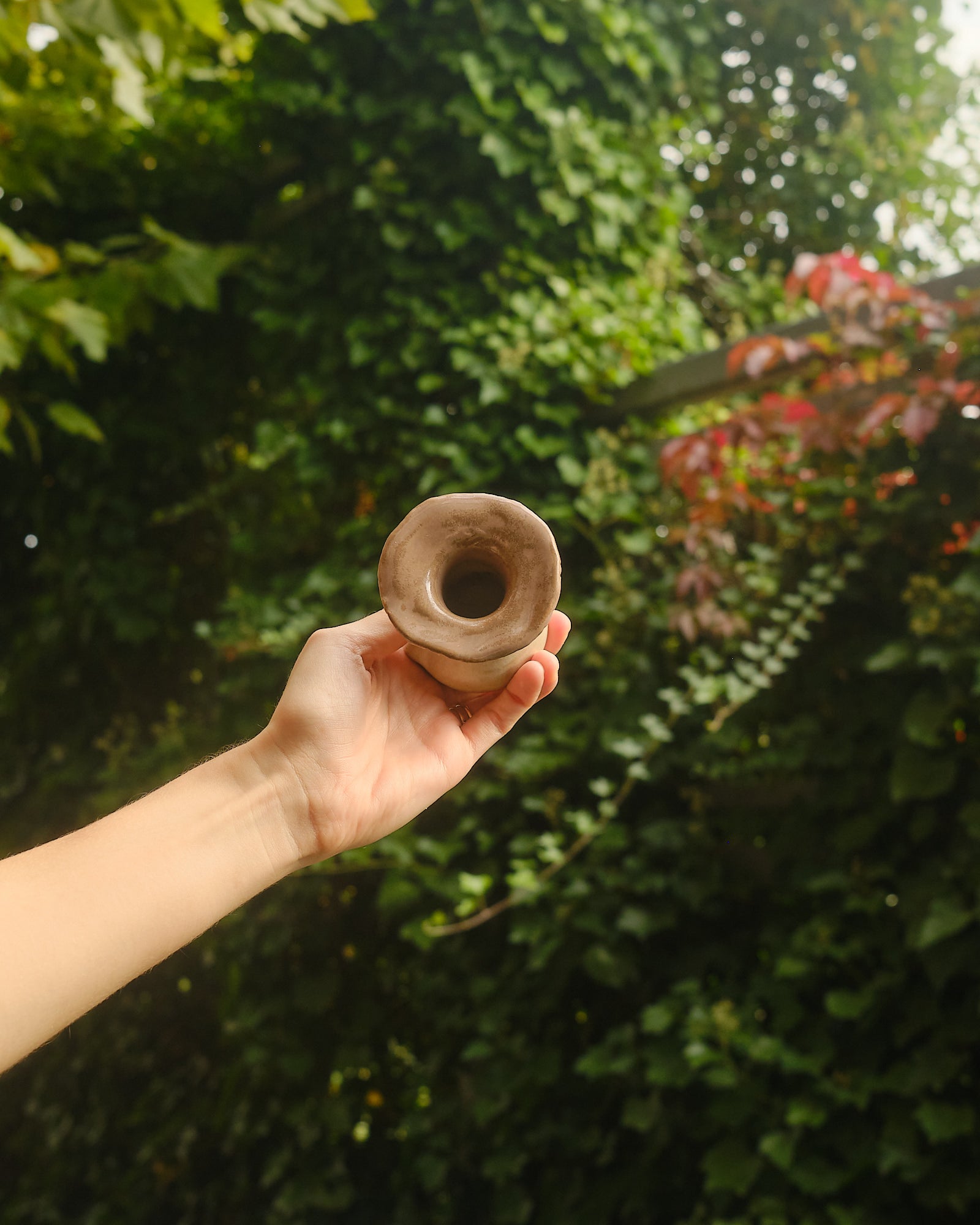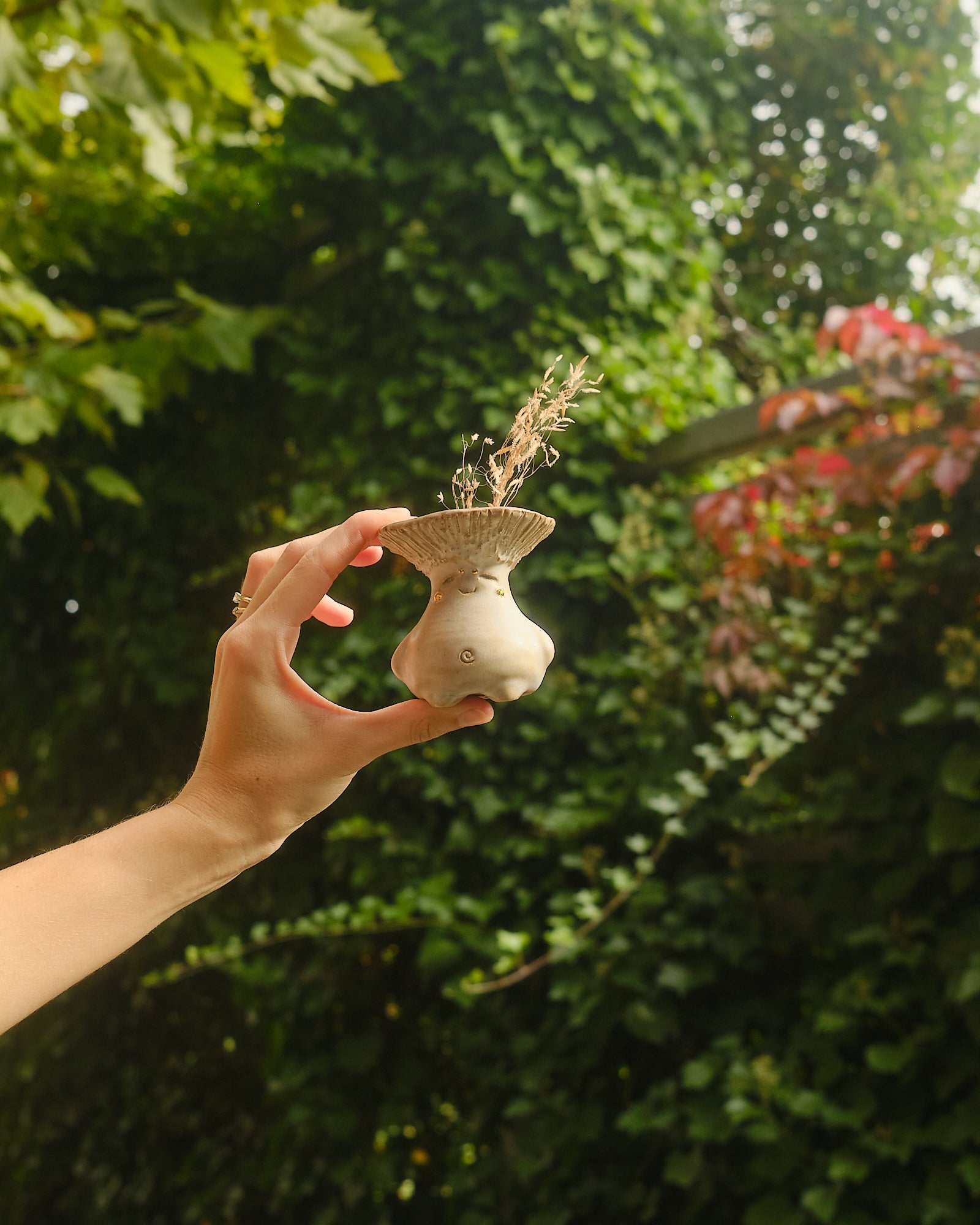 Hand sculpted stoneware bud vase embellished in 24k gold lustre details.