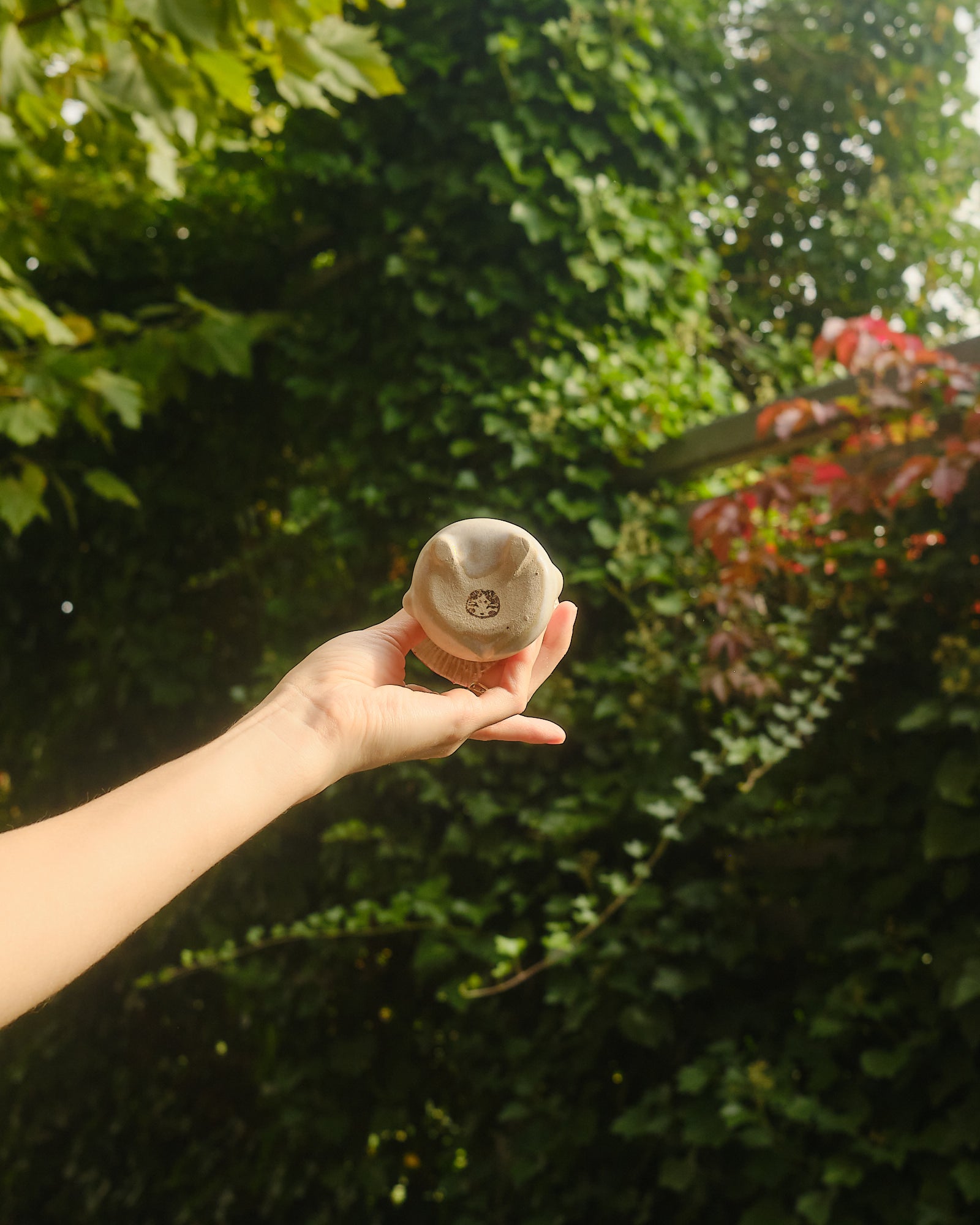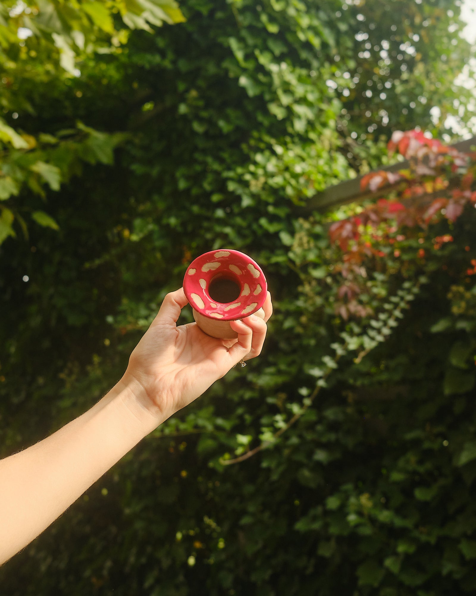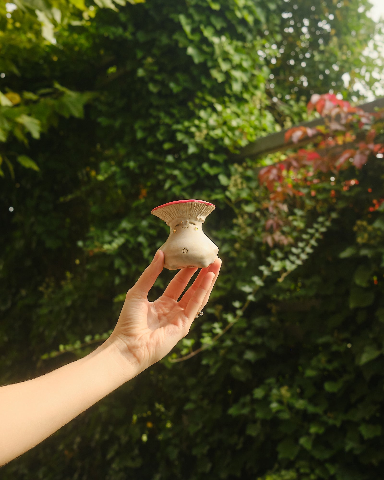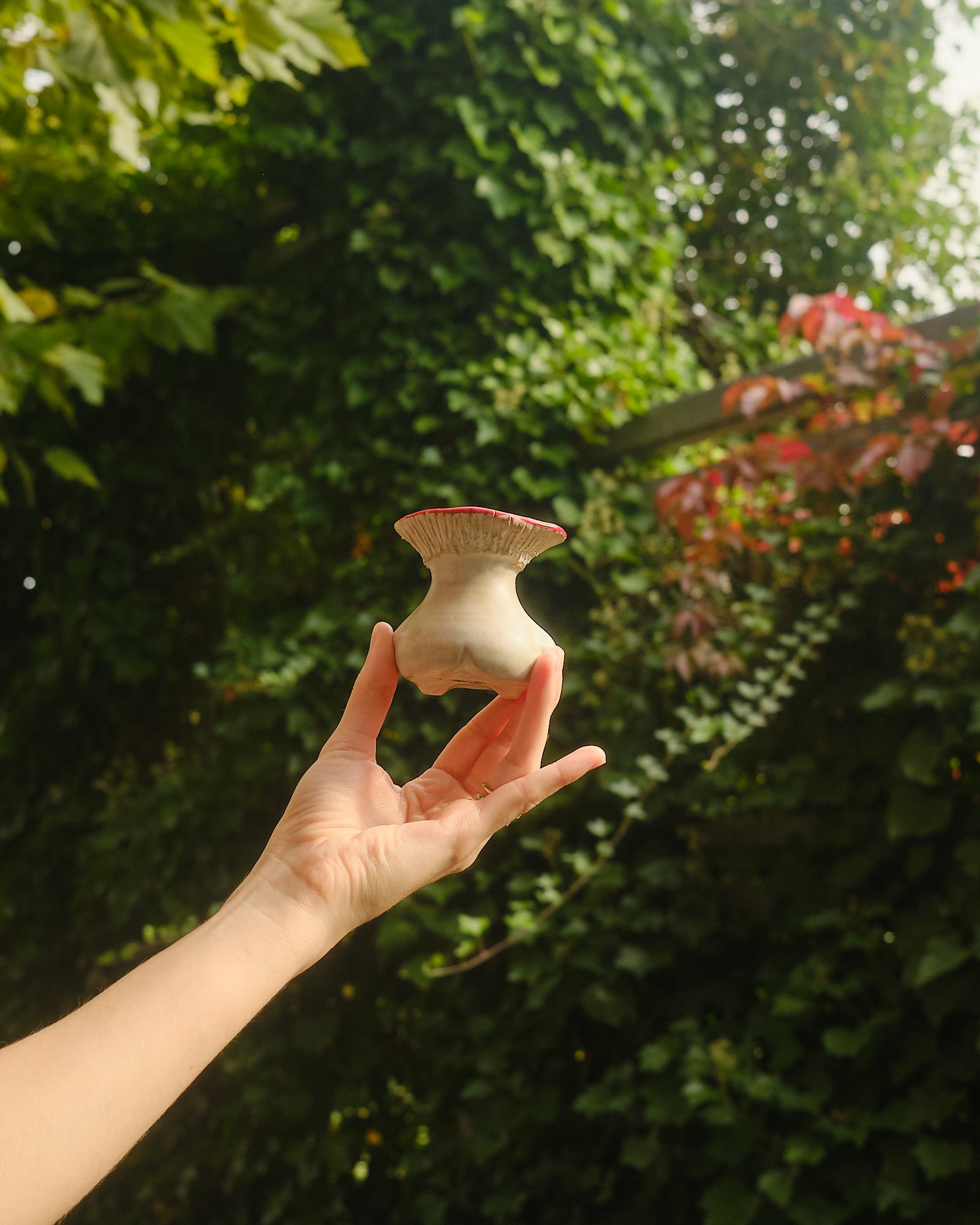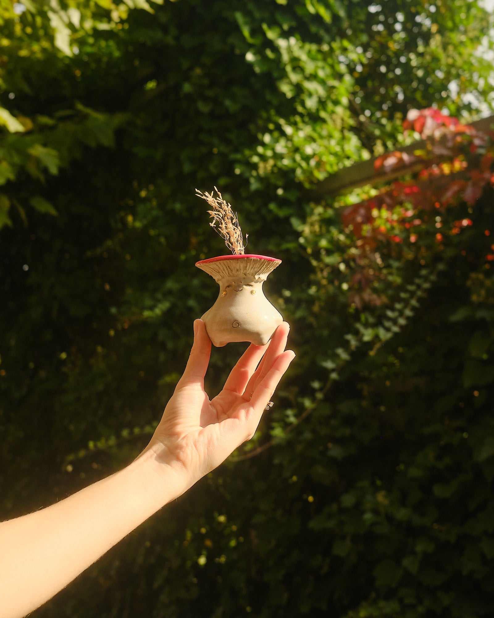 Hand sculpted stoneware bud vase embellished in 24k gold lustre details.