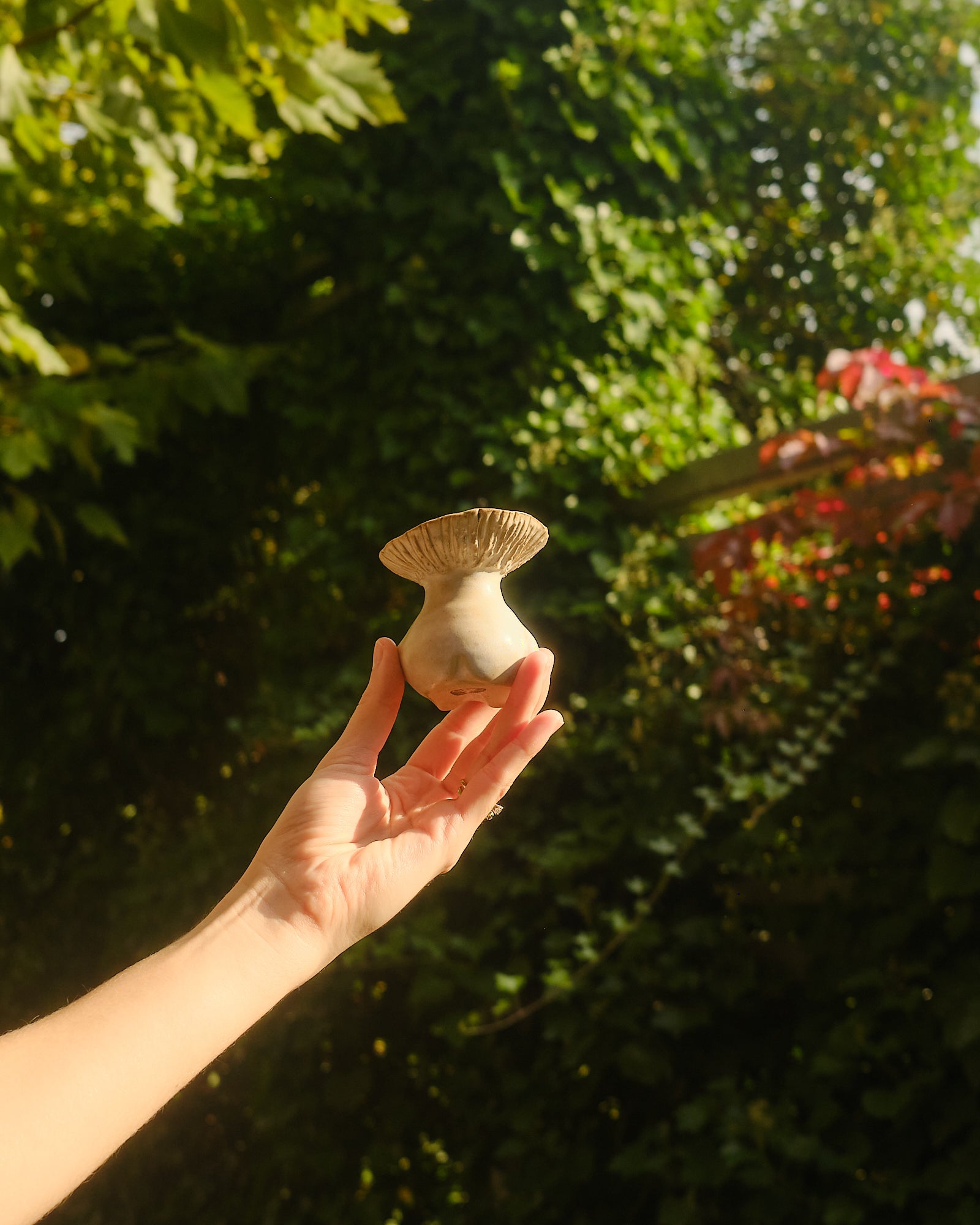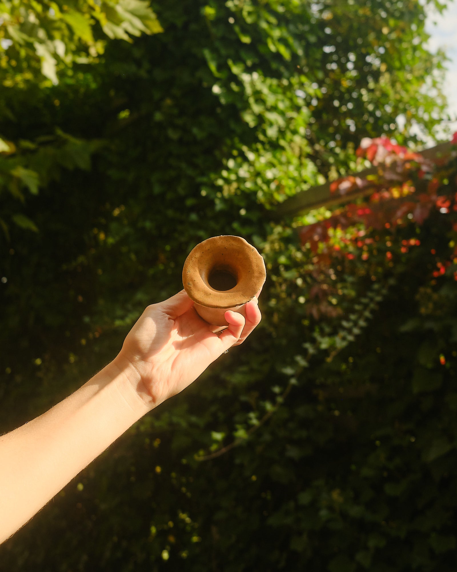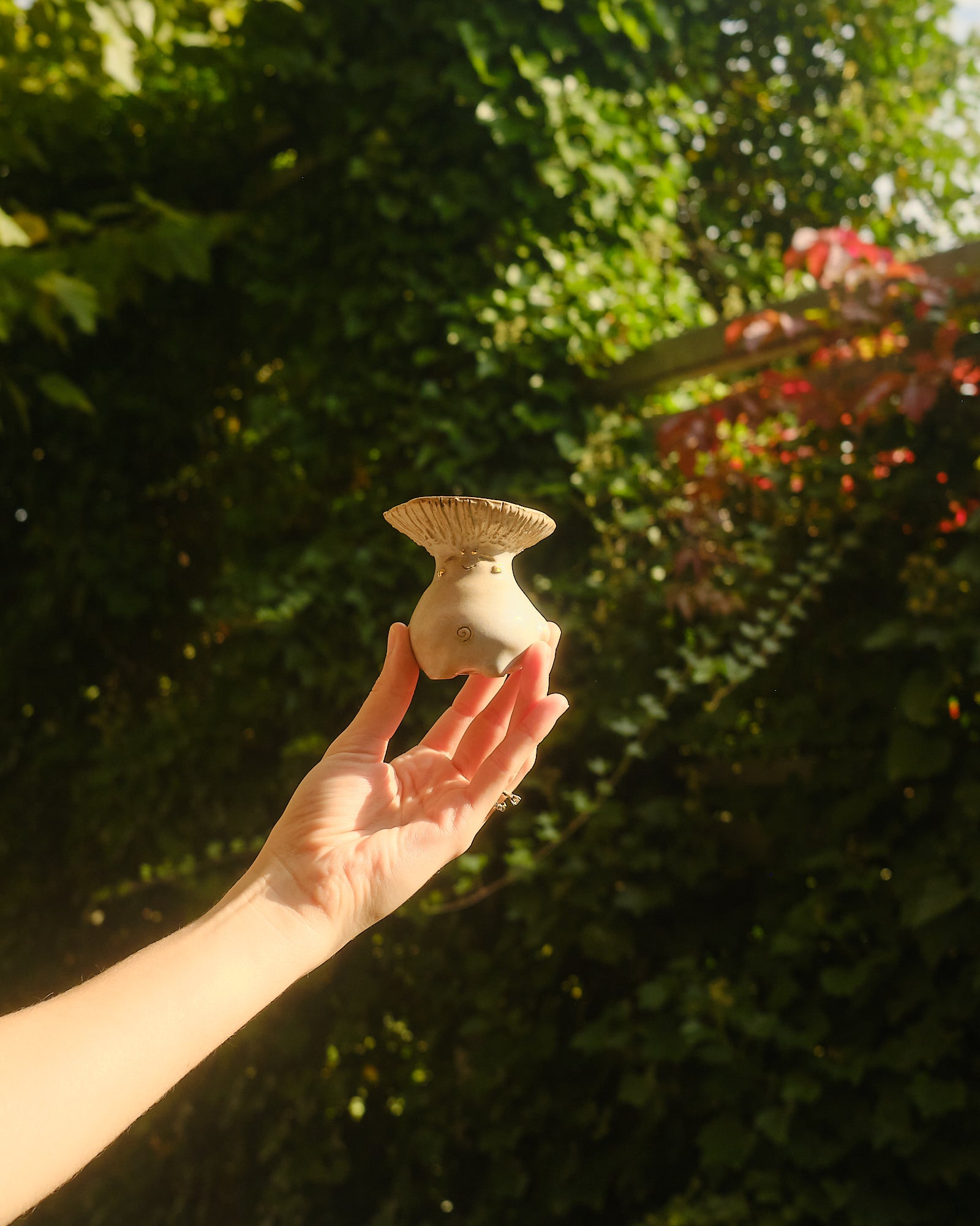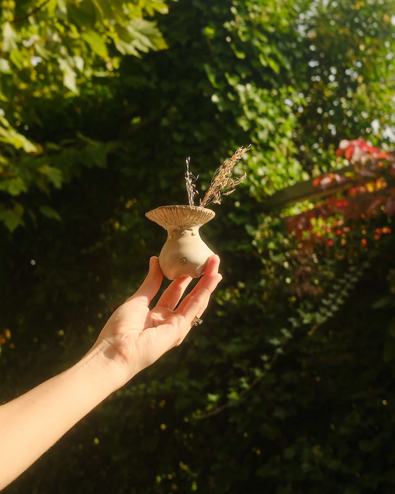 Hand sculpted stoneware bud vase embellished in 24k gold lustre details.