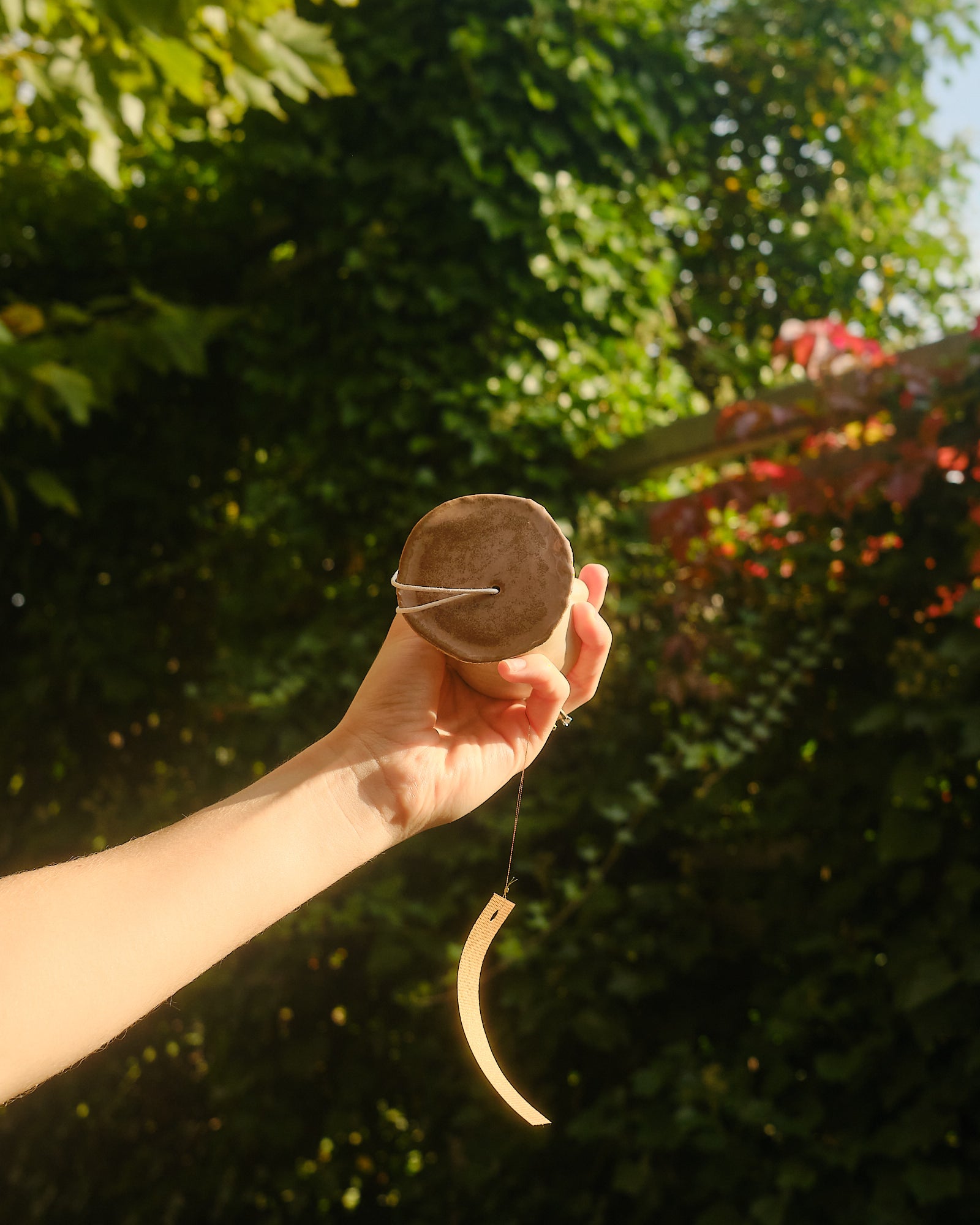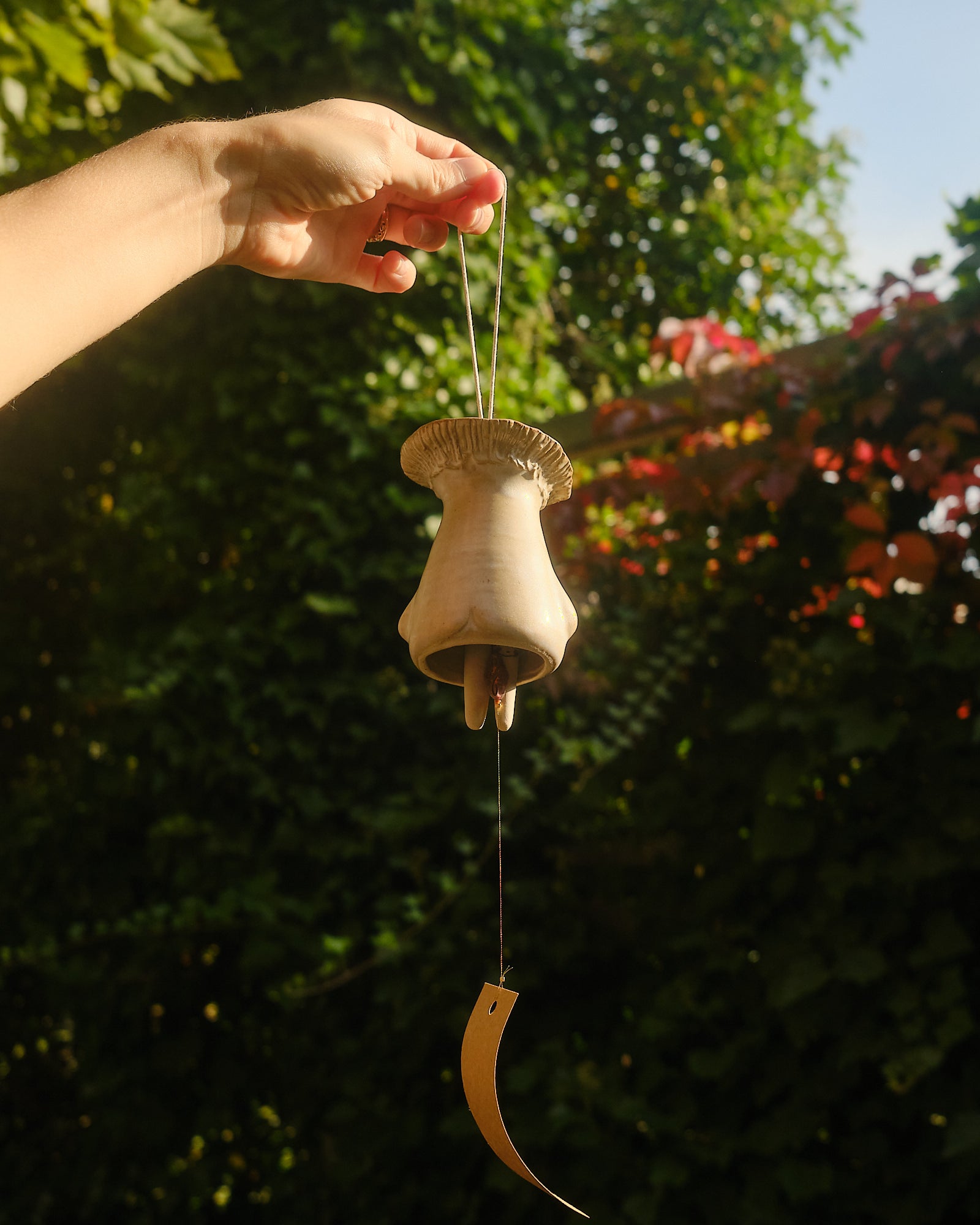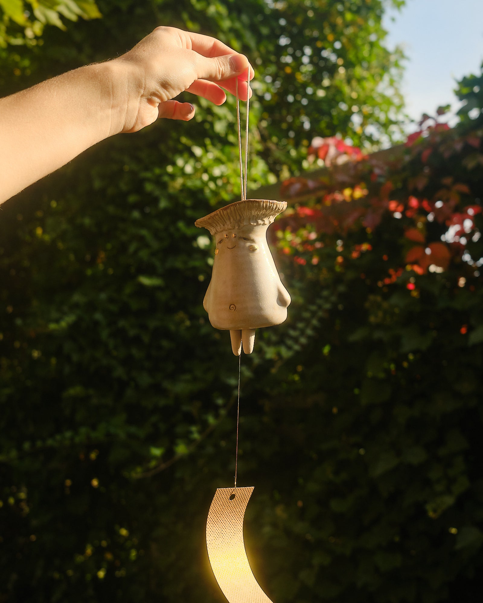 Hand sculpted stoneware wind chime embellished in 24k gold lustre details. The paper catches the wind, creating a gentle soothing bell sound. Handle with care.