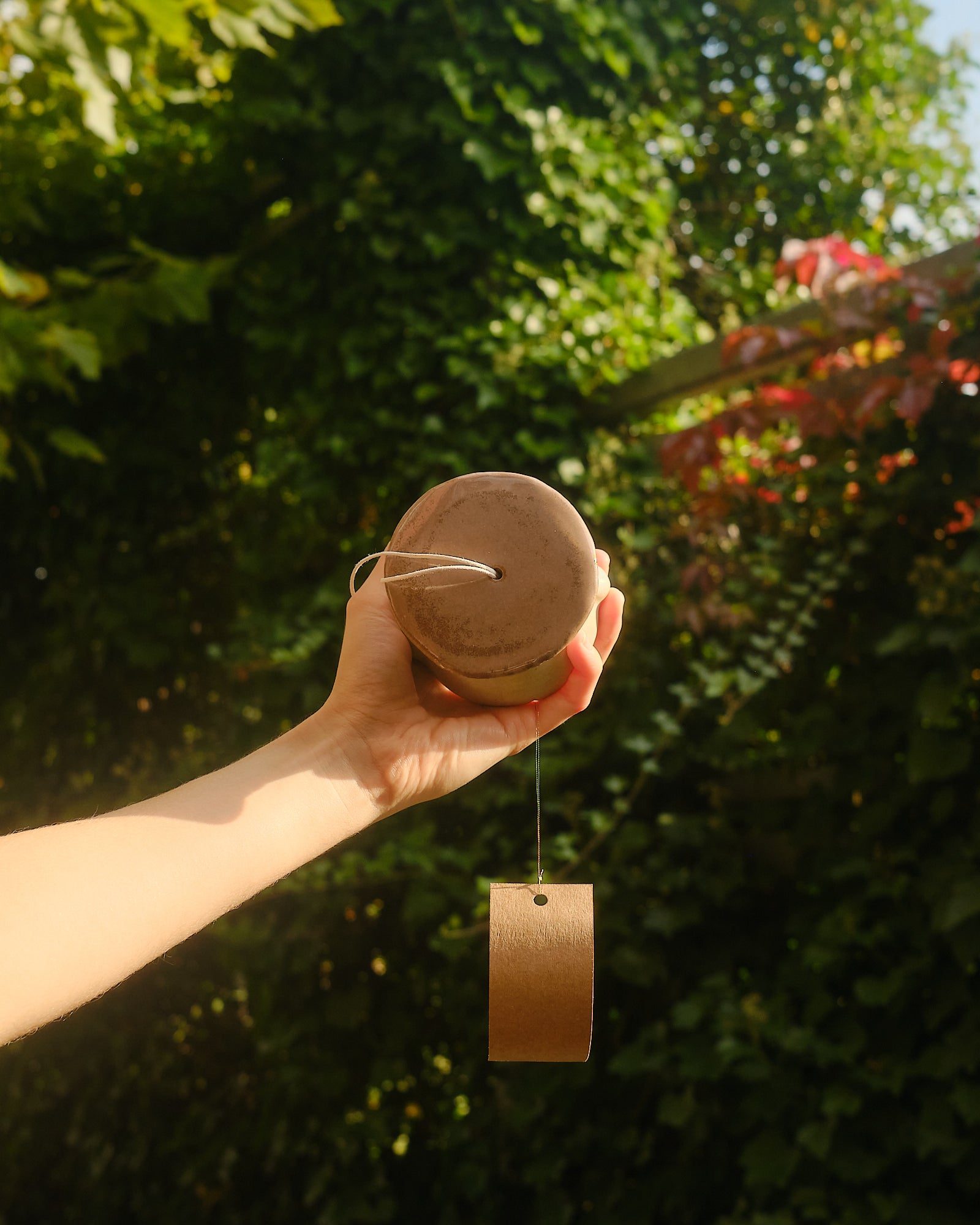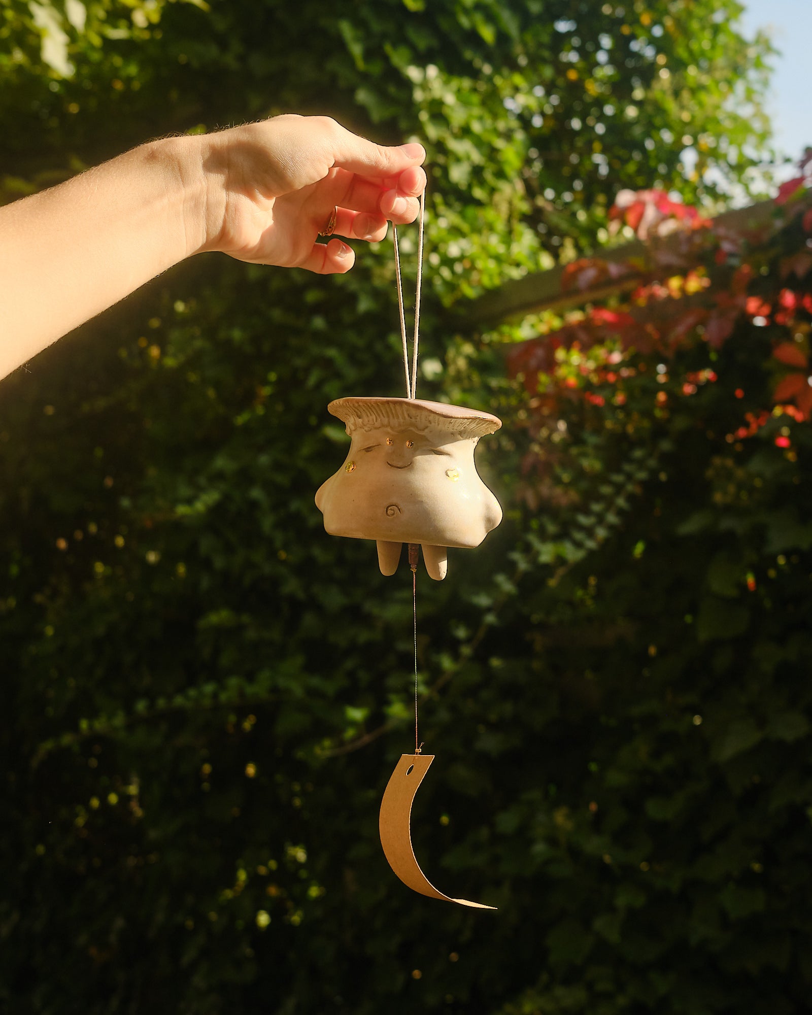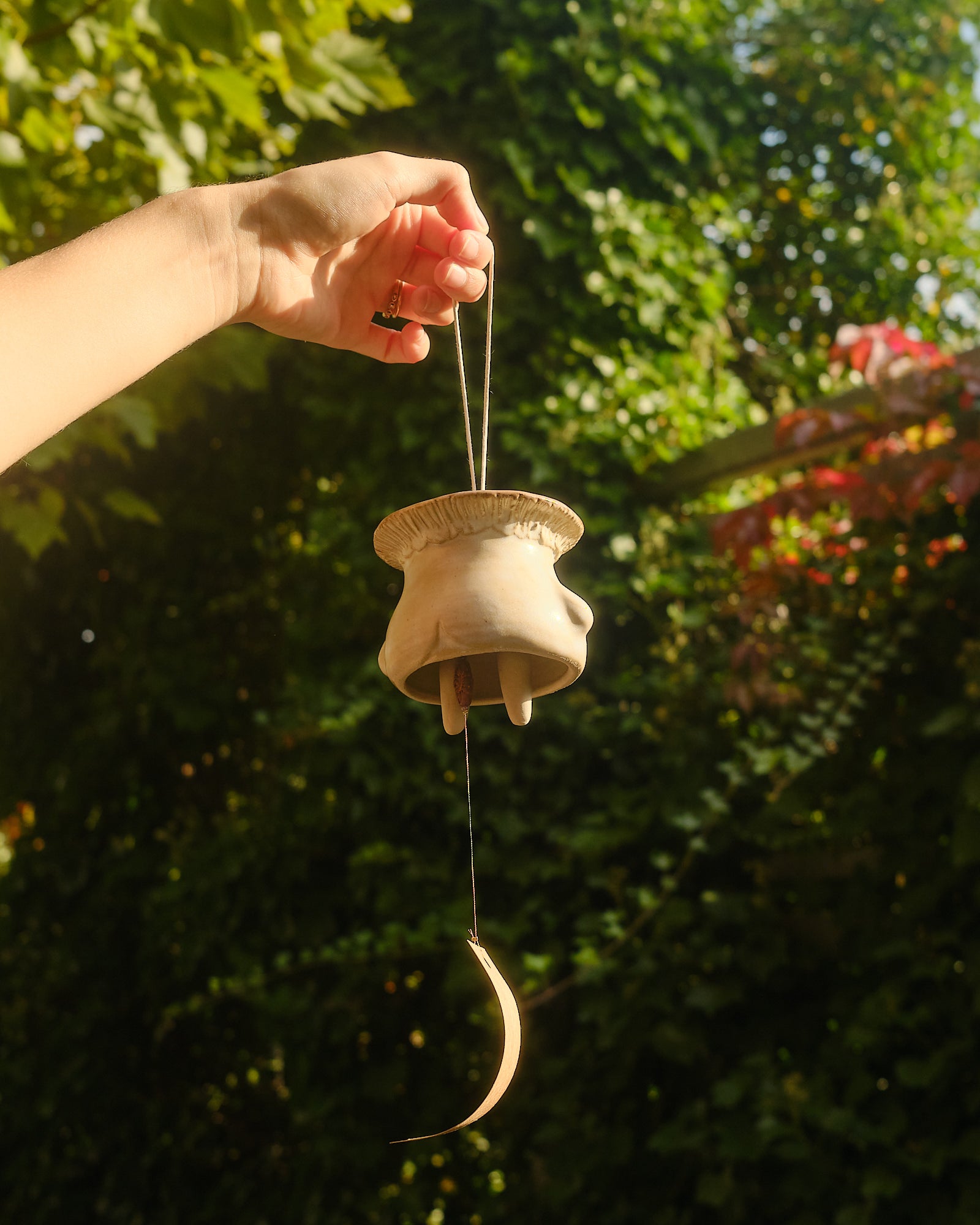 Hand sculpted stoneware wind chime embellished in 24k gold lustre details. The paper catches the wind, creating a gentle soothing bell sound. Handle with care.