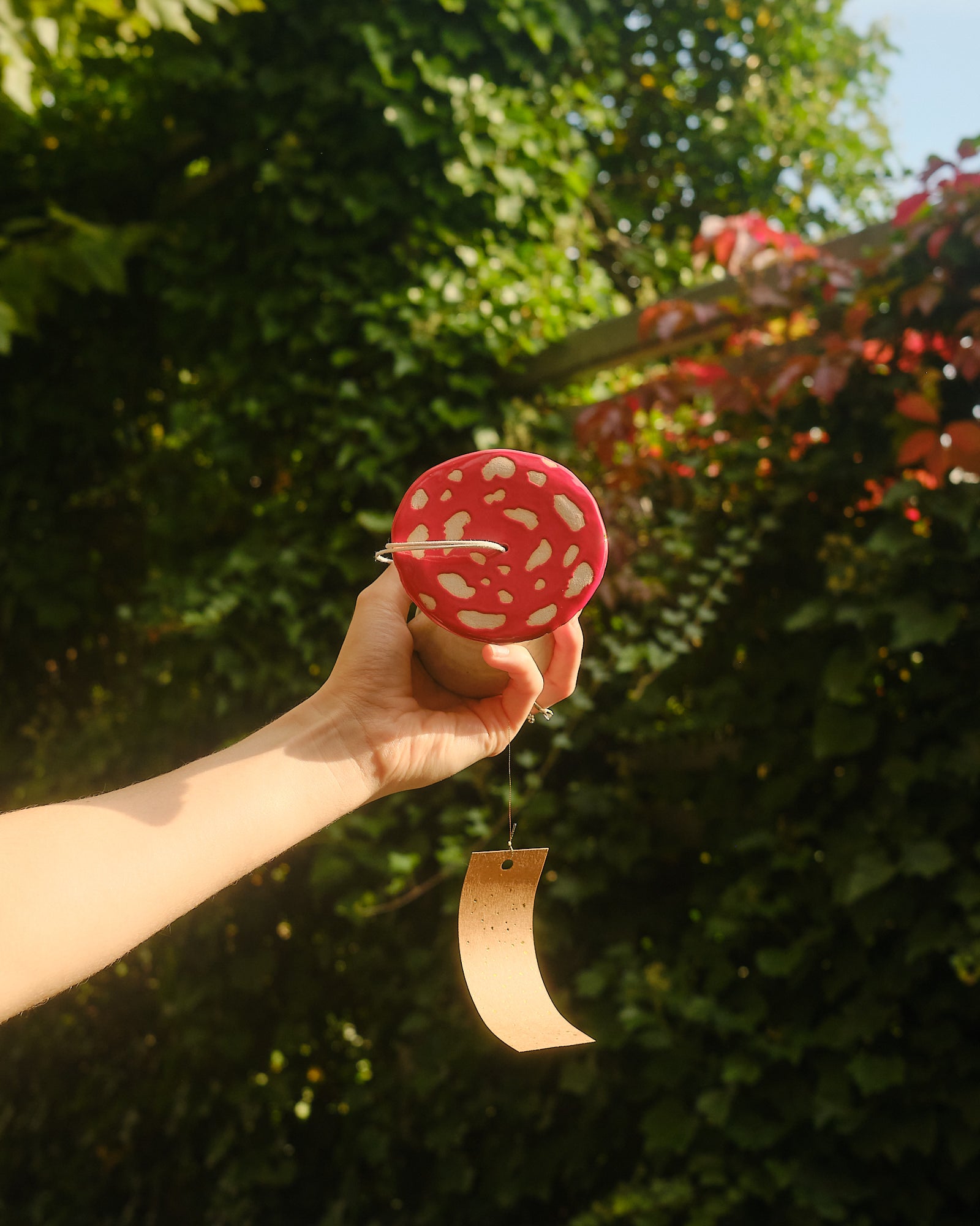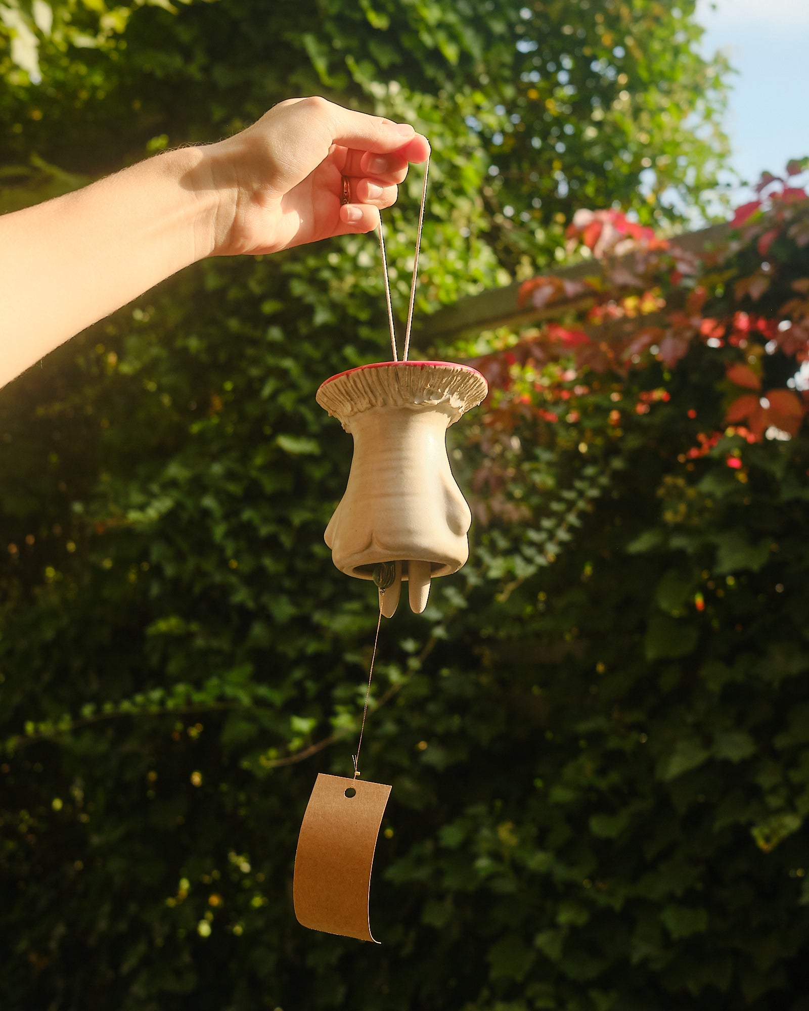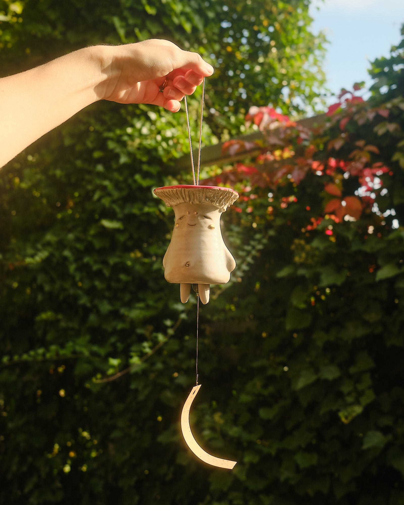 Hand sculpted stoneware wind chime embellished in 24k gold lustre details. The paper catches the wind, creating a gentle soothing bell sound. Handle with care.