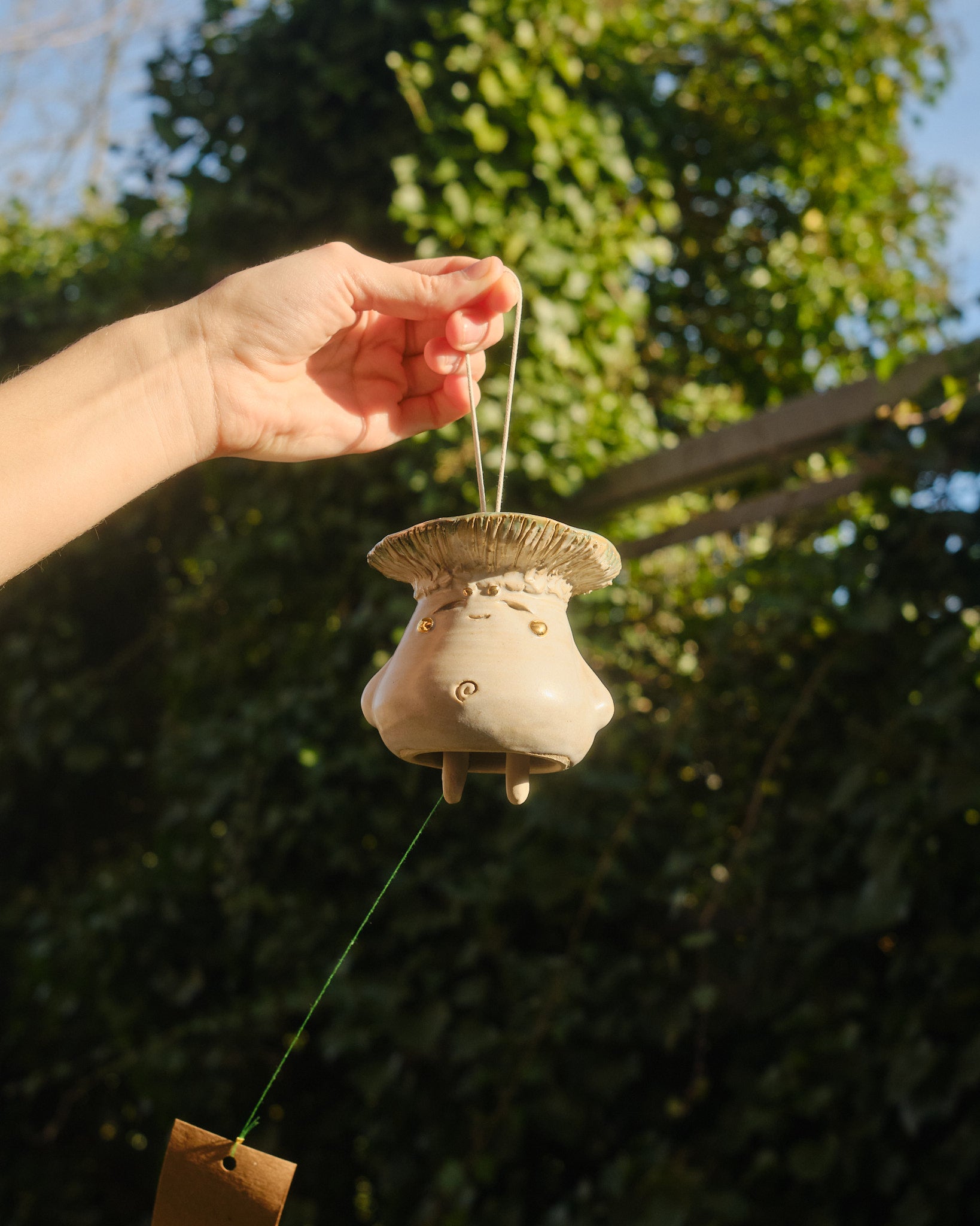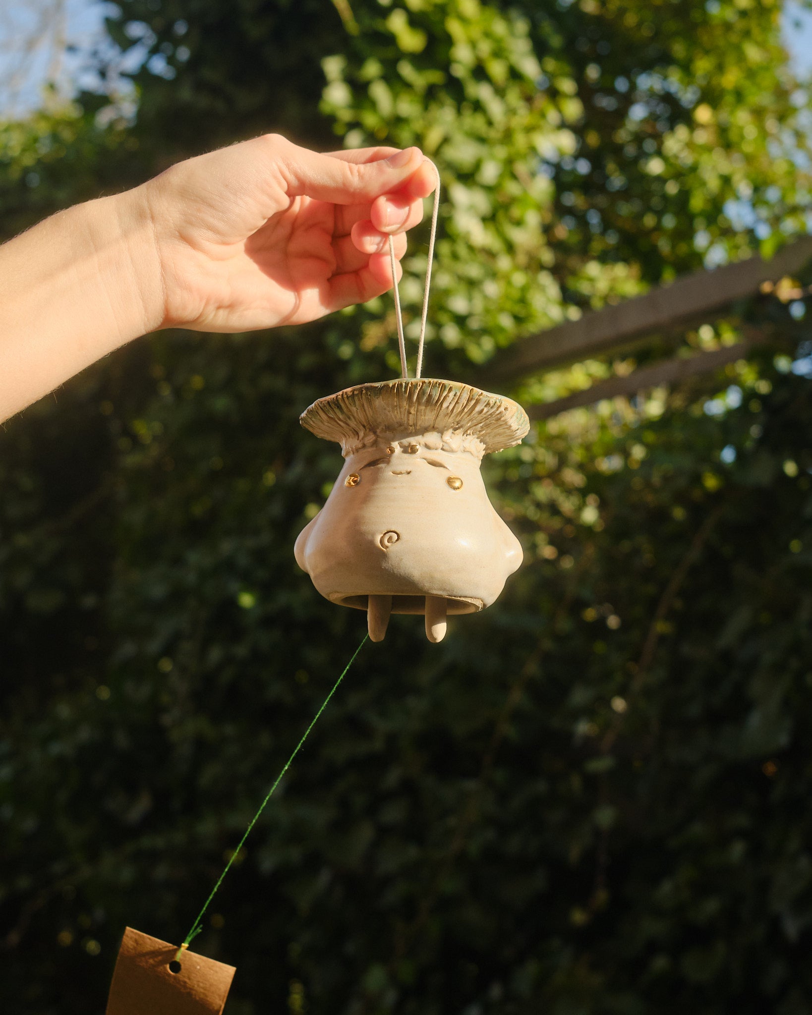 Hand sculpted stoneware wind chime embellished in 24k gold lustre details. The paper catches the wind, creating a gentle soothing bell sound. Handle with care. Do not pull on strings.
