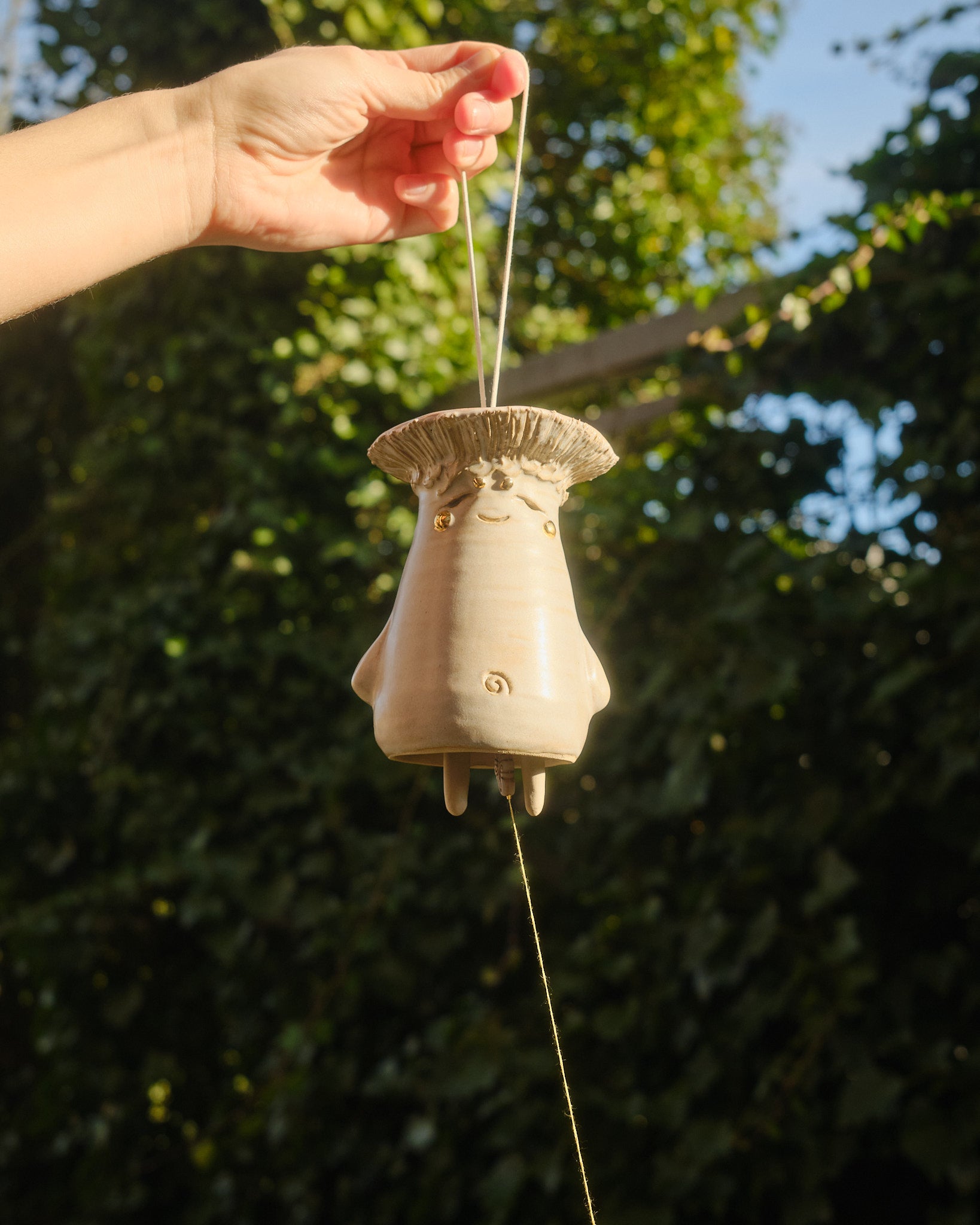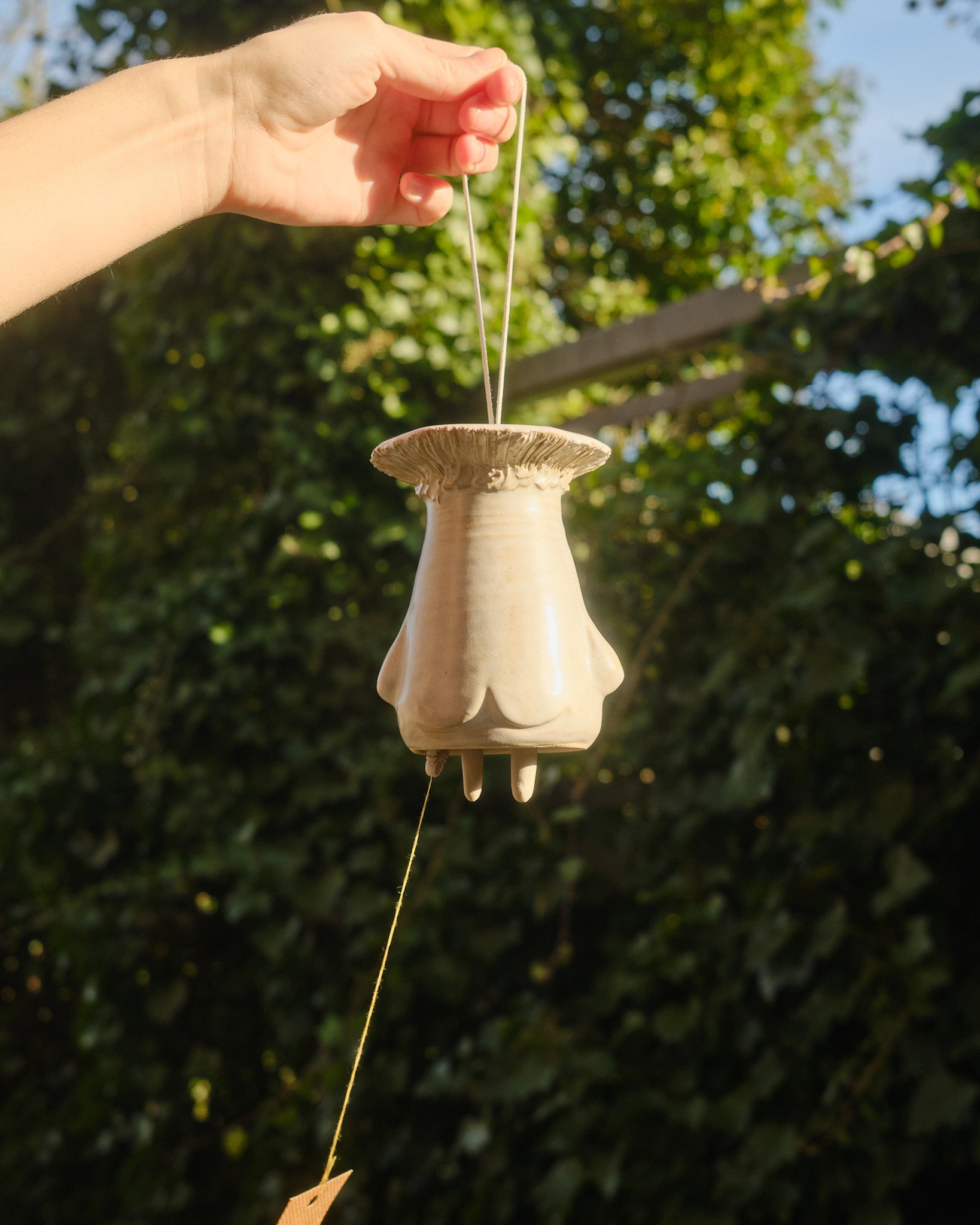 Hand sculpted stoneware wind chime embellished in 24k gold lustre details. The paper catches the wind, creating a gentle soothing bell sound. Handle with care. Do not pull on strings.