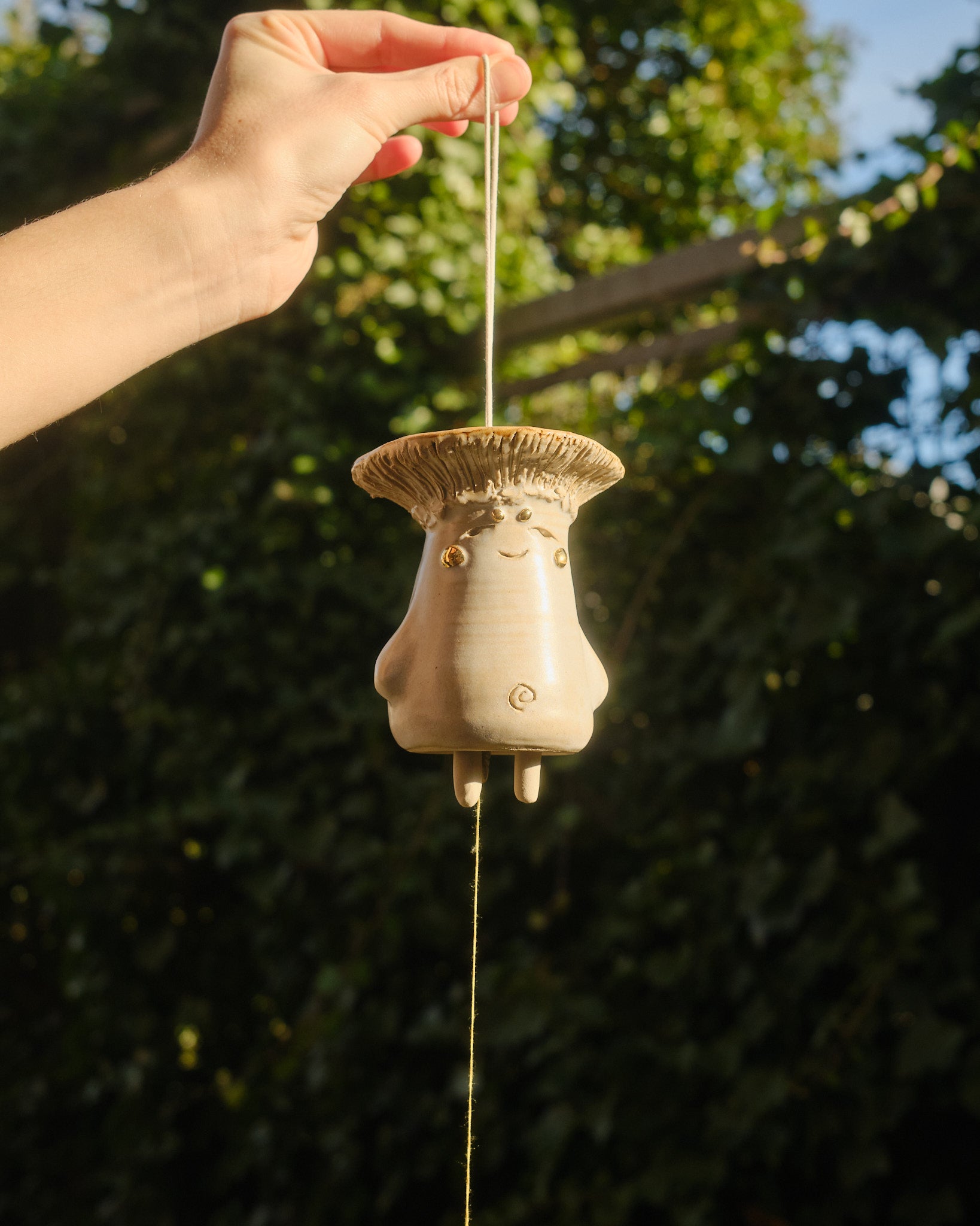 Hand sculpted stoneware wind chime embellished in 24k gold lustre details. The paper catches the wind, creating a gentle soothing bell sound. Handle with care.
