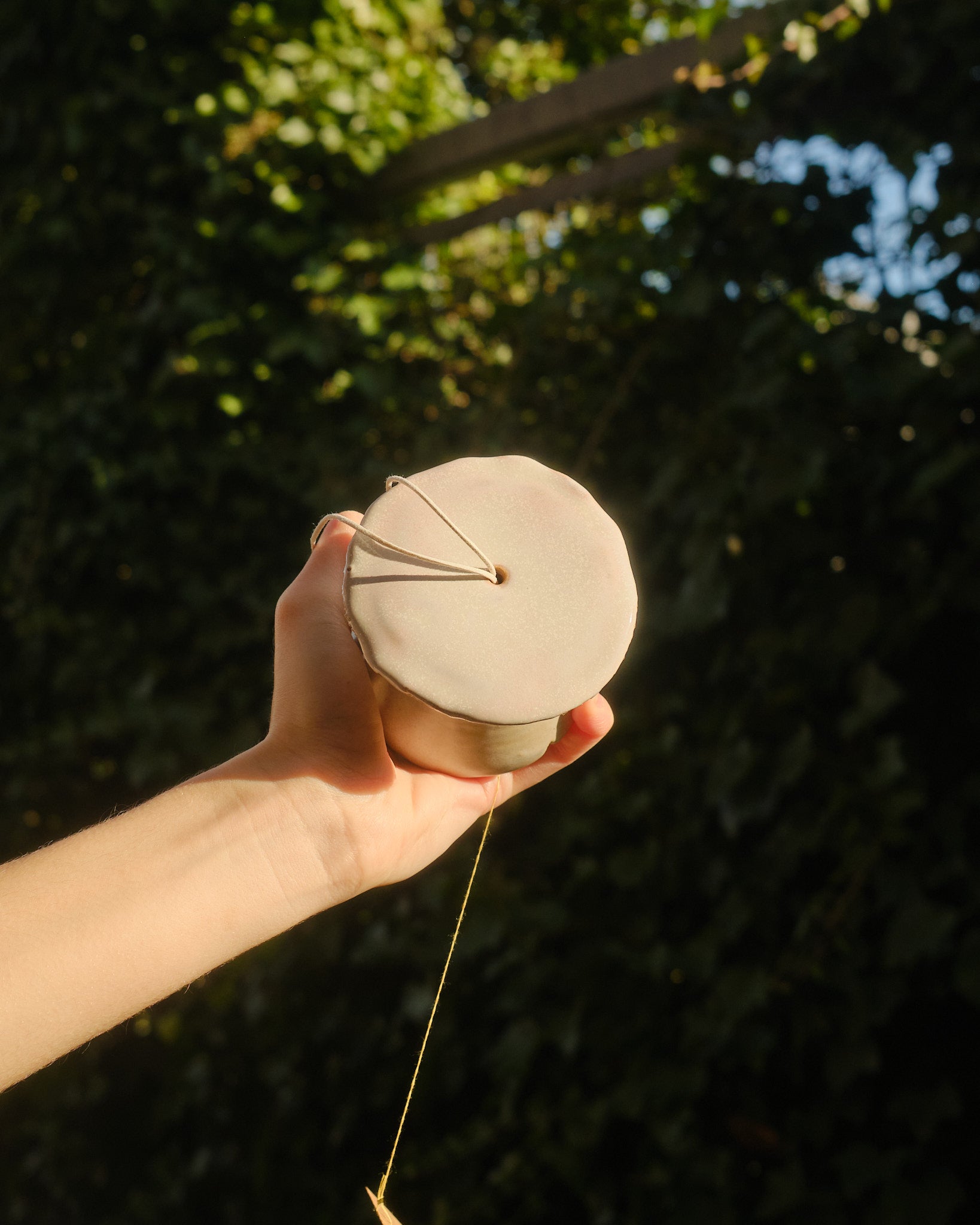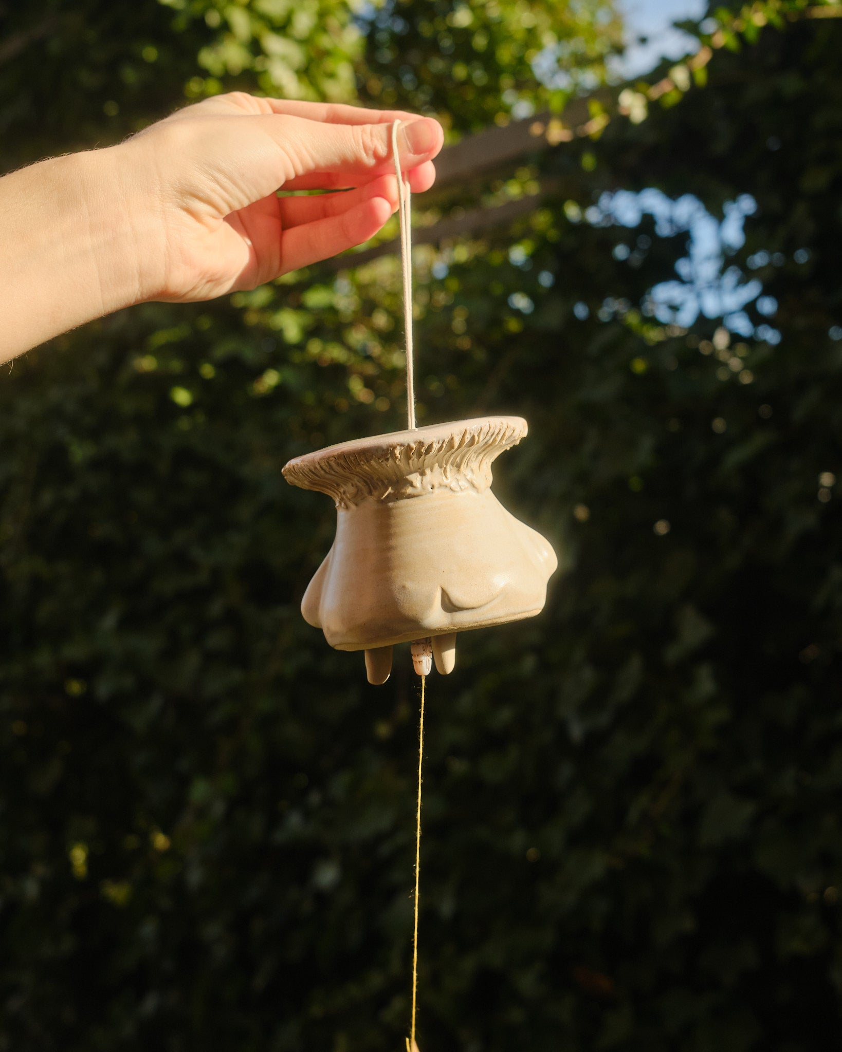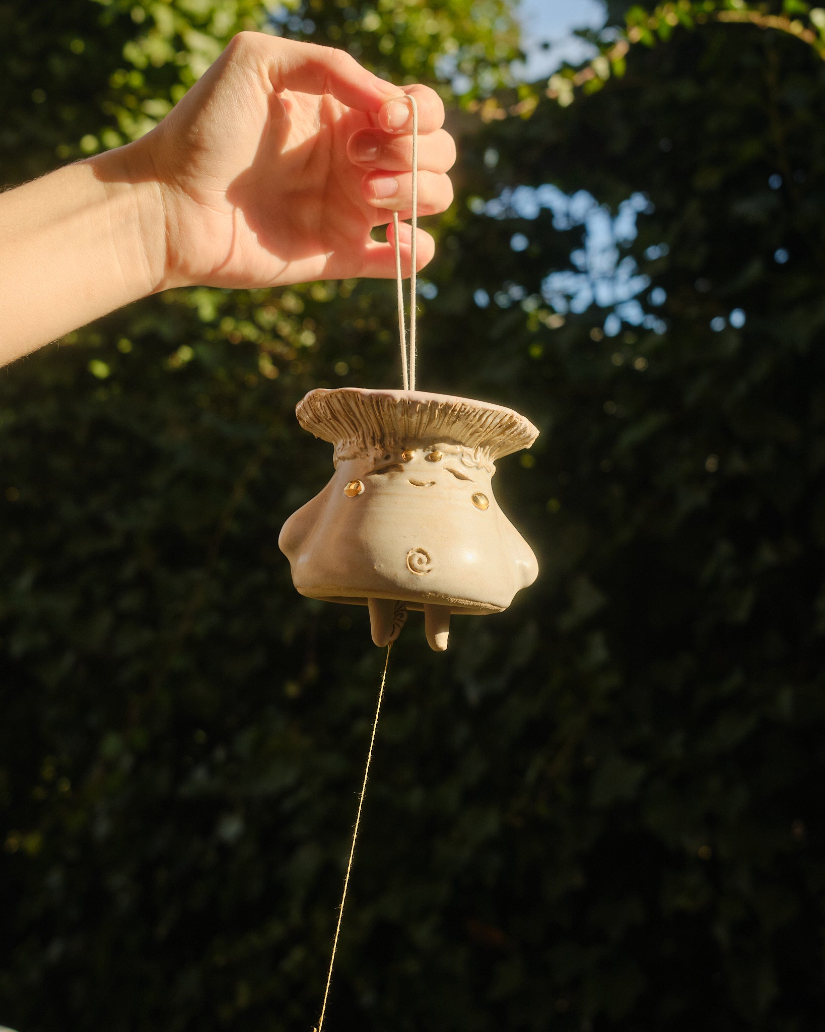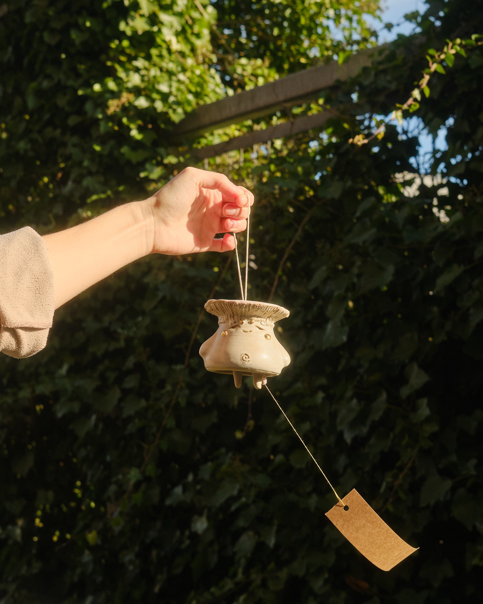 Hand sculpted stoneware wind chime embellished in 24k gold lustre details. The paper catches the wind, creating a gentle soothing bell sound. Handle with care.