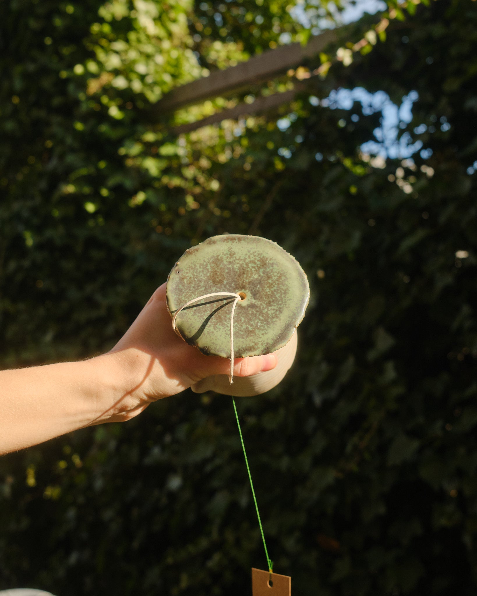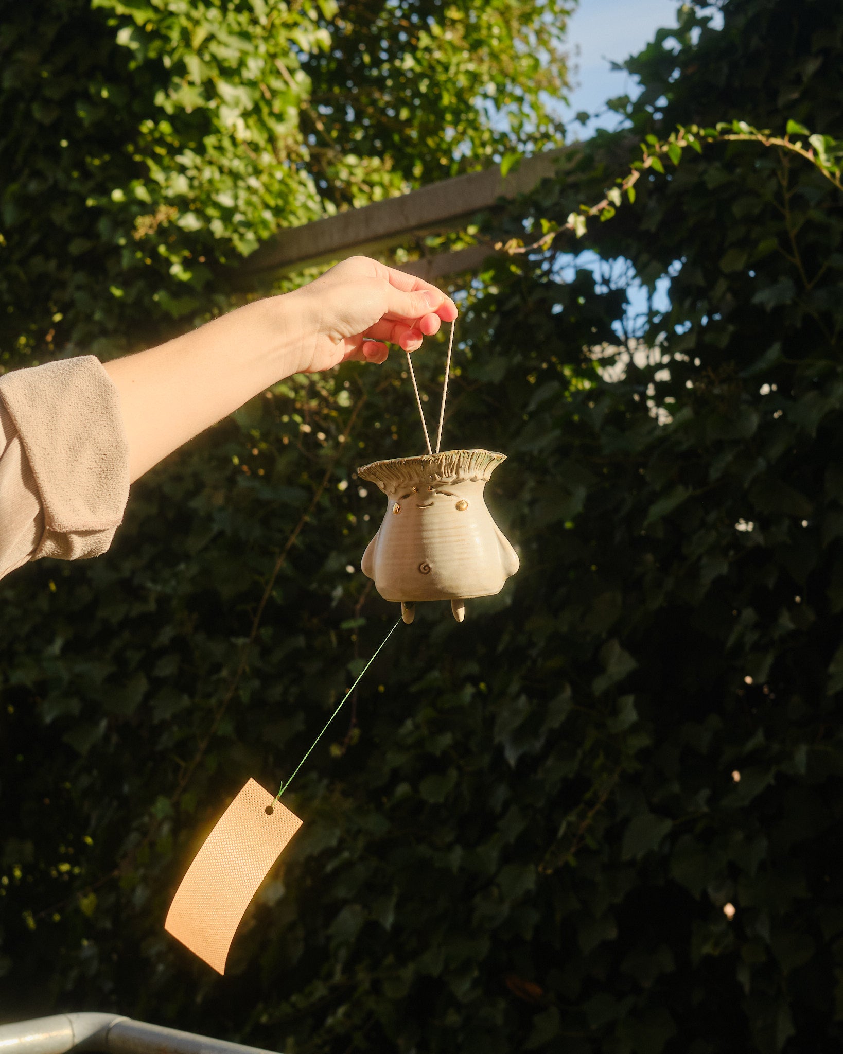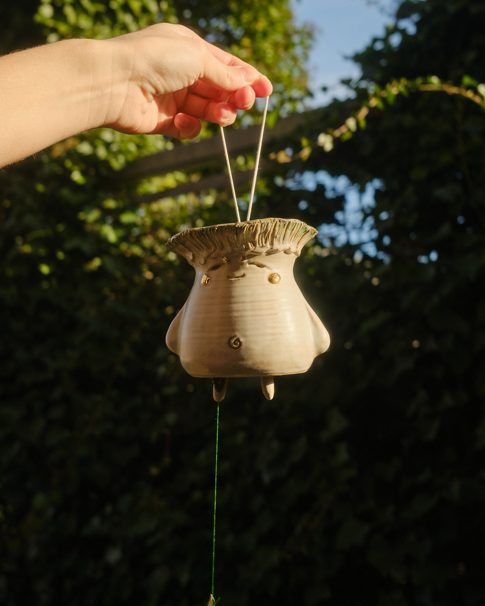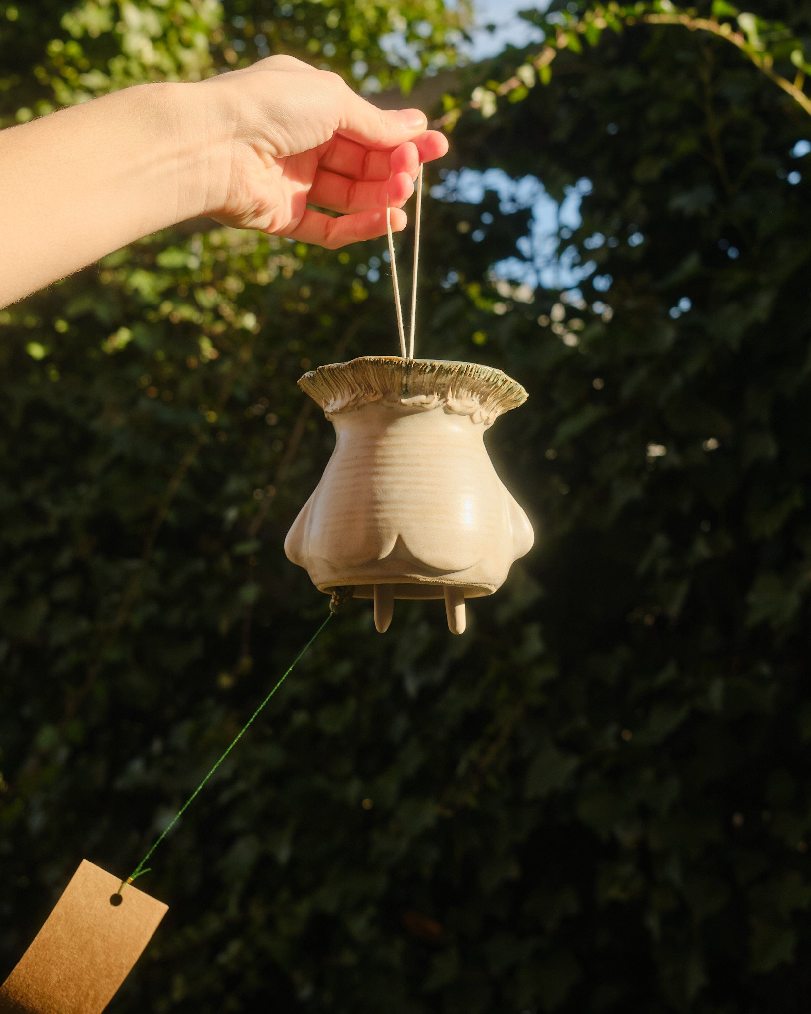 Hand sculpted stoneware wind chime embellished in 24k gold lustre details. The paper catches the wind, creating a gentle soothing bell sound. Handle with care.