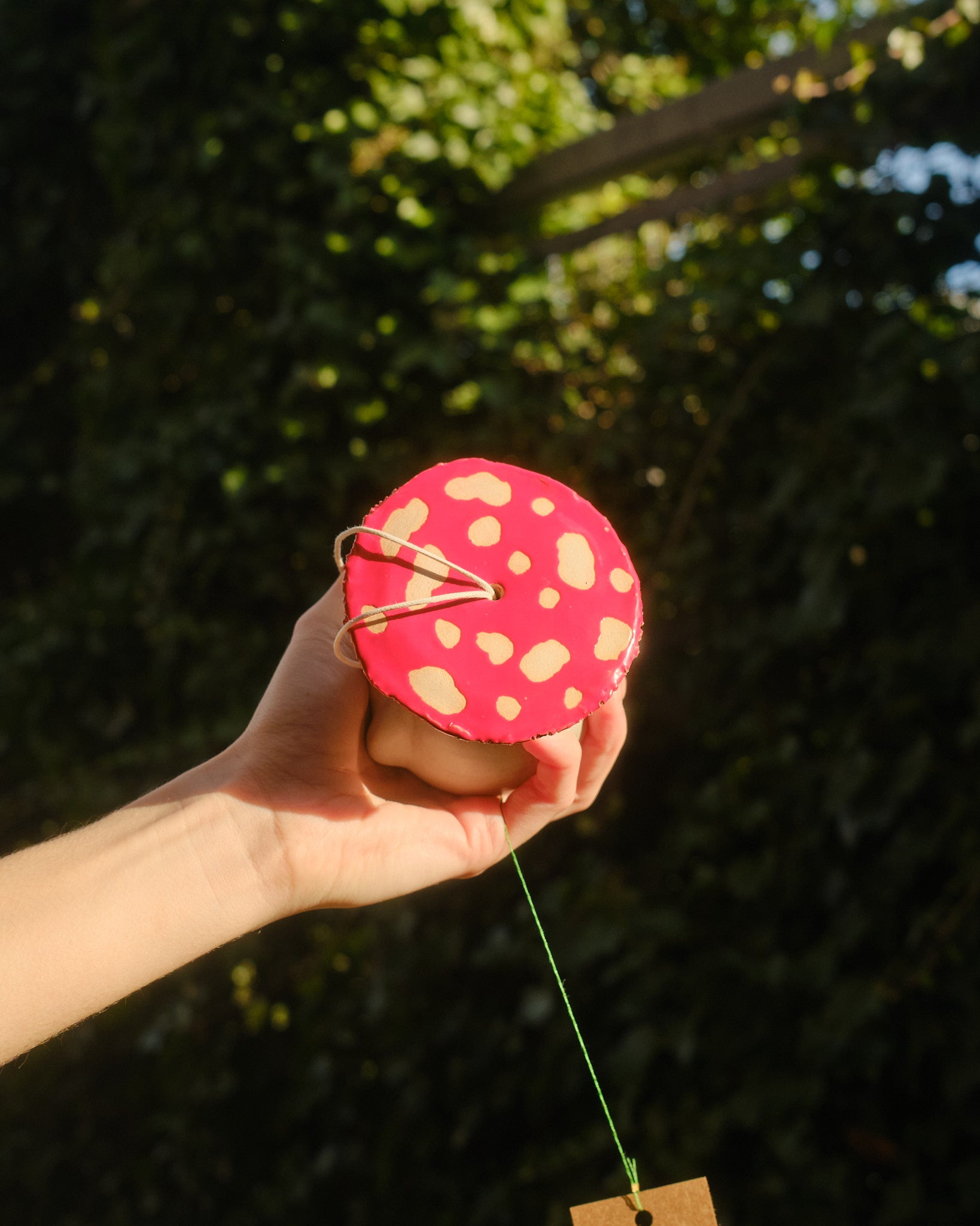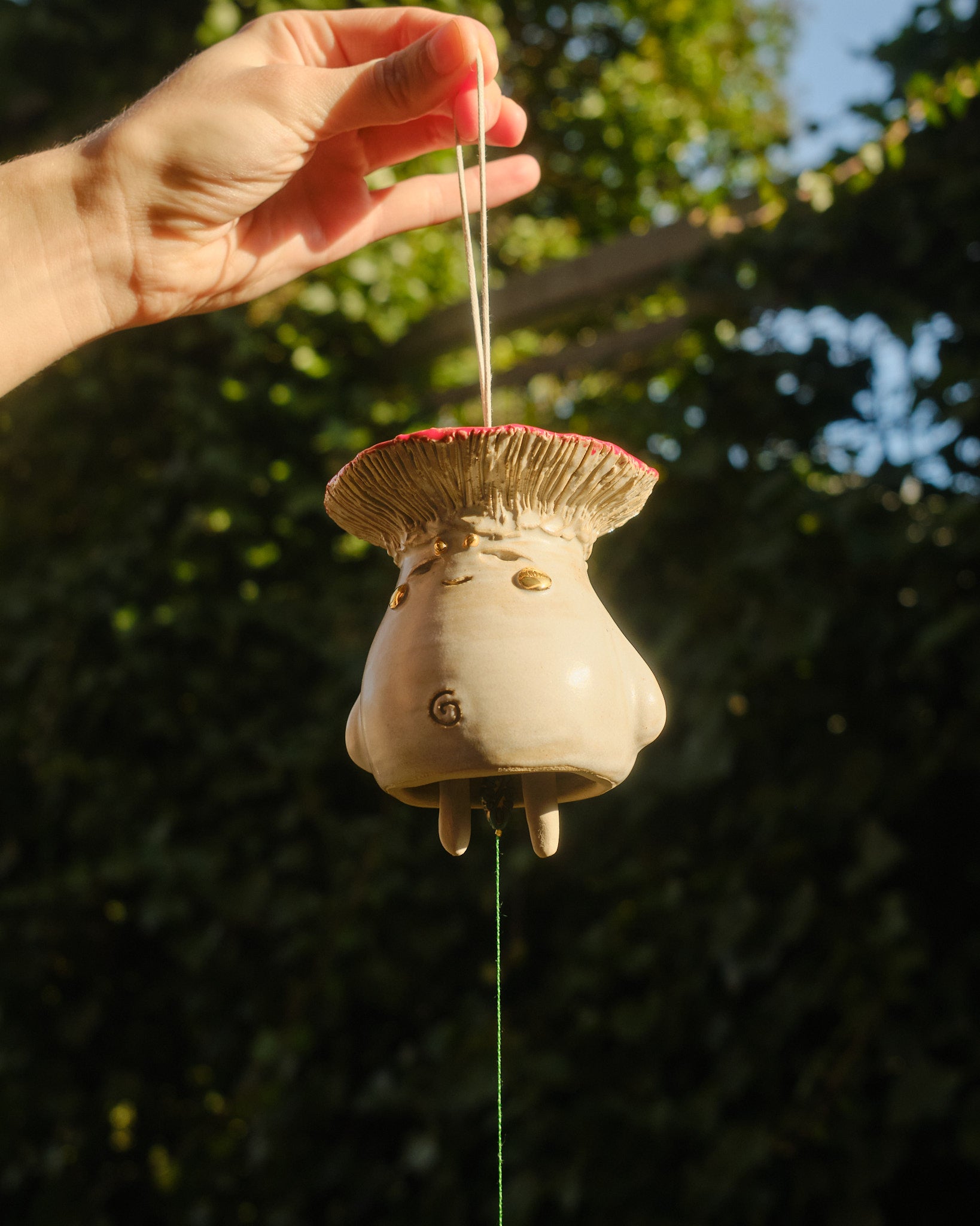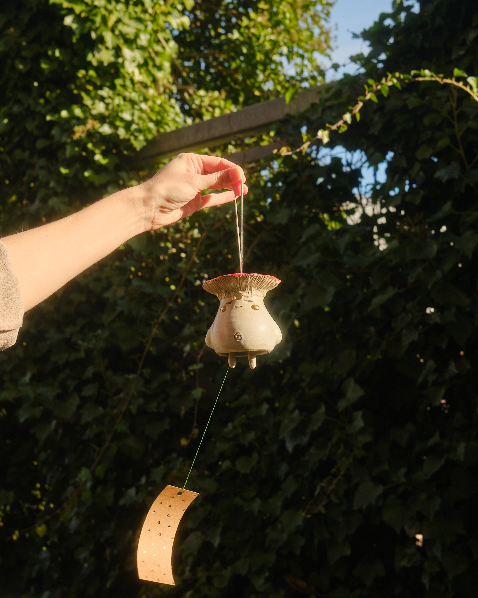 Hand sculpted stoneware wind chime embellished in 24k gold lustre details. The paper catches the wind, creating a gentle soothing bell sound. Handle with care.