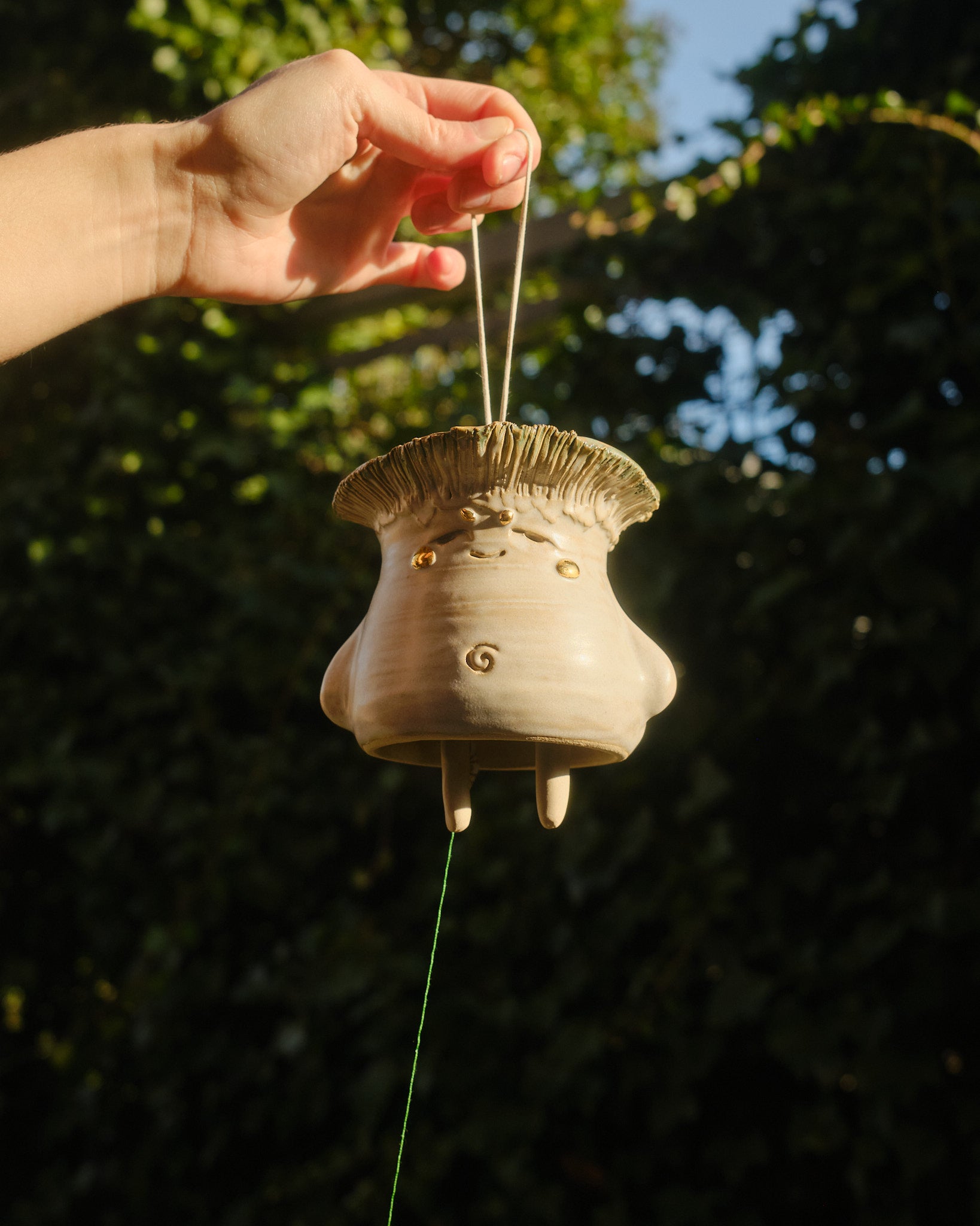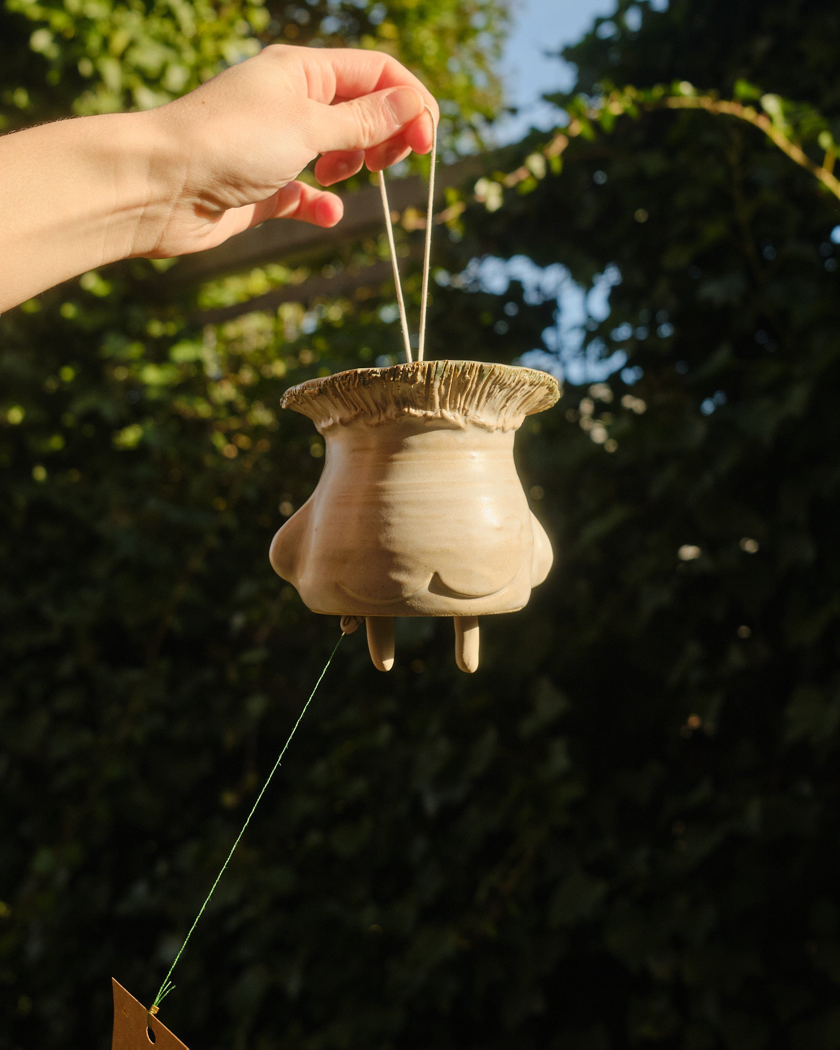 Hand sculpted stoneware wind chime embellished in 24k gold lustre details. The paper catches the wind, creating a gentle soothing bell sound. Handle with care.
