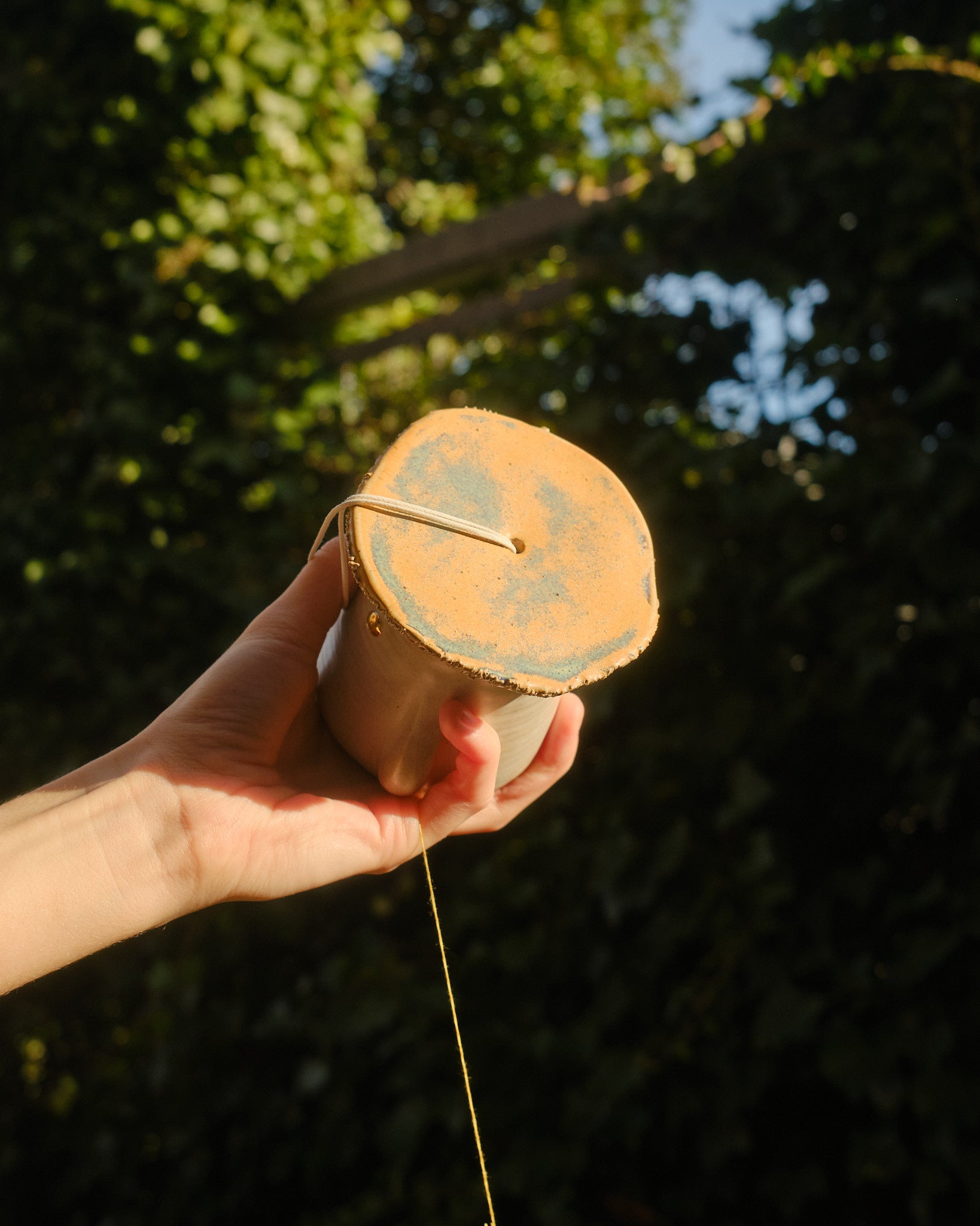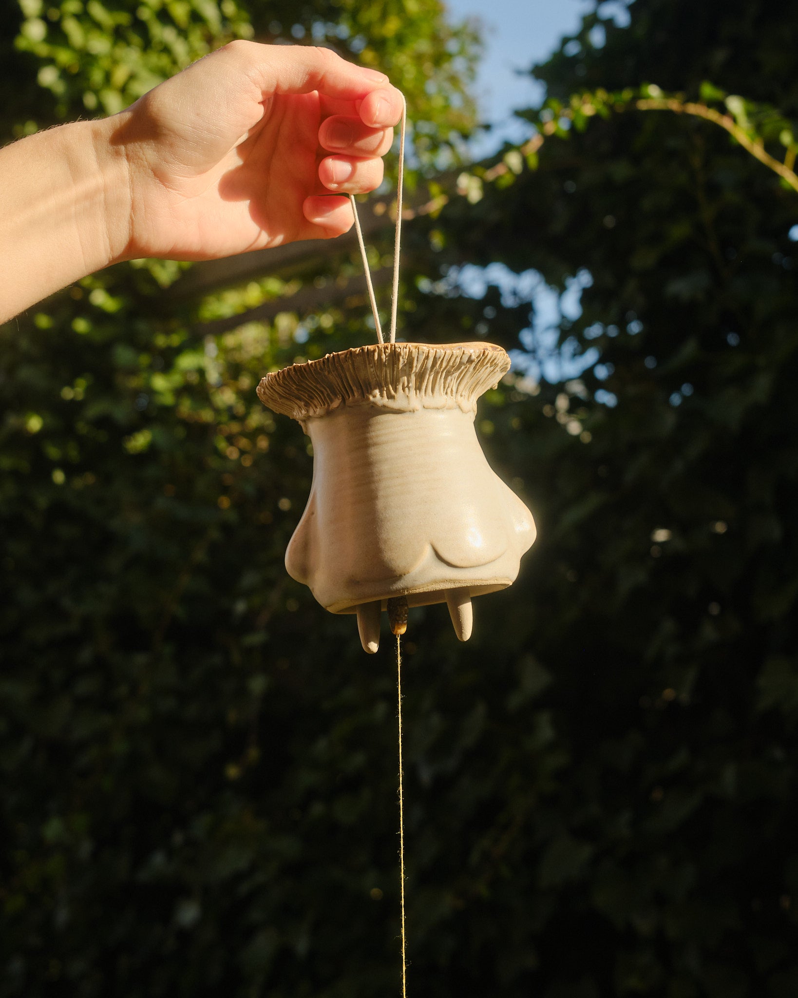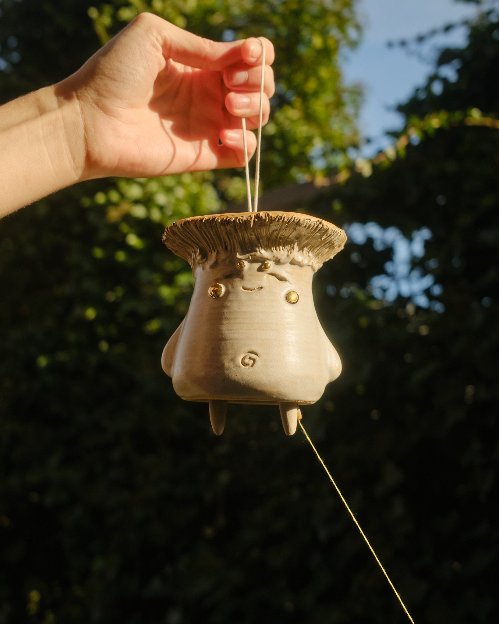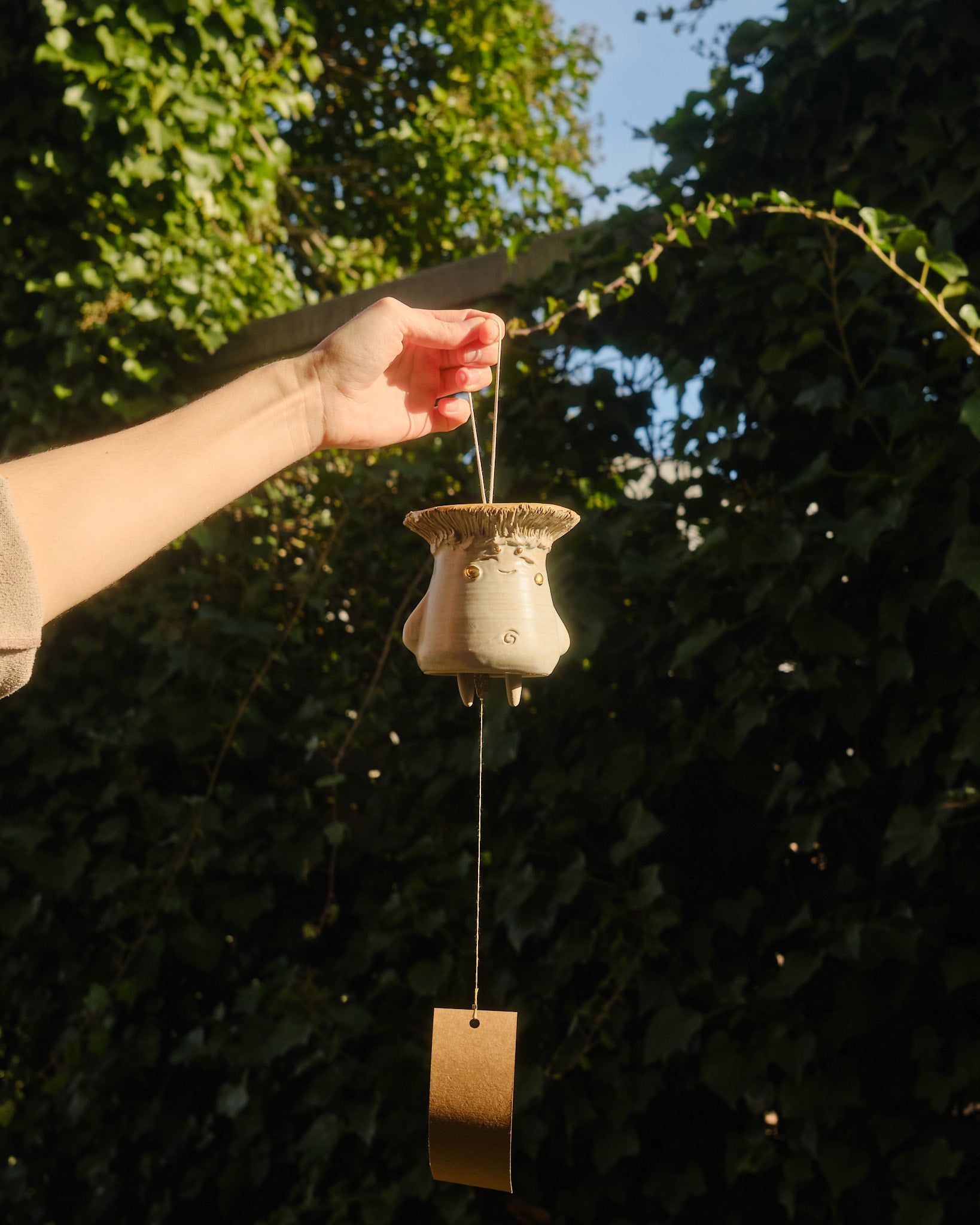 Hand sculpted stoneware wind chime embellished in 24k gold lustre details. The paper catches the wind, creating a gentle soothing bell sound. Handle with care.