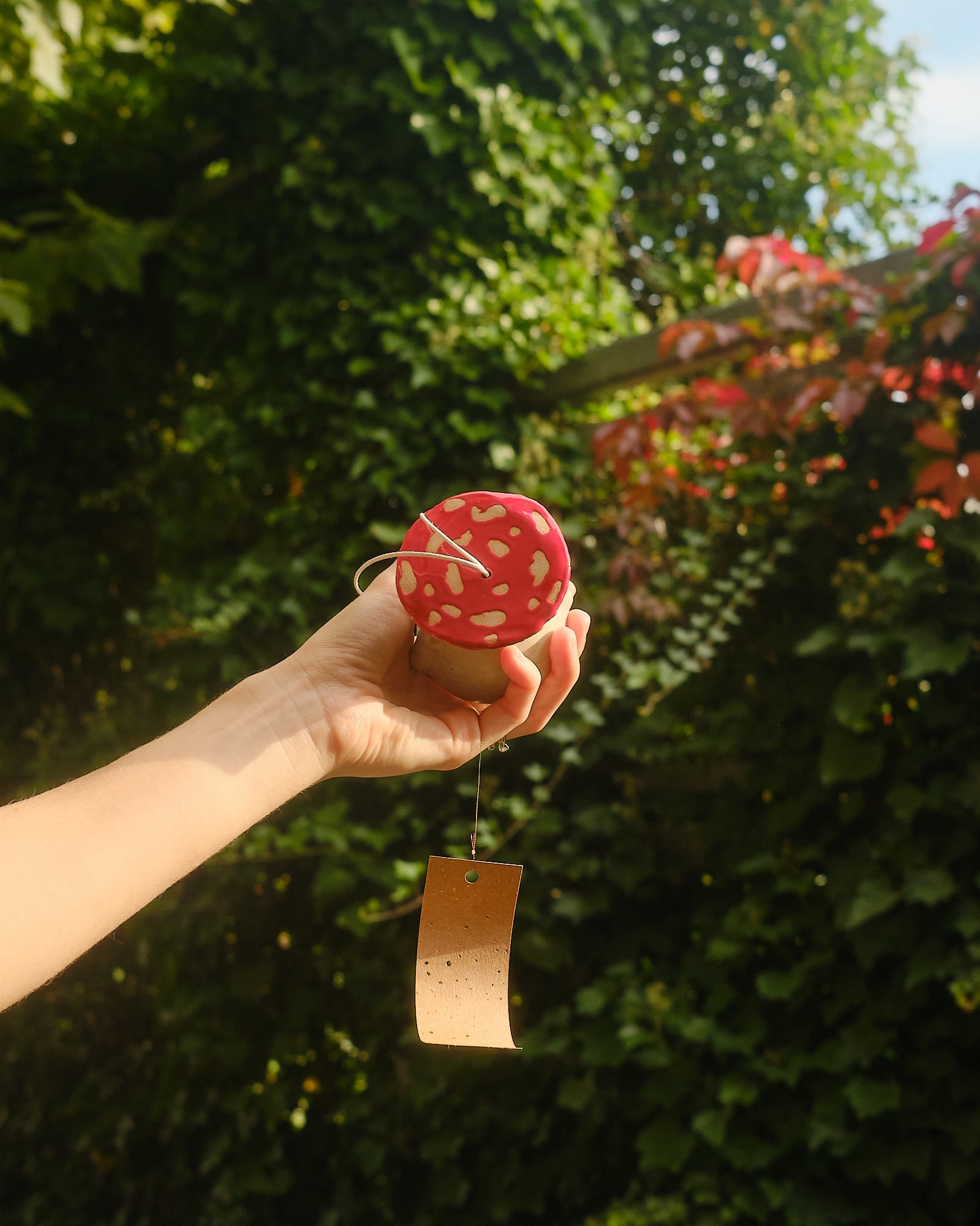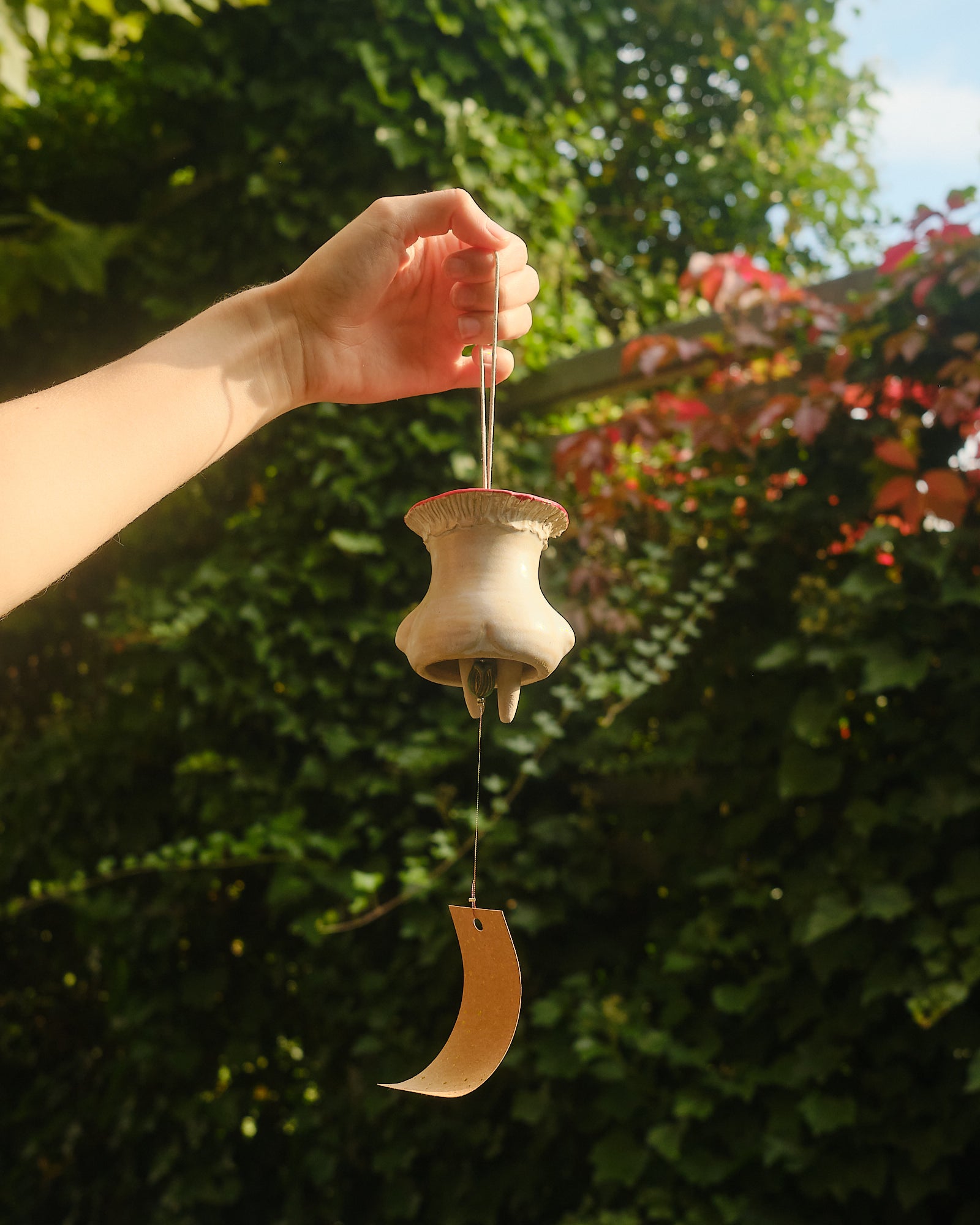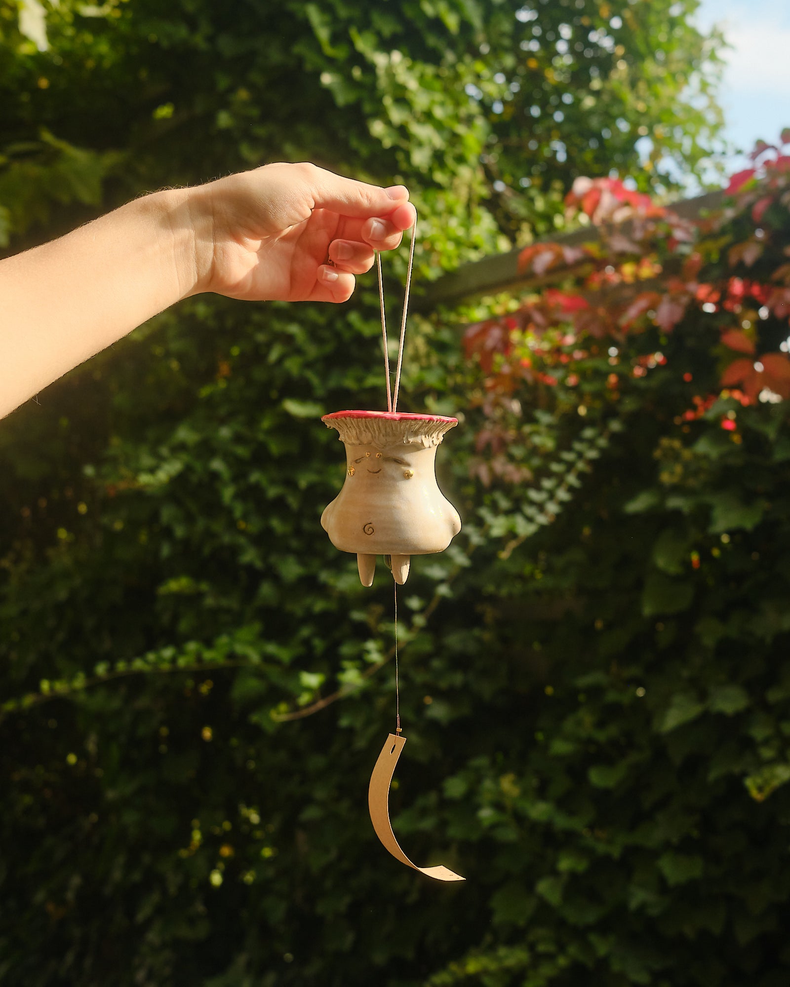 Hand sculpted stoneware wind chime embellished in 24k gold lustre details. The paper catches the wind, creating a gentle soothing bell sound. Handle with care.