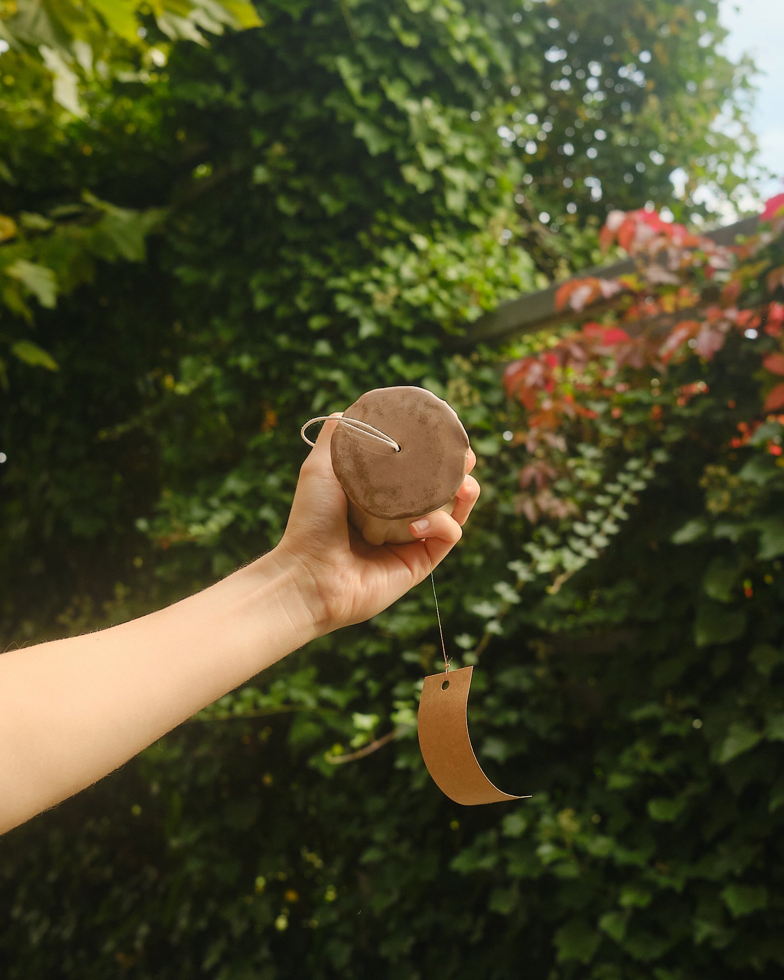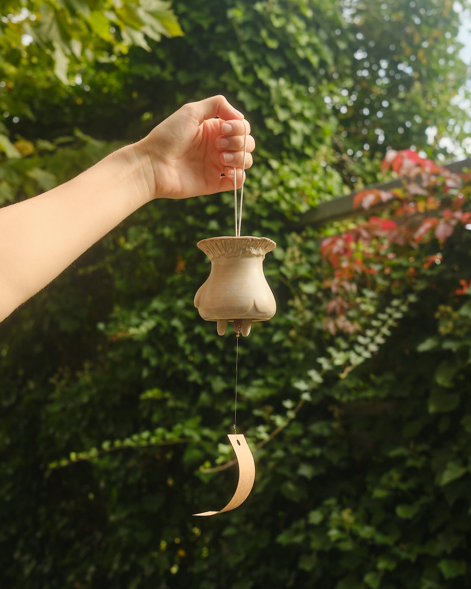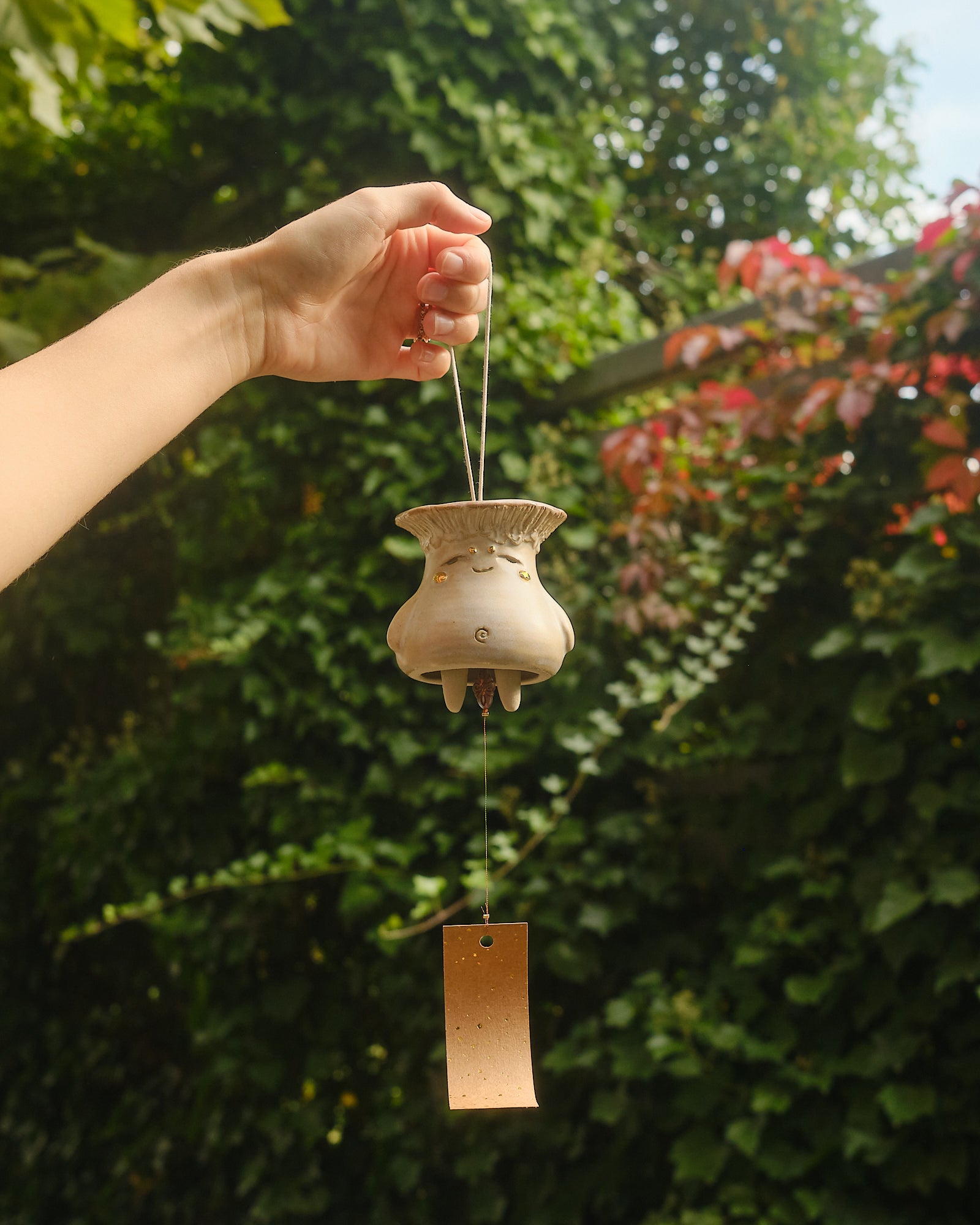 Hand sculpted stoneware wind chime embellished in 24k gold lustre details. The paper catches the wind, creating a gentle soothing bell sound. Handle with care.