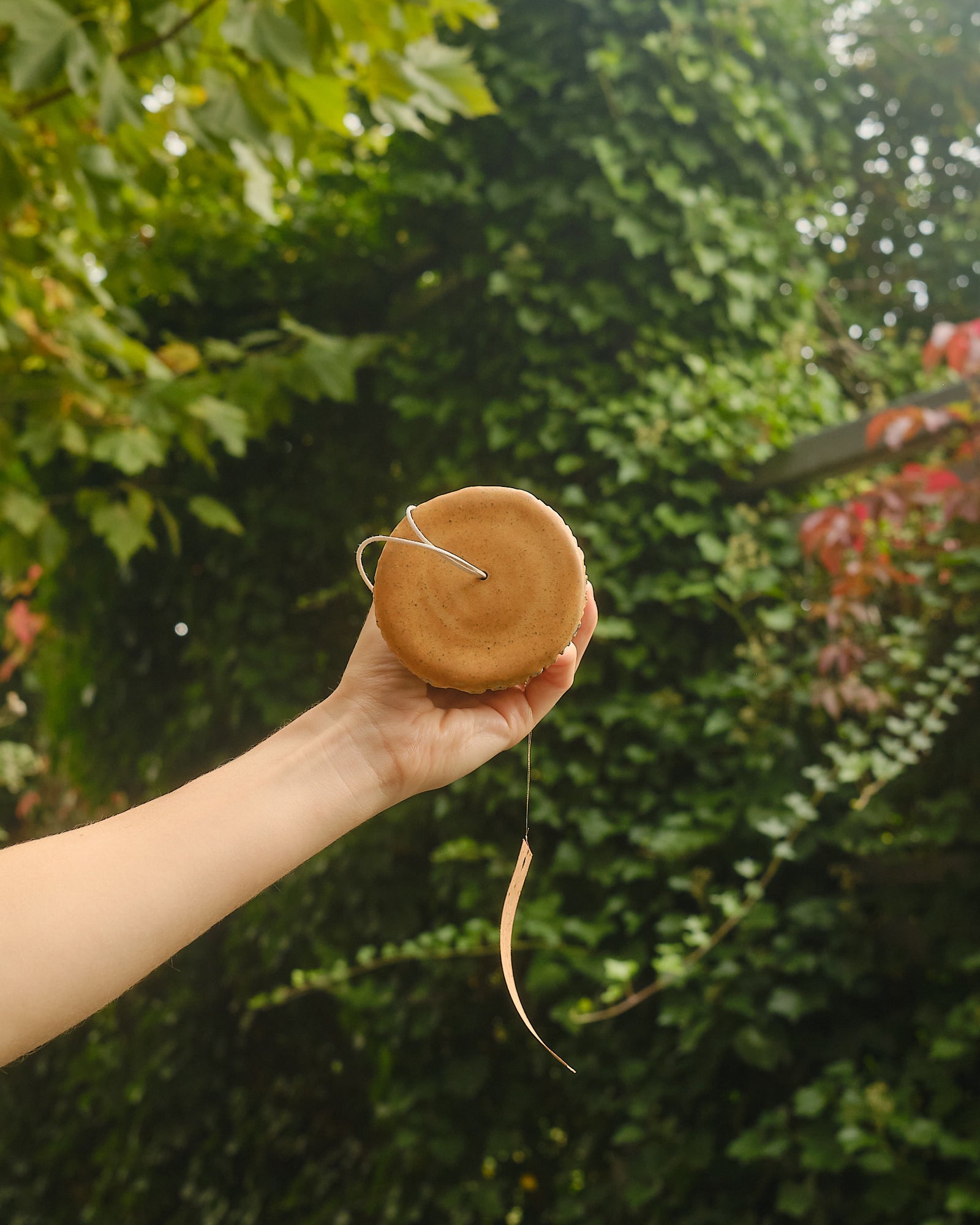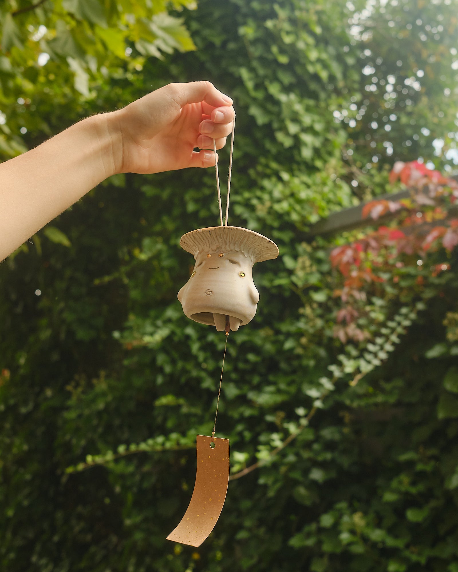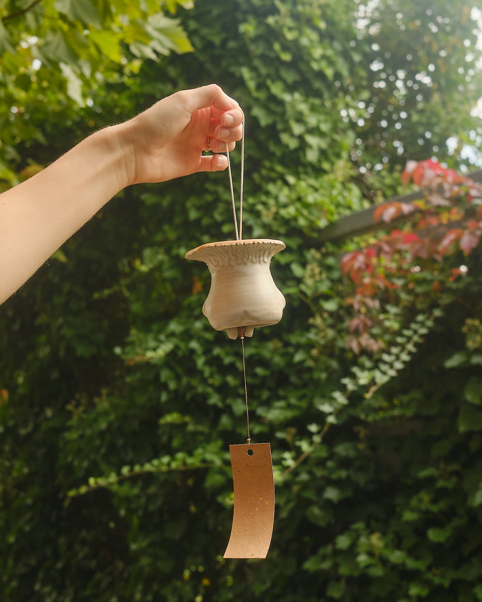 Hand sculpted stoneware wind chime embellished in 24k gold lustre details. The paper catches the wind, creating a gentle soothing bell sound. Handle with care.
