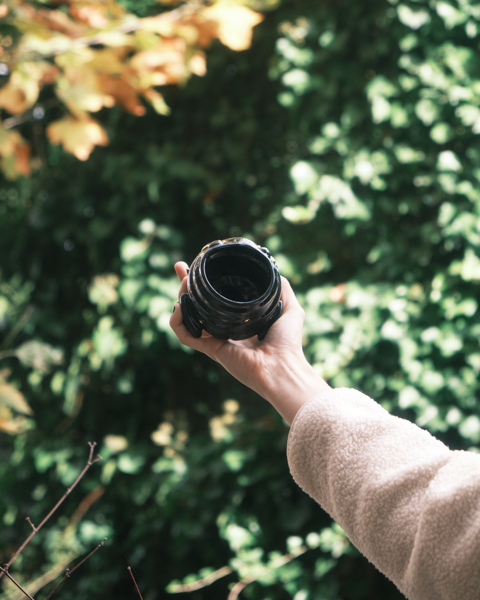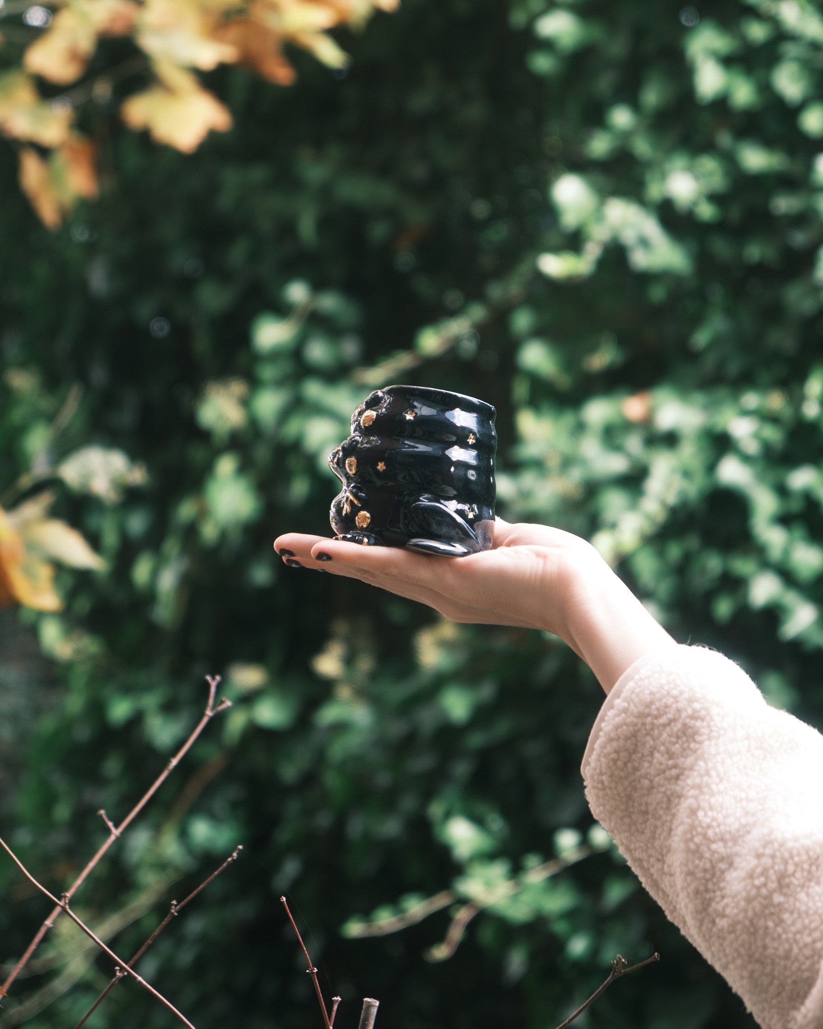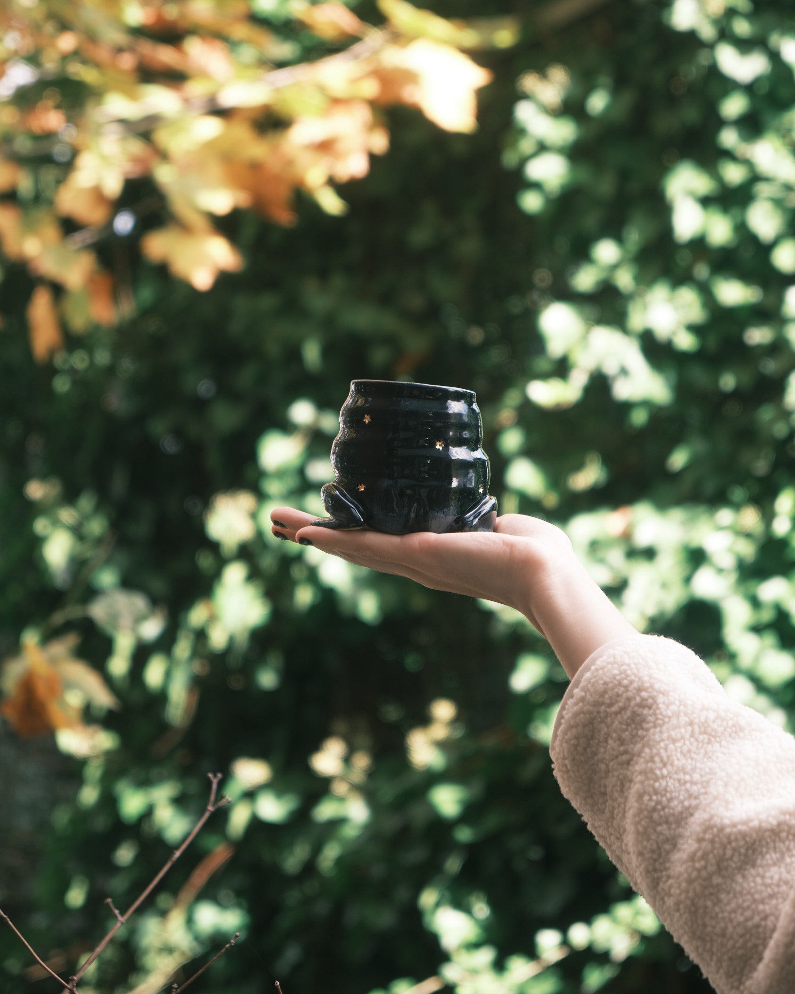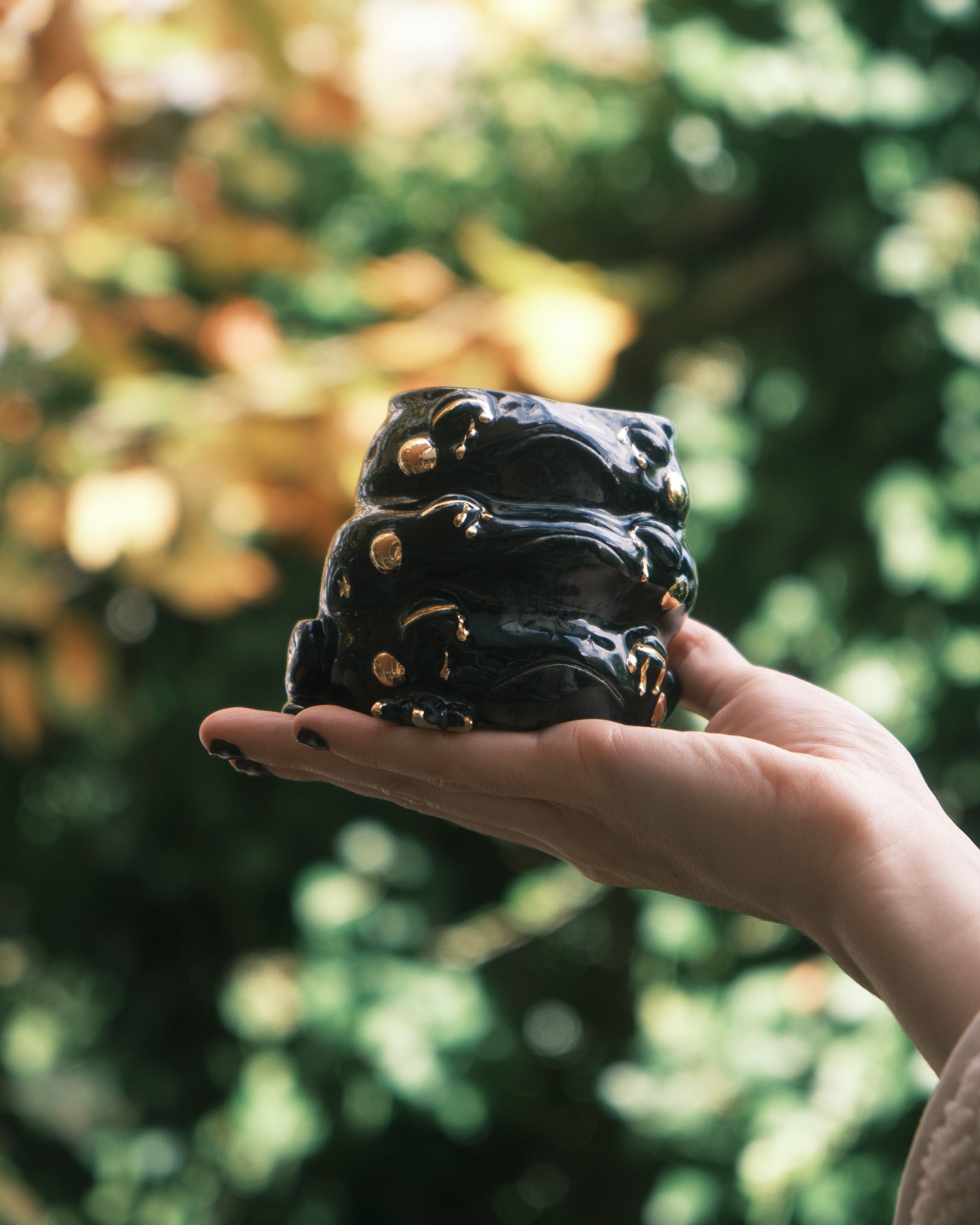 Ribbit! Triple ribbit! This magical hopper comes with three heads and is hand sculpted out of stoneware clay. Finished in a black glaze with shiny 24k gold lustre starry details.