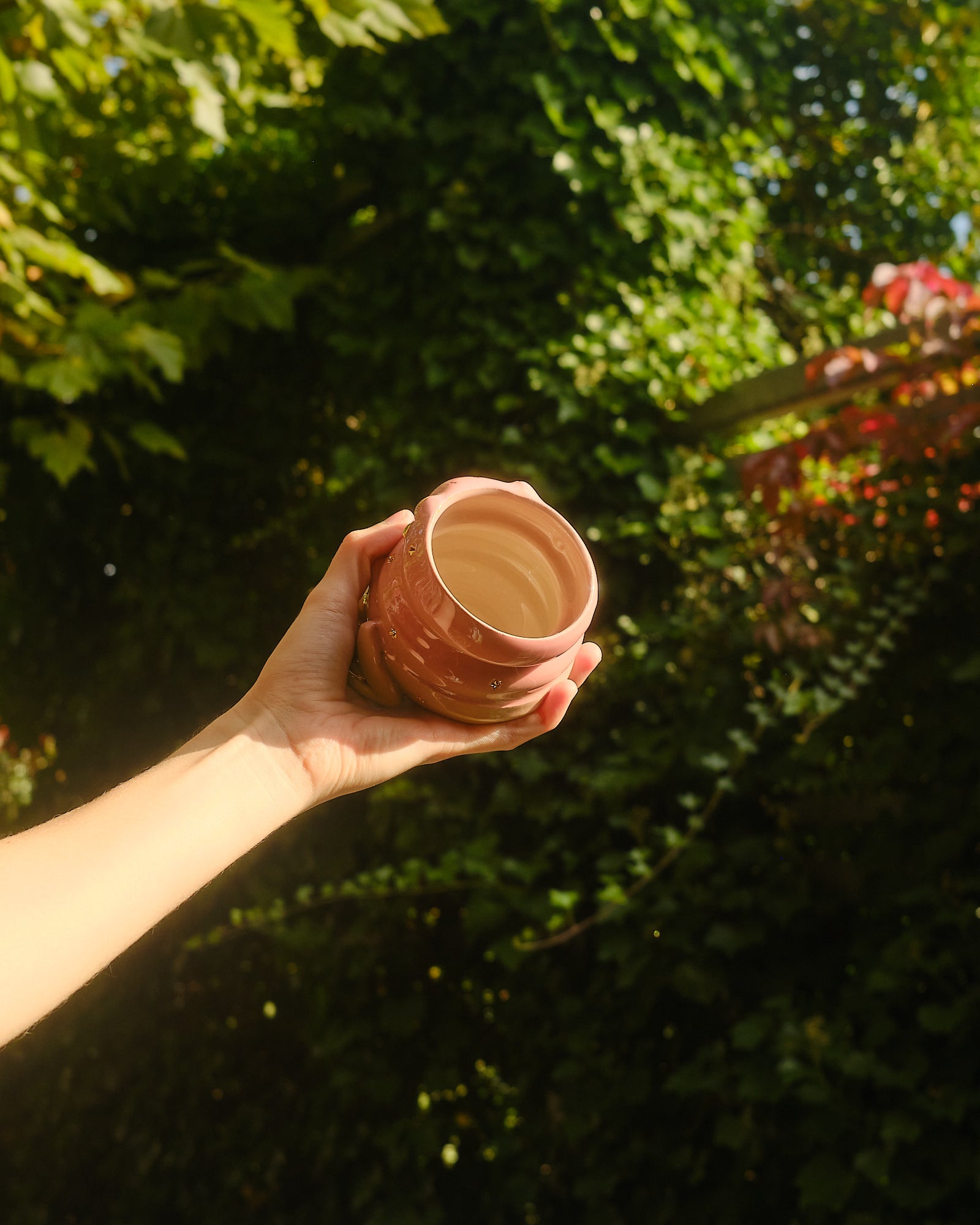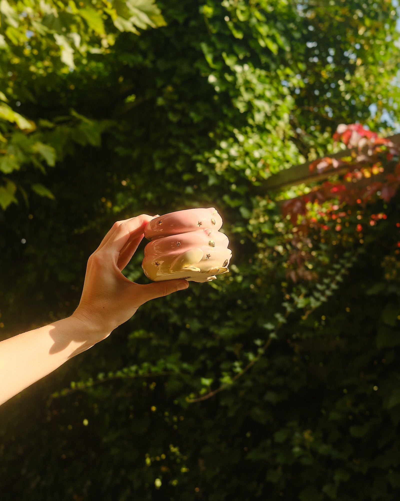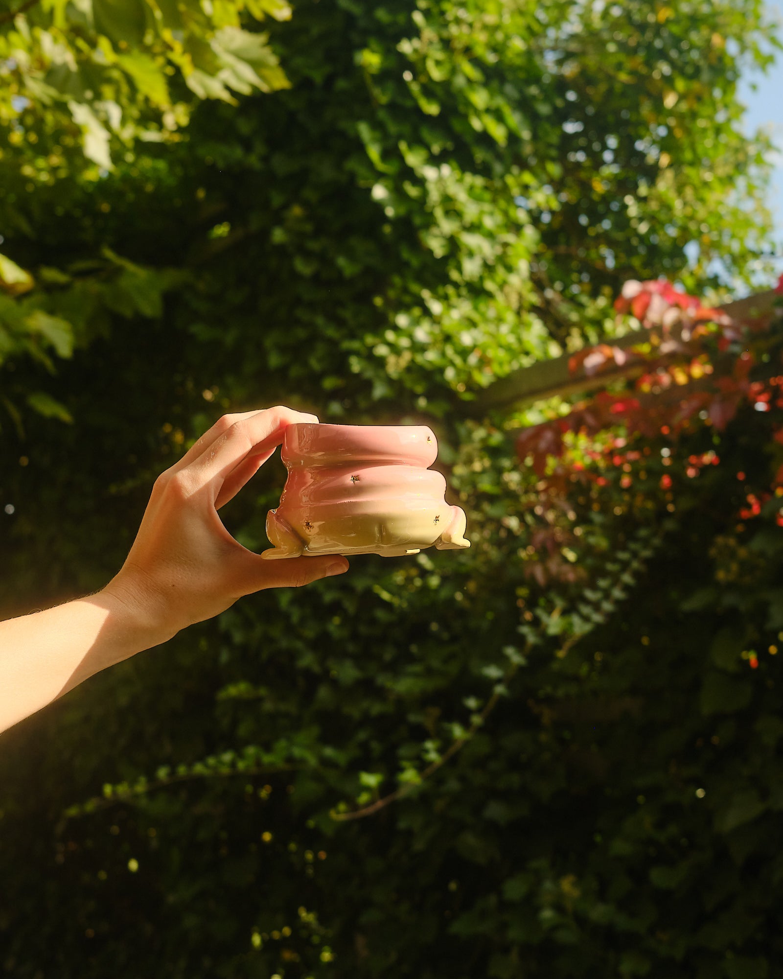 Ribbit! Triple ribbit! This magical hopper comes with three heads and is hand sculpted out of stoneware clay. Finished in a gradient glaze with shiny 24k gold lustre starry details.