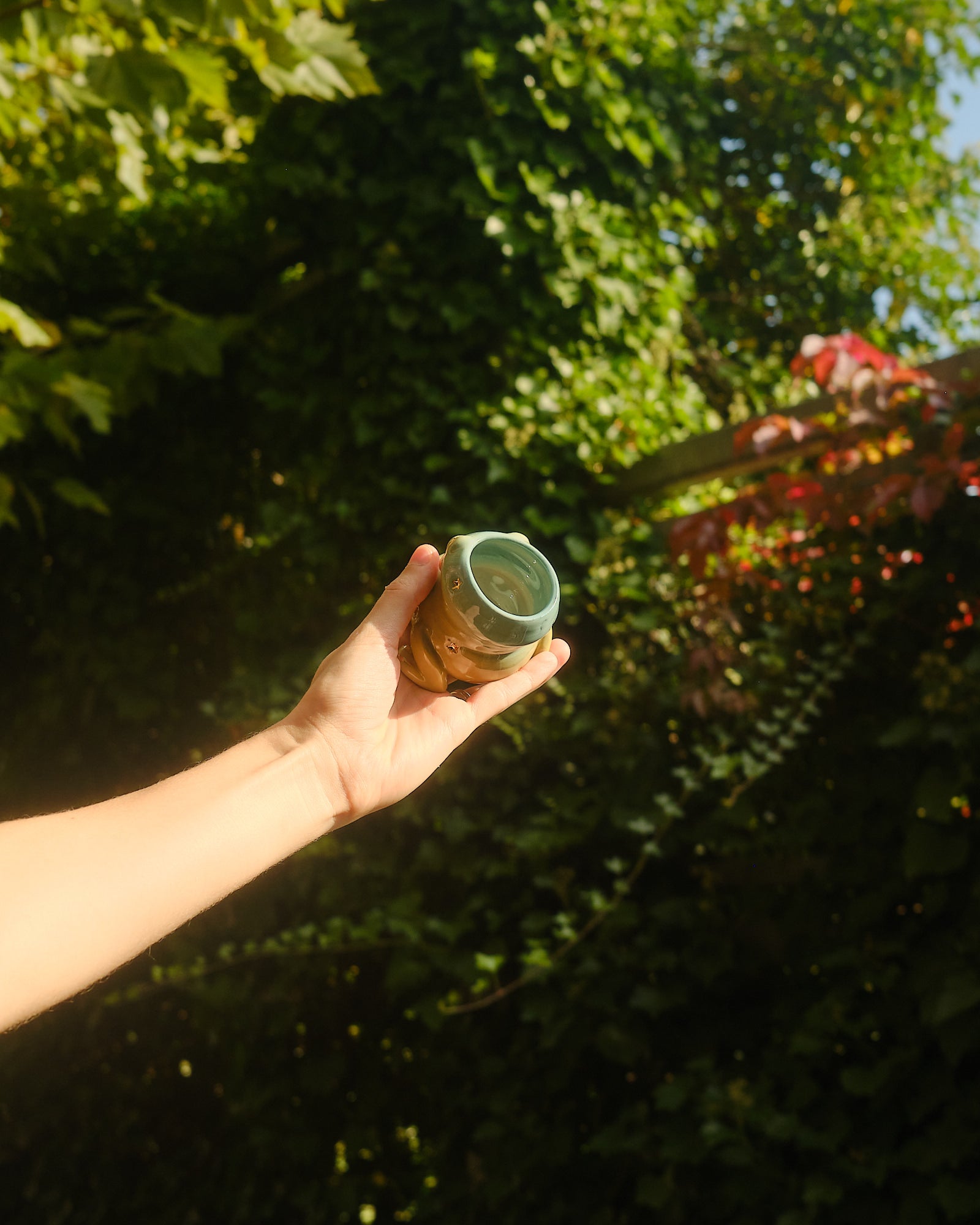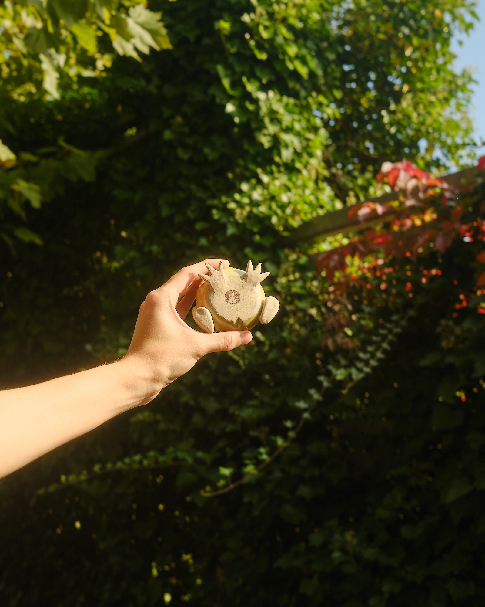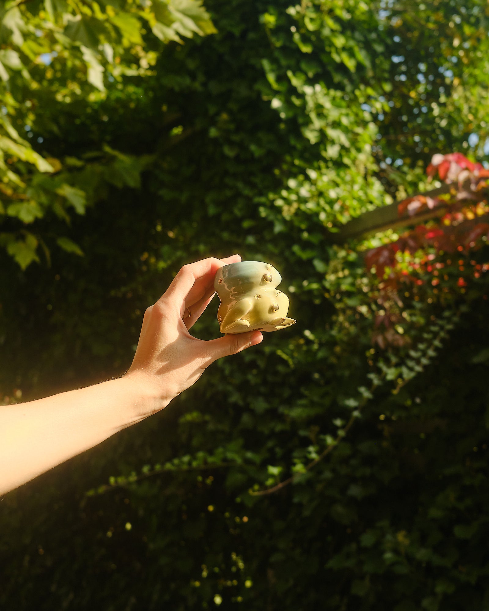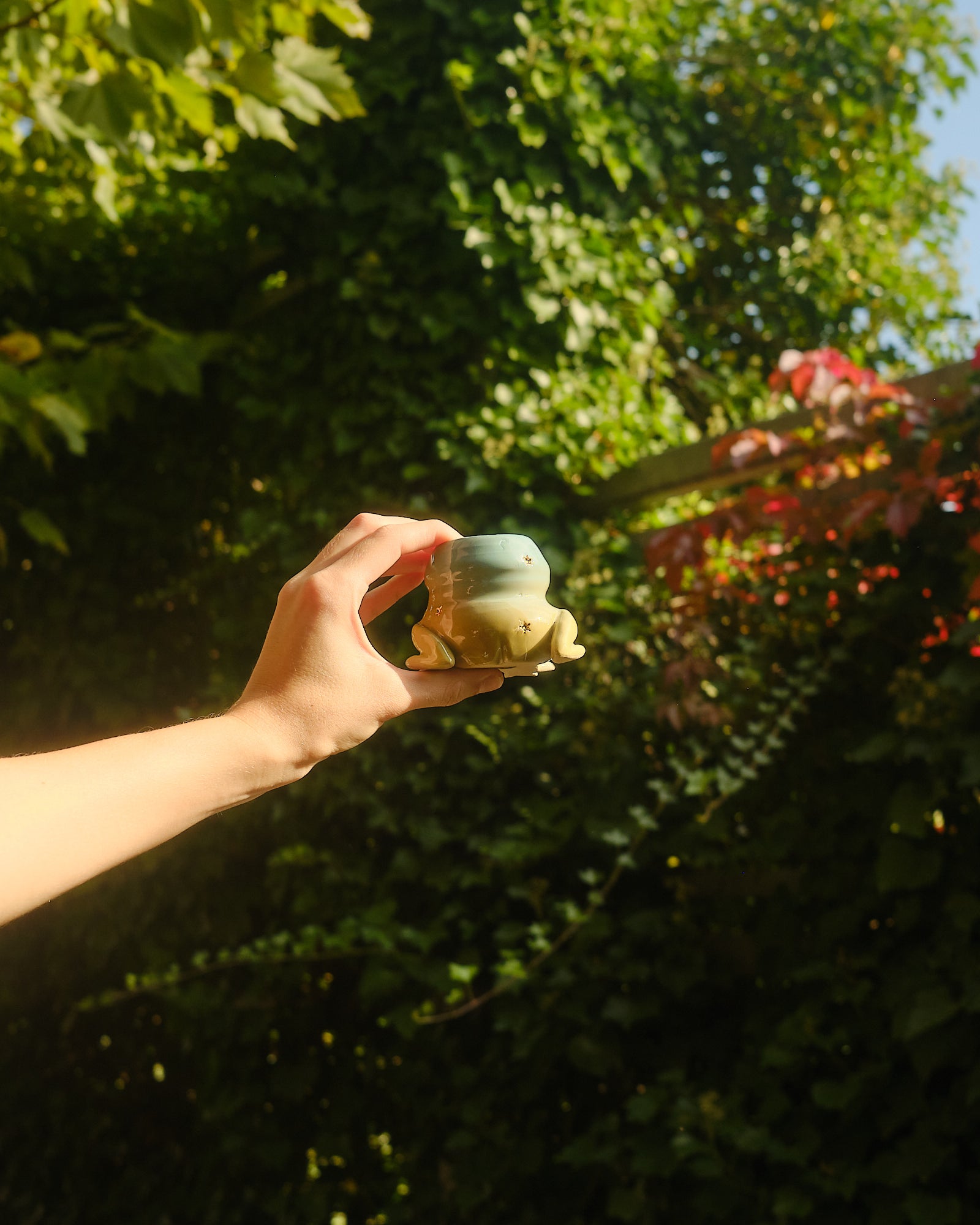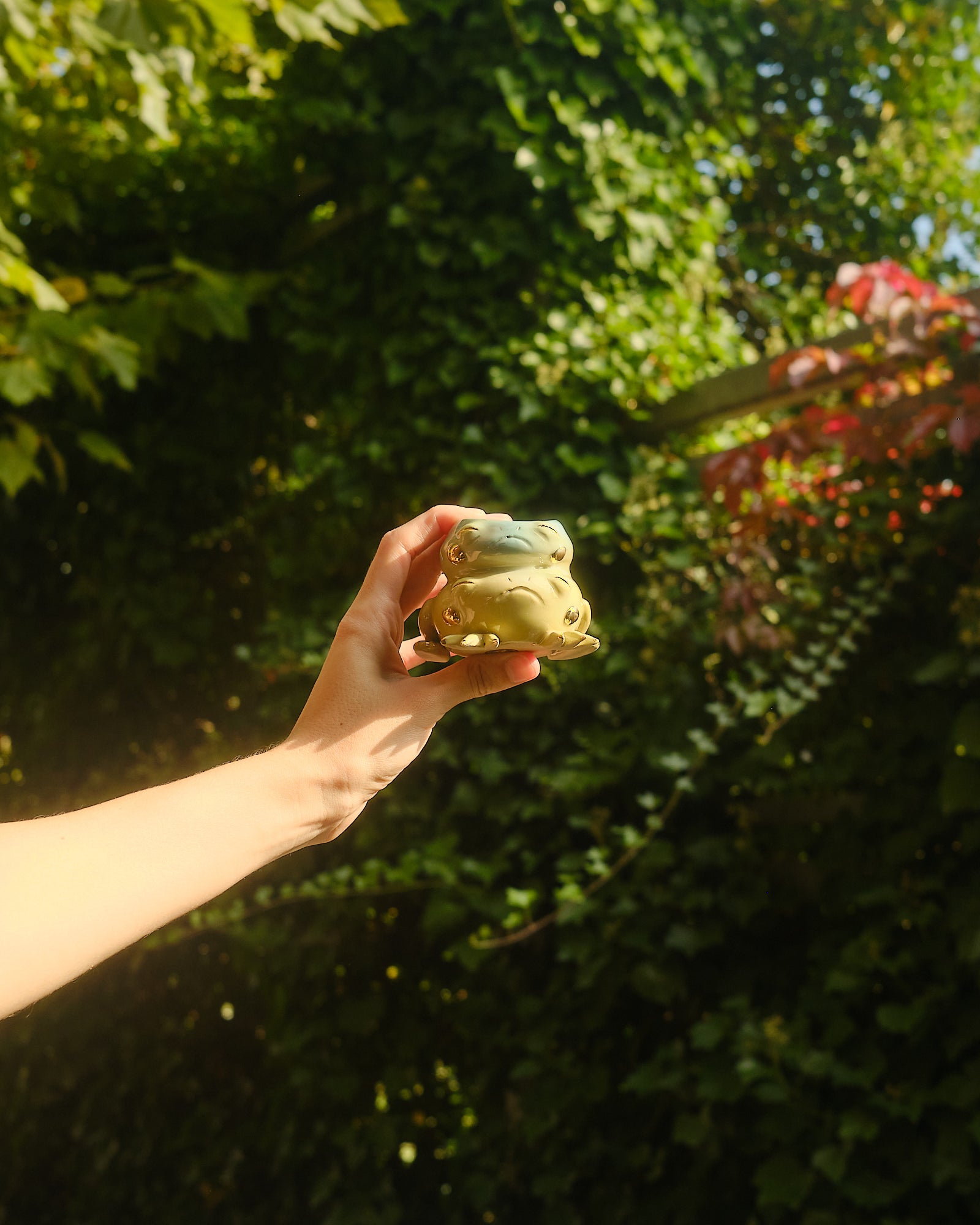 Ribbit! Double ribbit! This magical hopper comes with two heads and is hand sculpted out of stoneware clay. Finished in a gradient glaze with shiny 24k gold lustre starry details.