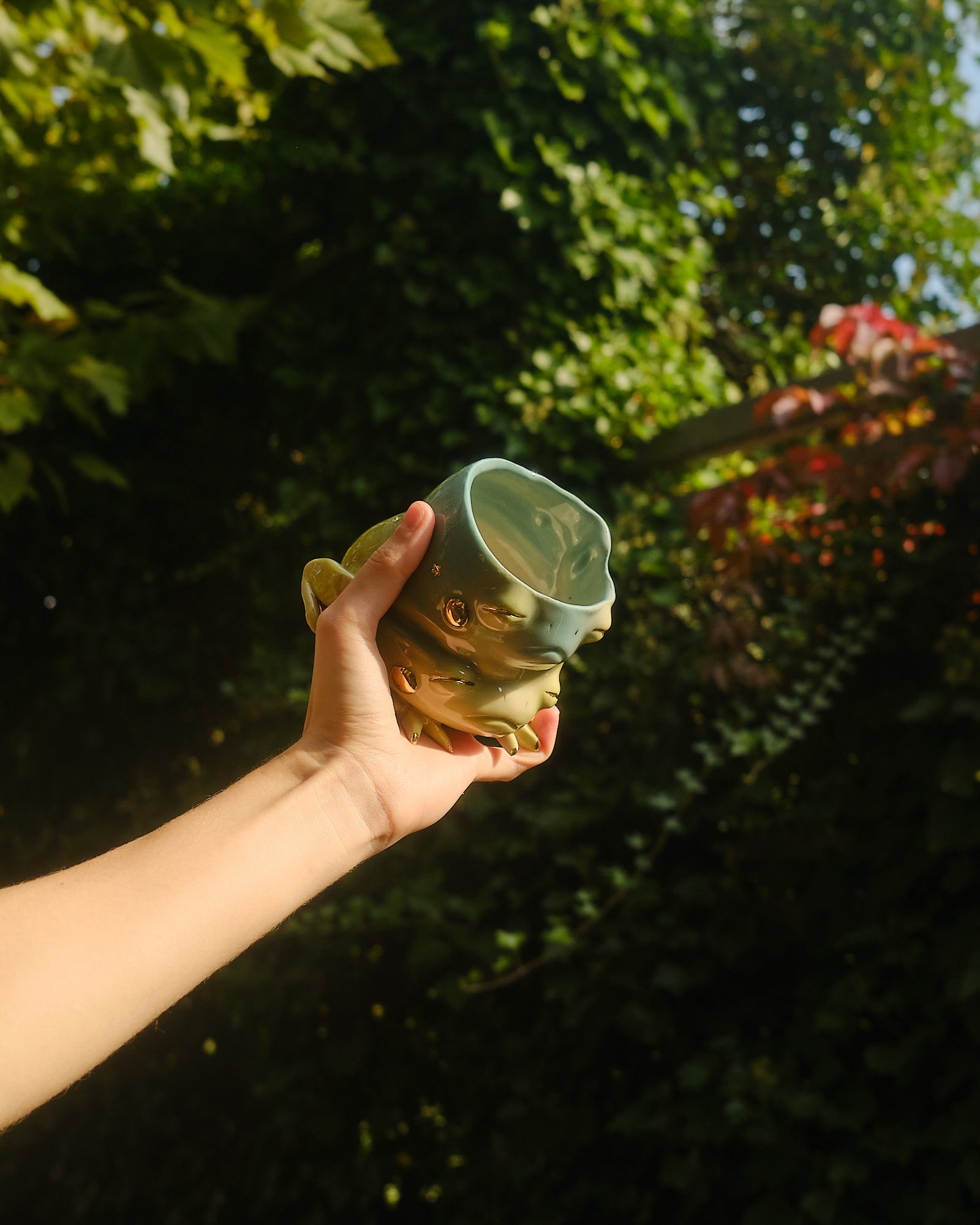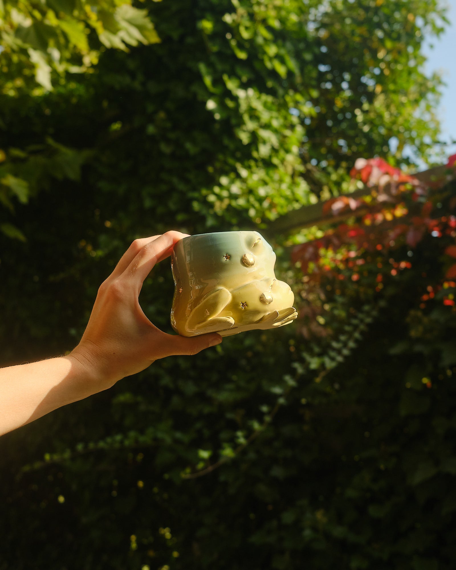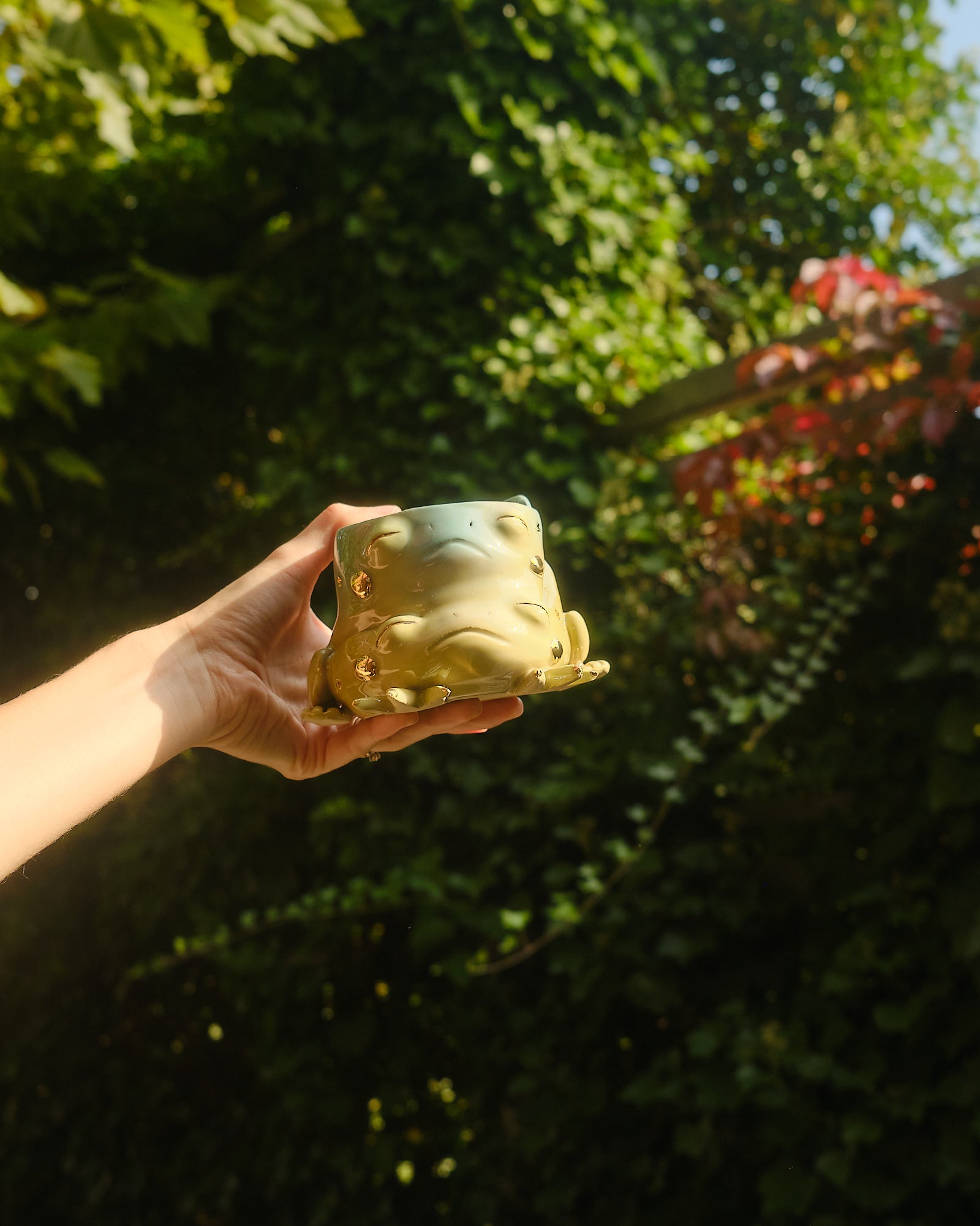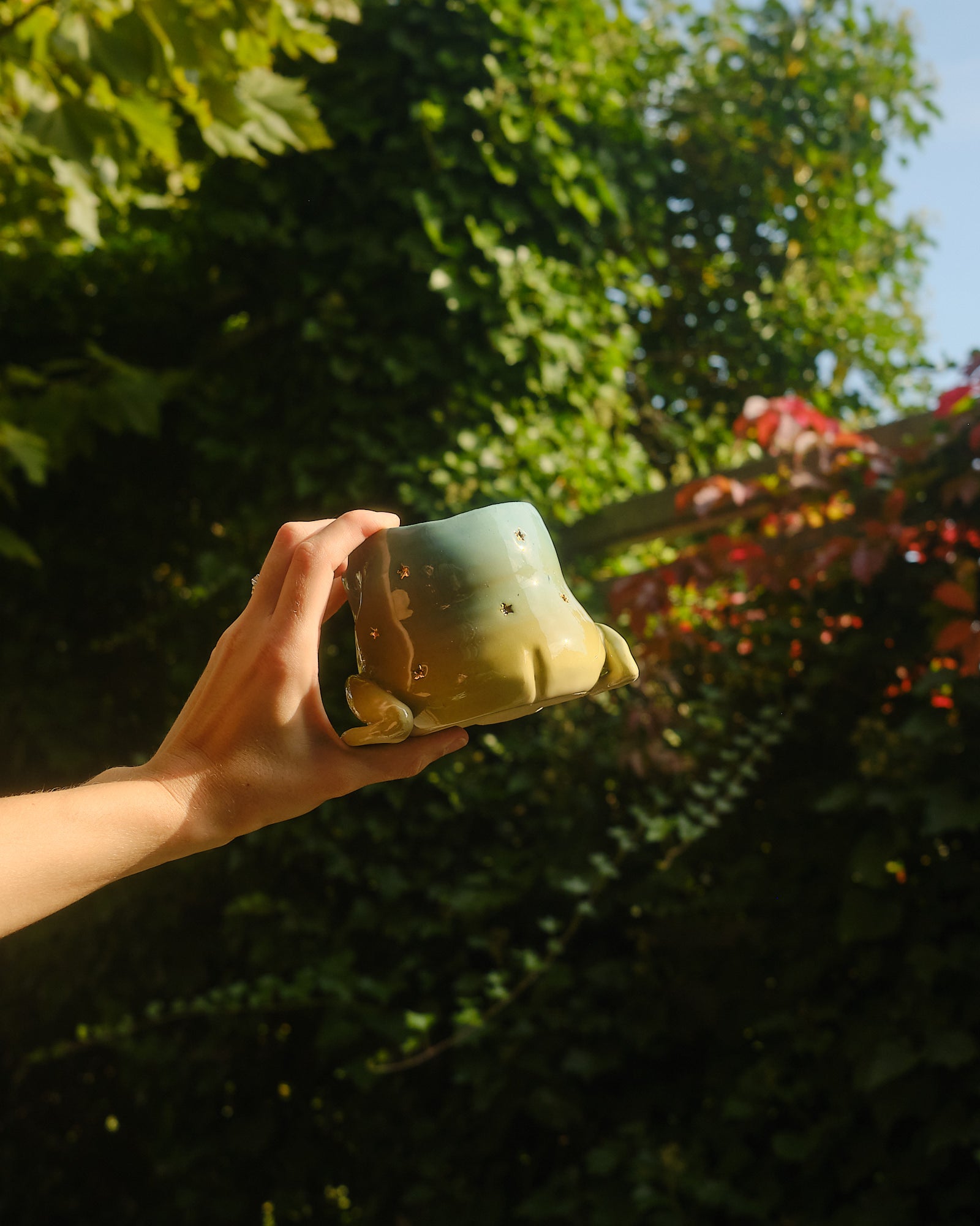 Ribbit! Double ribbit! This magical hopper comes with two heads and is hand sculpted out of stoneware clay. Finished in a gradient glaze with shiny 24k gold lustre starry details.